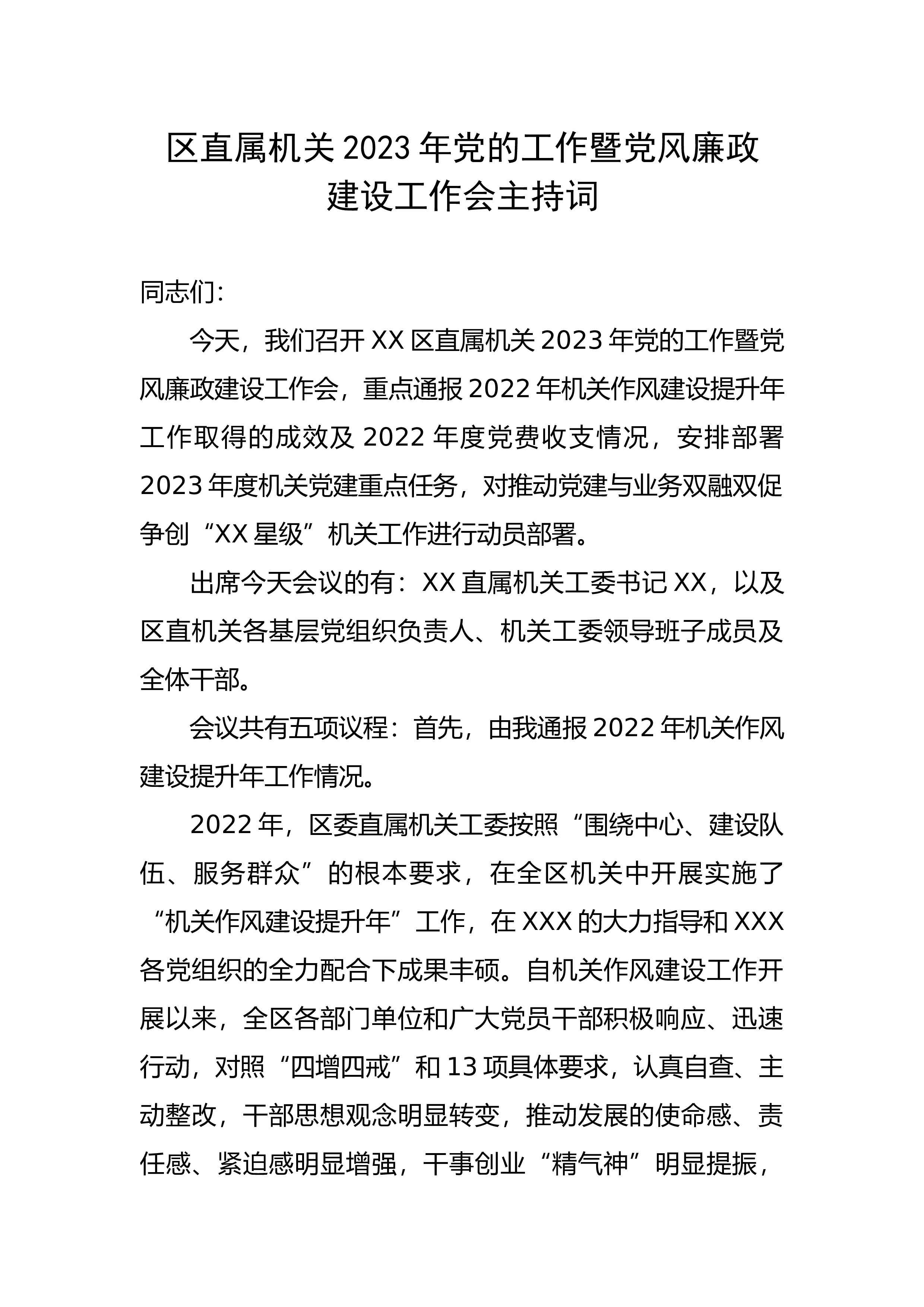 【主持词】区直属机关2023年党的工作暨党风廉政建设工作会主持词