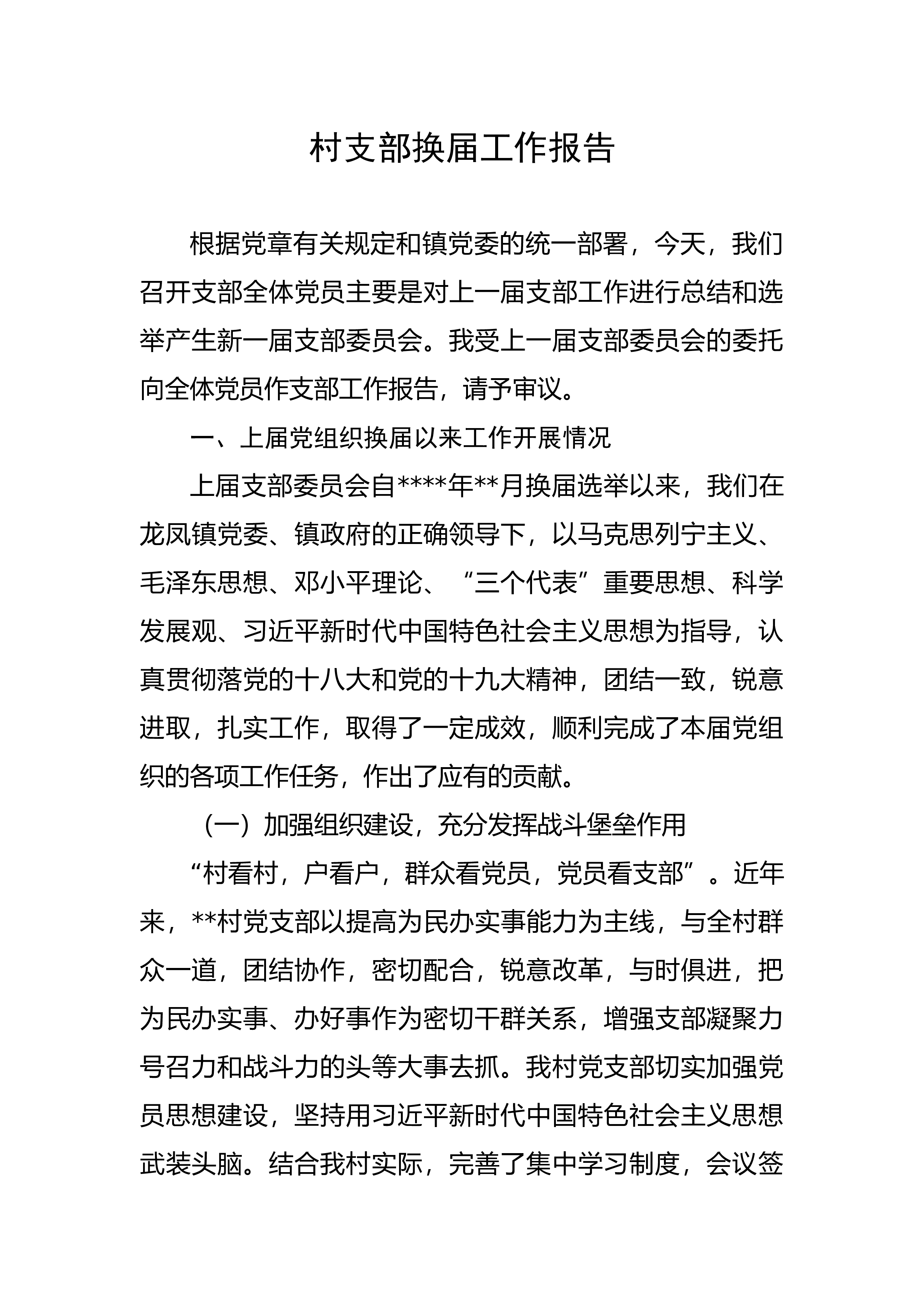 村支部换届工作报告根据党章有关规定和镇党委的统一部署,今天,我们召开支部全体党员主要是对上一届支部工作进行总结和选举产生新一届支部委员会。我受上一届支部委员会的委托向全体党员作支部工作报告,请予审议。一、上届党组织换届以来工作开展情况上届支部委员会自****年**月换届选举以来,我们在龙凤镇党委、镇政府的正确领导下,以马克思列宁主义、毛泽东思想、邓小平理论、“三个代表”重要思想、科学发展观、习近平新时代中国特色社会主义思想为指导,认真贯彻落党的十八大和党的十九大精神,团结一致,锐意进取,扎实工作,取得了一定成效,顺利完成了本届党组织的各项工作任务,作出了应有的贡献。(一)加强组织建设,充分发挥...