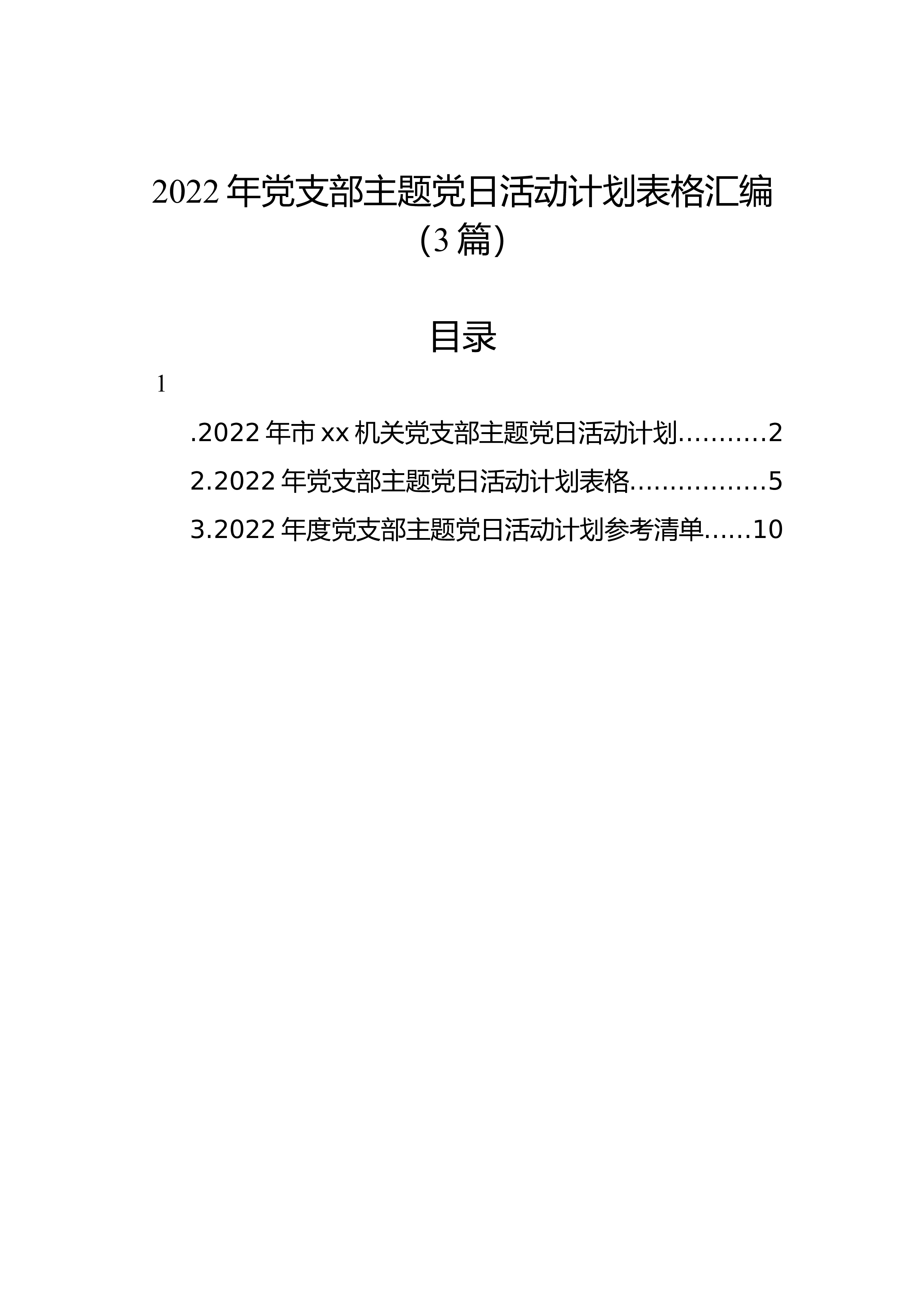 2022年党支部主题党日活动计划表格汇编(3篇)目录1.2022年市xx机关党支部主题党日活动计划...........22.2022年党支部主题党日活动计划表格.................53.2022年度党支部主题党日活动计划参考清单......102022年市xx机关党支部主题党日活动计划序号活动时间活动方式活动内容备注11月专题组织生活会召开支部专题组织生活会,开展批评与自我批评22月专题学习集中组织学习市第八次党代会精神33月专题部署专题研究部署,组织党员积极参与xx全会筹备工作44月联建活动联合其他单位基层党支部开展“党建交流互联共建”主题党日活动55月党员志愿行动党建引领聚...