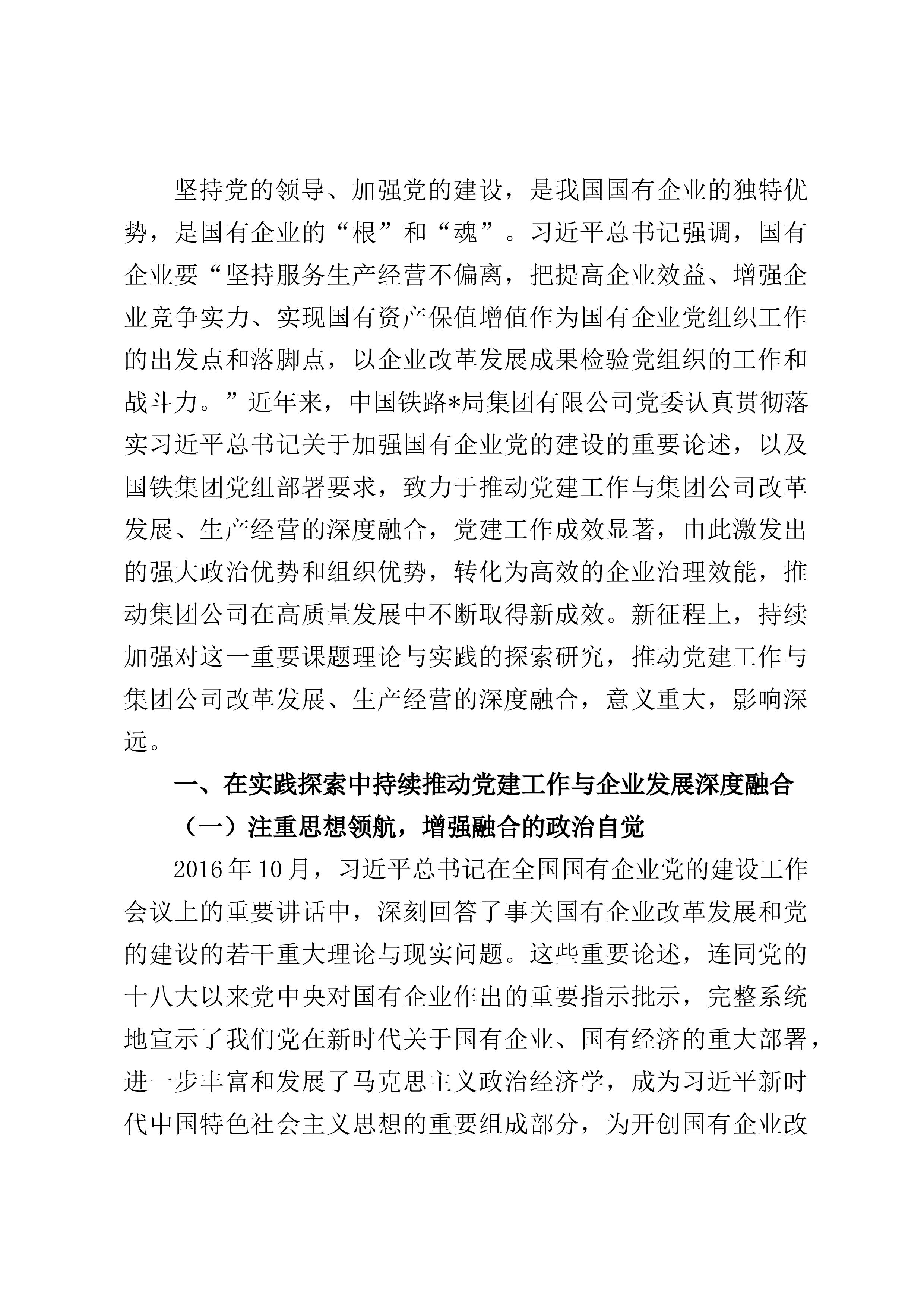 坚持党的领导、加强党的建设,是我国国有企业的独特优势,是国有企业的“根”和“魂”。习近平总书记强调,国有企业要“坚持服务生产经营不偏离,把提高企业效益、增强企业竞争实力、实现国有资产保值增值作为国有企业党组织工作的出发点和落脚点,以企业改革发展成果检验党组织的工作和战斗力。”近年来,中国铁路*局集团有限公司党委认真贯彻落实习近平总书记关于加强国有企业党的建设的重要论述,以及国铁集团党组部署要求,致力于推动党建工作与集团公司改革发展、生产经营的深度融合,党建工作成效显著,由此激发出的强大政治优势和组织优势,转化为高效的企业治理效能,推动集团公司在高质量发展中不断取得新成效。新征程上,持续加强对这...