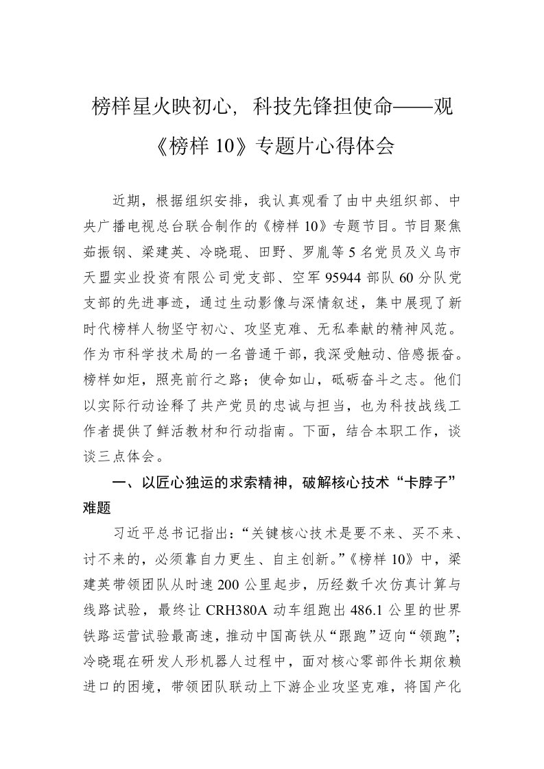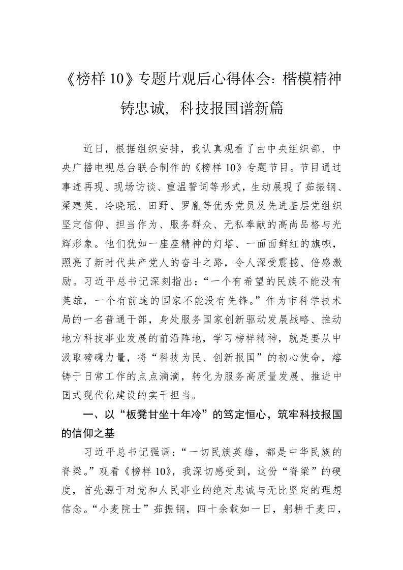 10专题片观后心得体会楷模精神铸忠诚科技报国谱新篇