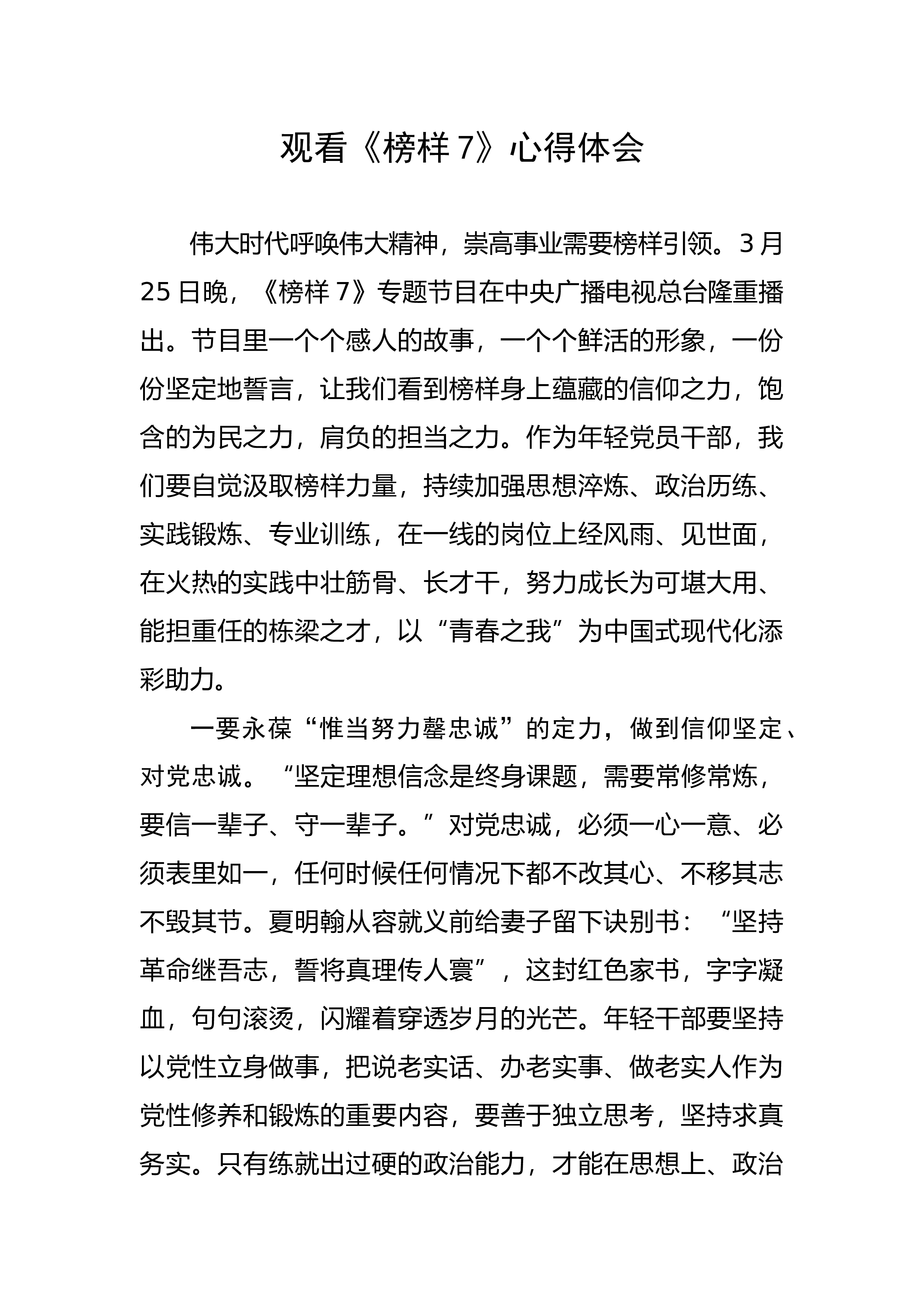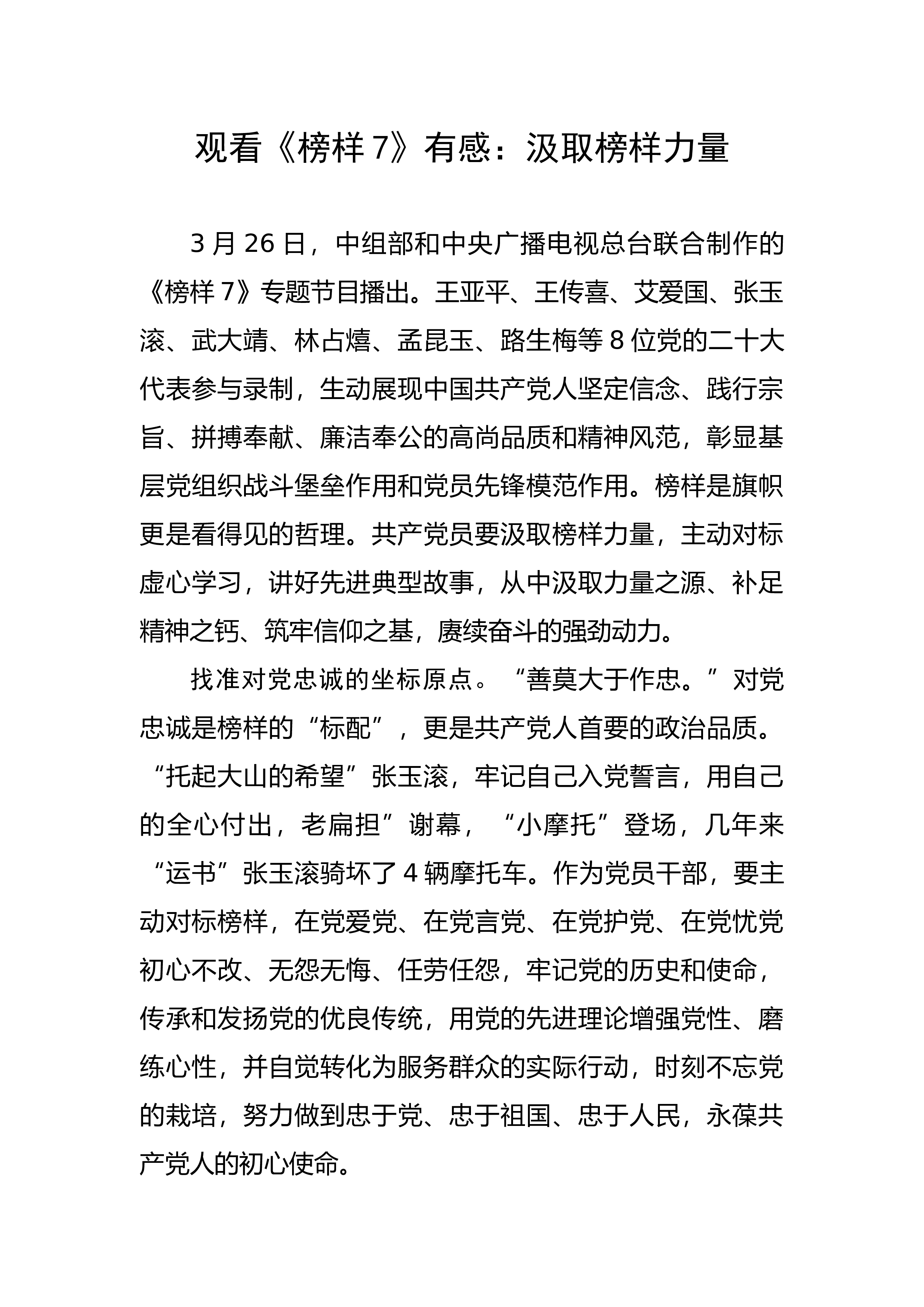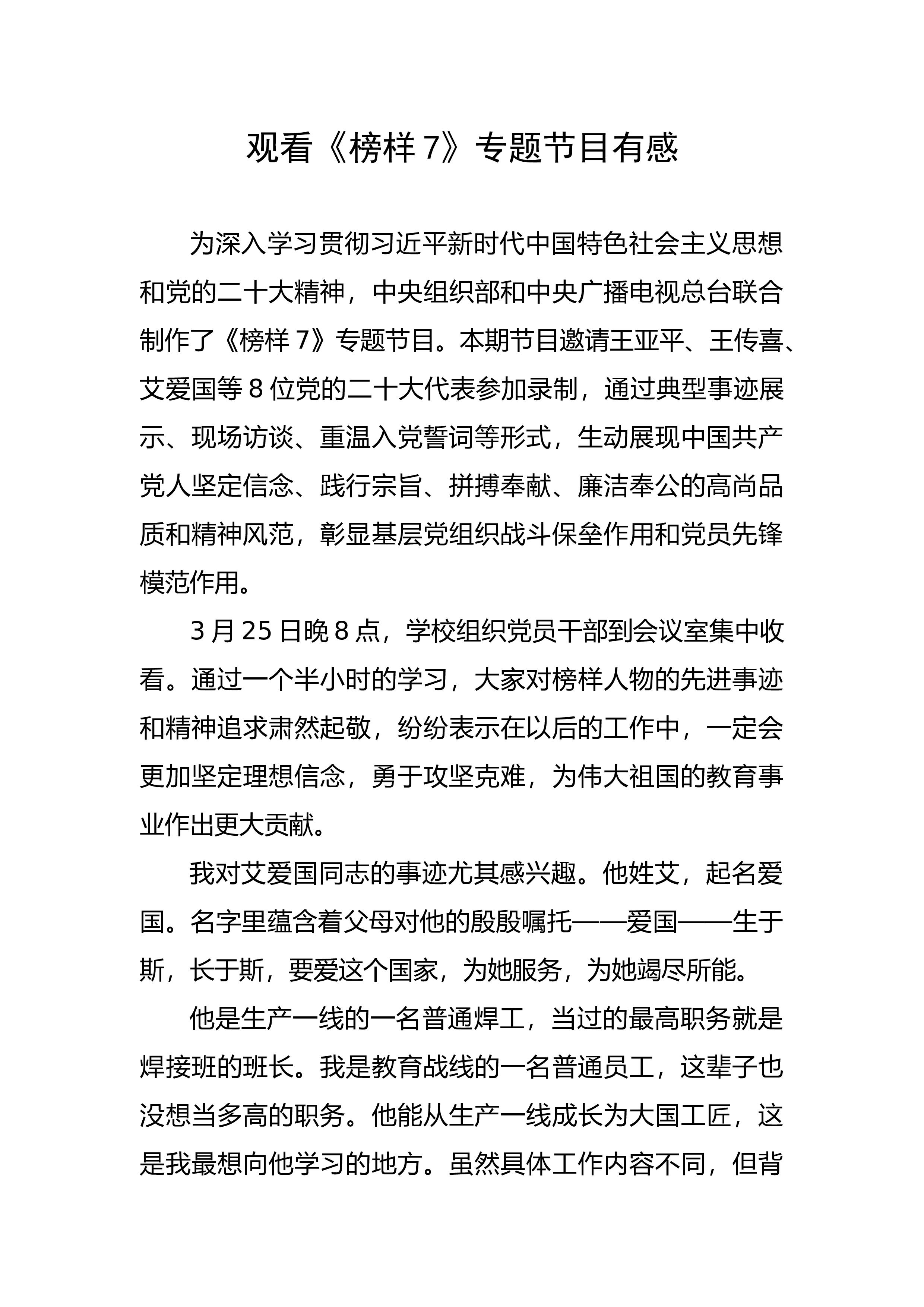01学习榜样,不负时代、不负韶华 榜样之于人生,就如同炬火之于黑夜,灯塔之于航船,指南之于荒漠。罗·阿谢姆所言“一个榜样胜过二十条教诲”道出了榜样的力量“历史烛照时代,榜样传承精神”,榜样是一种伟大的力量,推动一代又一代年轻人奋进;榜样是一面鲜明的旗帜,昭示着新时代前进的方向;榜样又如沐人的春风,吹遍祖国大地和百姓的心里;榜样同时是时代最强的音符,每一次扣响都会让人心弦跳动。 通过观看学习,作为一名年轻党员,我备受鼓舞,在此分享一下自己的心得感悟:观看完《榜样7》,我的内心从始至终都被震撼、被感动着的。王亚平、王传喜、艾爱国、张玉滚、武大靖、林占熺、孟昆玉、路生梅等党的二十大代表,每一位榜...