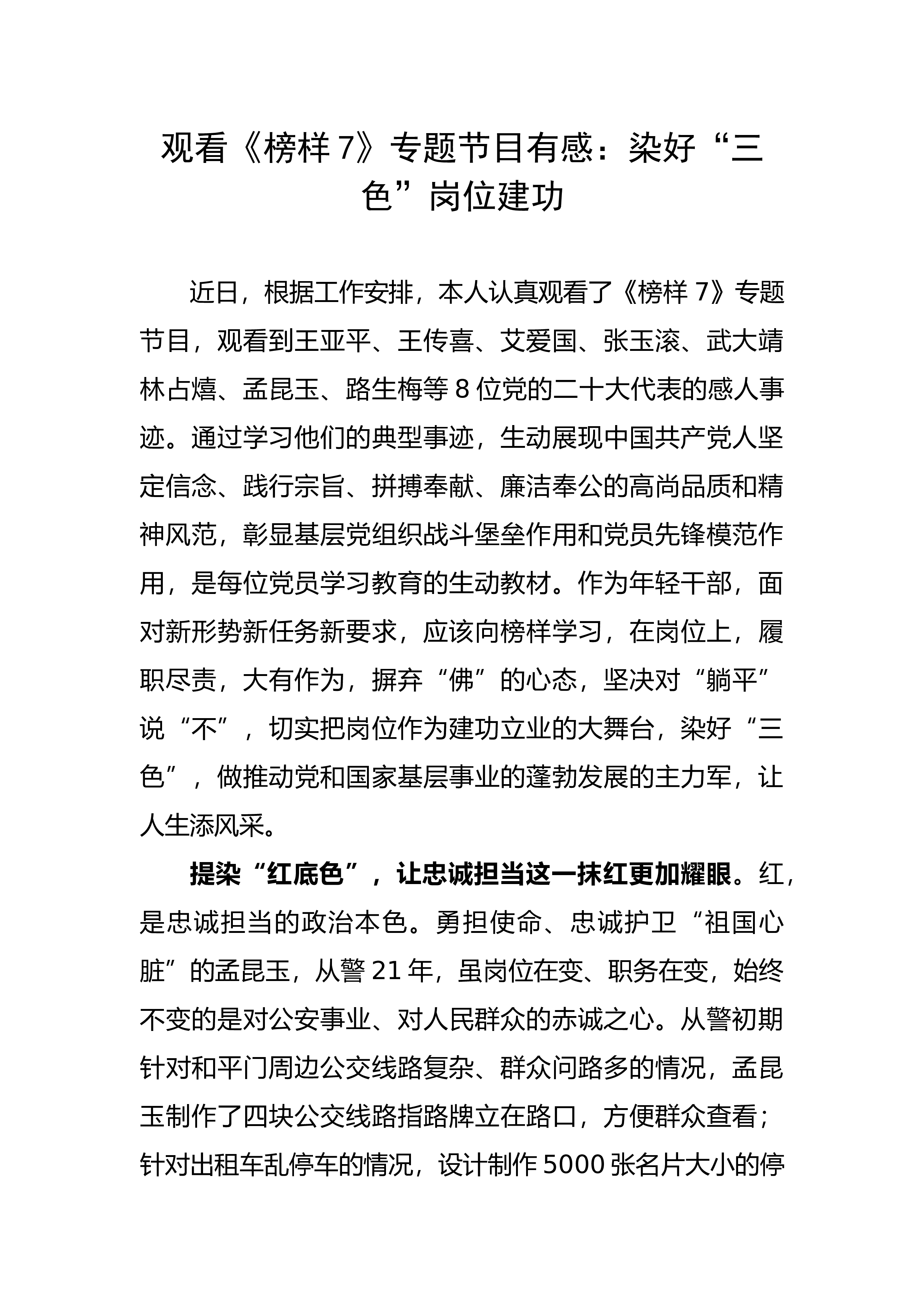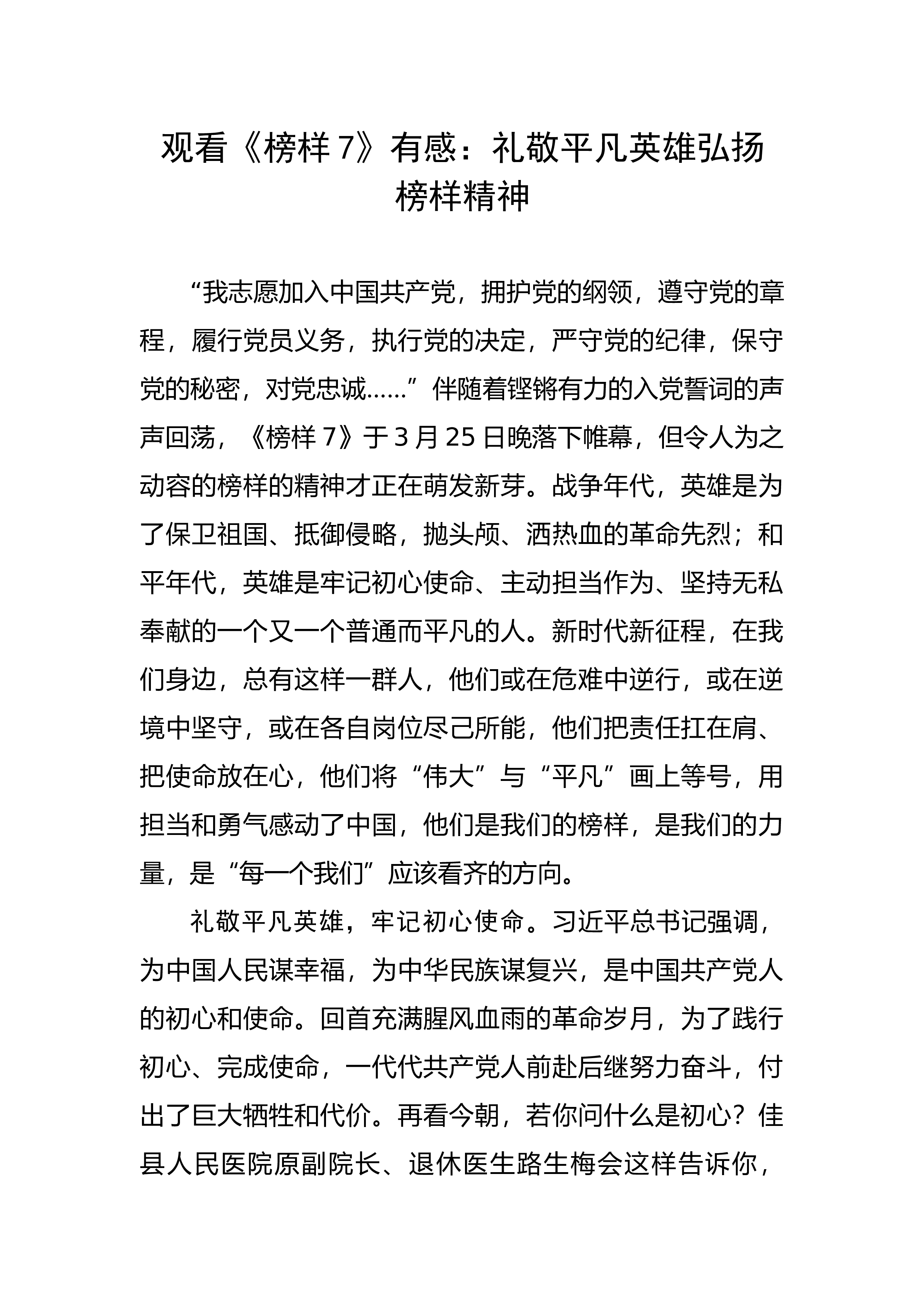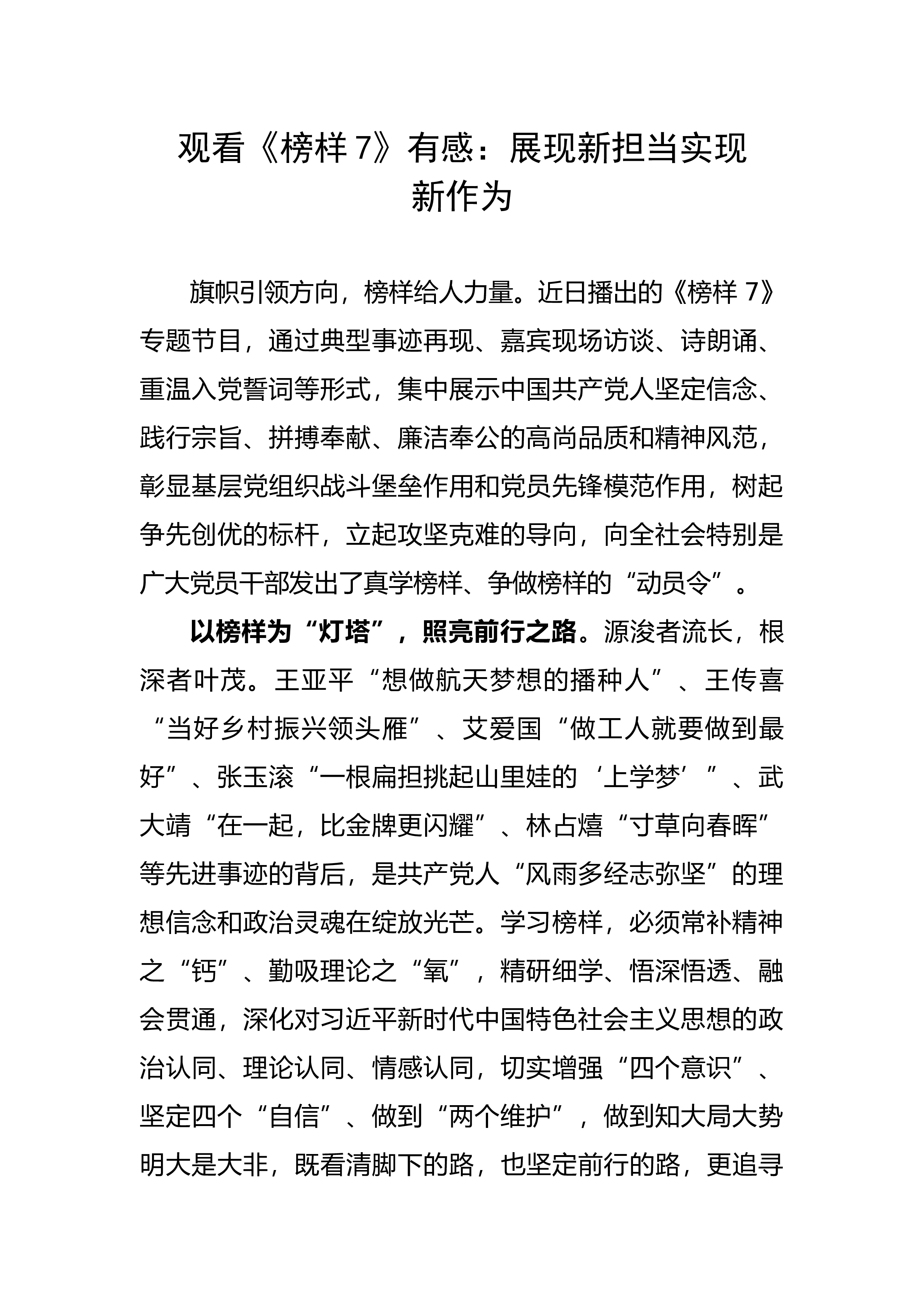 01学习榜样,不负时代、不负韶华 榜样之于人生,就如同炬火之于黑夜,灯塔之于航船,指南之于荒漠。罗·阿谢姆所言“一个榜样胜过二十条教诲”道出了榜样的力量“历史烛照时代,榜样传承精神”,榜样是一种伟大的力量,推动一代又一代年轻人奋进;榜样是一面鲜明的旗帜,昭示着新时代前进的方向;榜样又如沐人的春风,吹遍祖国大地和百姓的心里;榜样同时是时代最强的音符,每一次扣响都会让人心弦跳动。 通过观看学习,作为一名年轻党员,我备受鼓舞,在此分享一下自己的心得感悟:观看完《榜样7》,我的内心从始至终都被震撼、被感动着的。王亚平、王传喜、艾爱国、张玉滚、武大靖、林占熺、孟昆玉、路生梅等党的二十大代表,每一位榜...