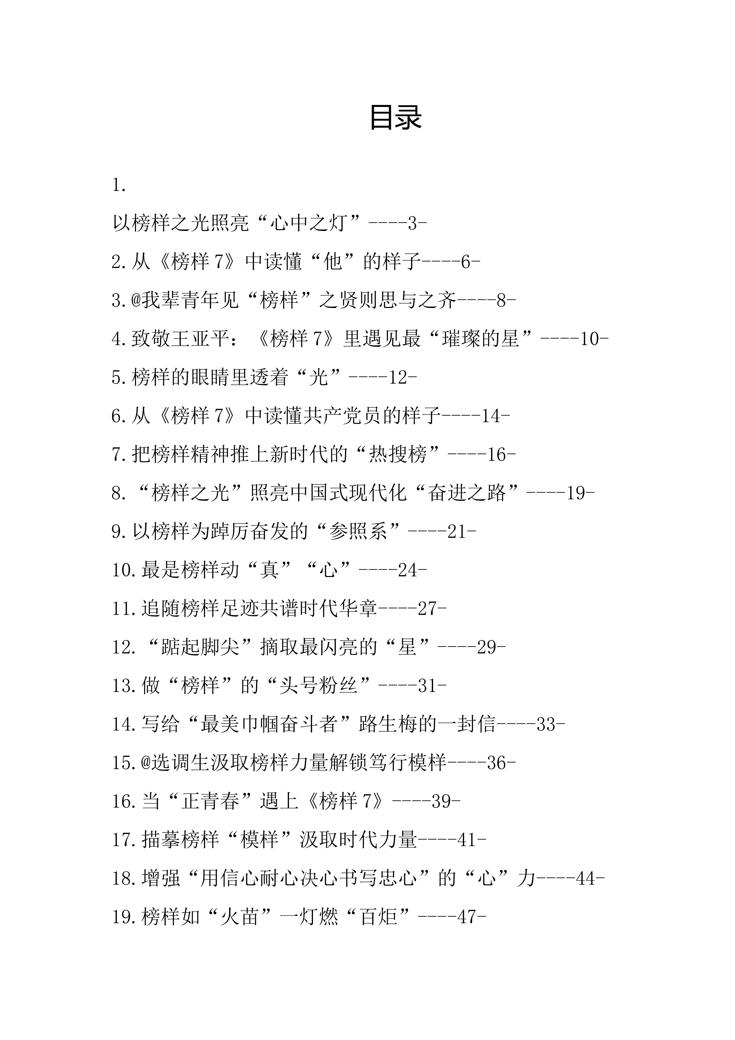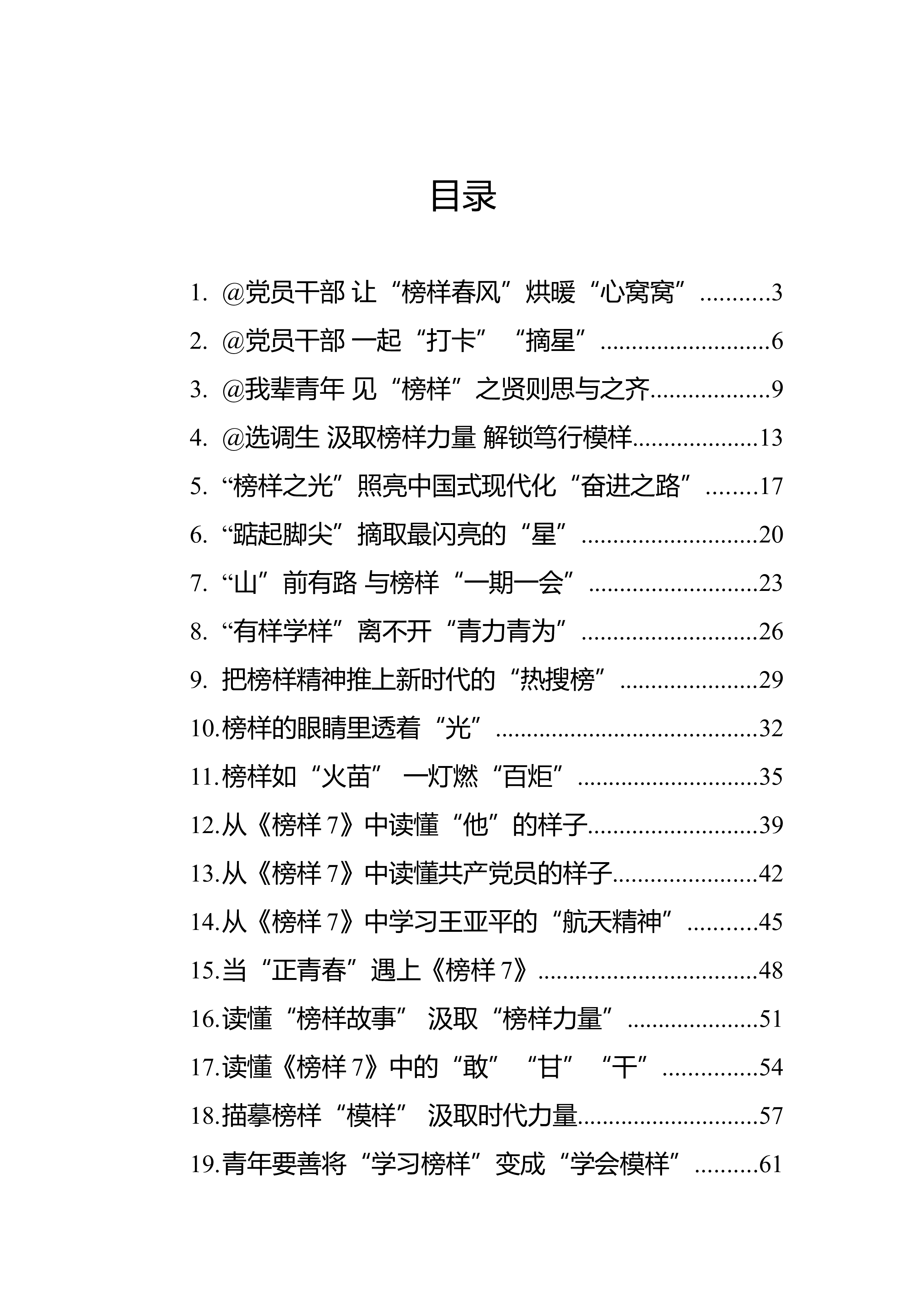 目录1.@党员干部让“榜样春风”烘暖“心窝窝”...........32.@党员干部一起“打卡”“摘星”...........................63.@我辈青年见“榜样”之贤则思与之齐...................94.@选调生汲取榜样力量解锁笃行模样....................135.“榜样之光”照亮中国式现代化“奋进之路”........176.“踮起脚尖”摘取最闪亮的“星”............................207.“山”前有路与榜样“一期一会”...........................238.“有样学样”离不开“青力青为...