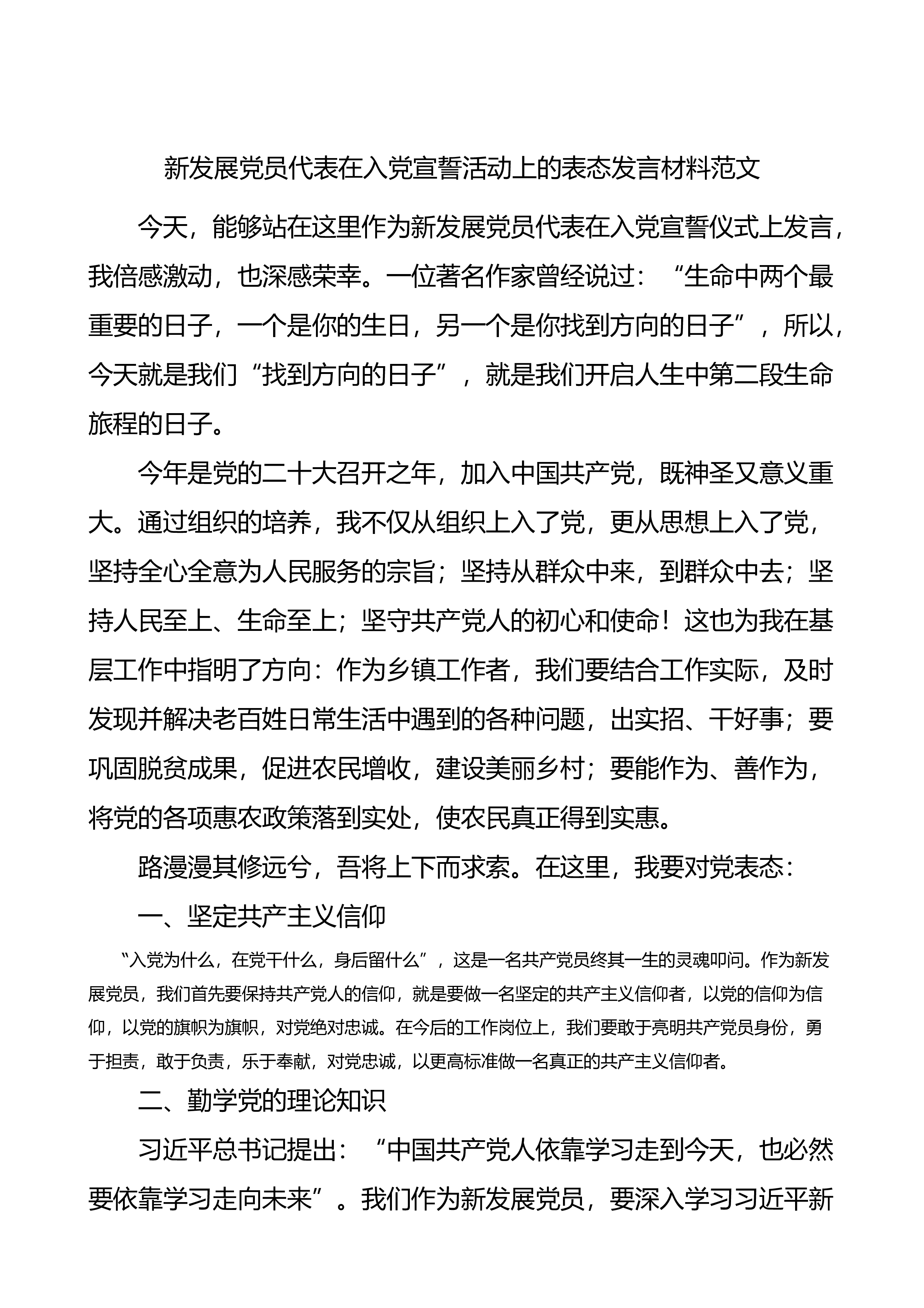 材料范文今天,能够站在这里作为新发展党员代表在入党宣誓仪式上发言,我倍感激动,也深感荣幸。一位著名作家曾经说过:“生命中两个最重要的日子,一个是你的生日,另一个是你找到方向的日子”,所以,今天就是我们“找到方向的日子”,就是我们开启人生中第二段生命旅程的日子。今年是党的二十大召开之年,加入中国共产党,既神圣又意义重大。通过组织的培养,我不仅从组织上入了党,更从思想上入了党,坚持全心全意为人民服务的宗旨;坚持从群众中来,到群众中去;坚持人民至上、生命至上;坚守共产党人的初心和使命!这也为我在基层工作中指明了方向:作为乡镇工作者,我们要结合工作实际,及时发现...