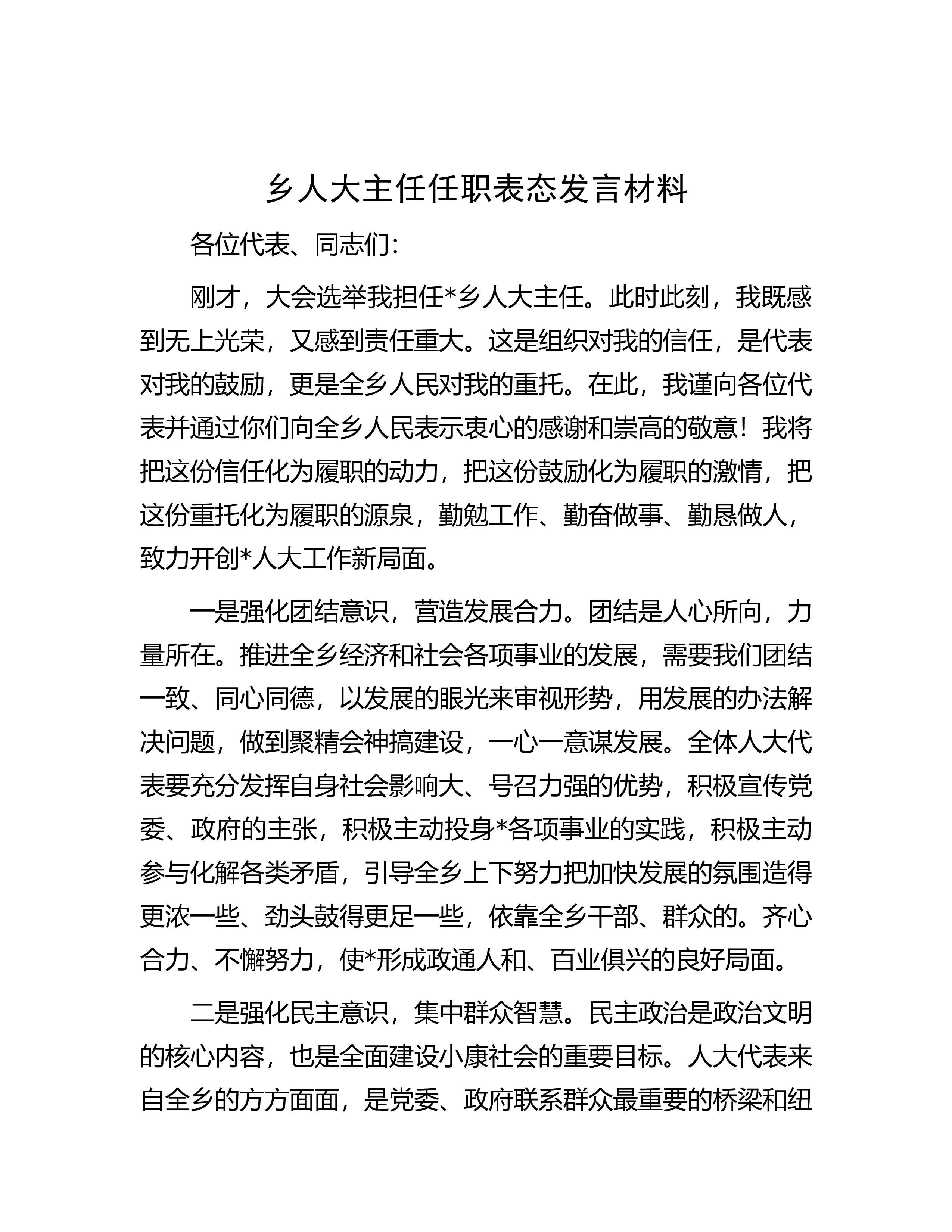 材料各位代表、同志们:刚才,大会选举我担任*乡人大主任。此时此刻,我既感到无上光荣,又感到责任重大。这是组织对我的信任,是代表对我的鼓励,更是全乡人民对我的重托。在此,我谨向各位代表并通过你们向全乡人民表示衷心的感谢和崇高的敬意!我将把这份信任化为履职的动力,把这份鼓励化为履职的激情,把这份重托化为履职的源泉,勤勉工作、勤奋做事、勤恳做人,致力开创*人大工作新局面。一是强化团结意识,营造发展合力。团结是人心所向,力量所在。推进全乡经济和社会各项事业的发展,需要我们团结一致、同心同德,以发展的眼光来审视形势,用发展的办法解决问题,做到聚精会神搞建设,一心一意谋发展。全体人大...