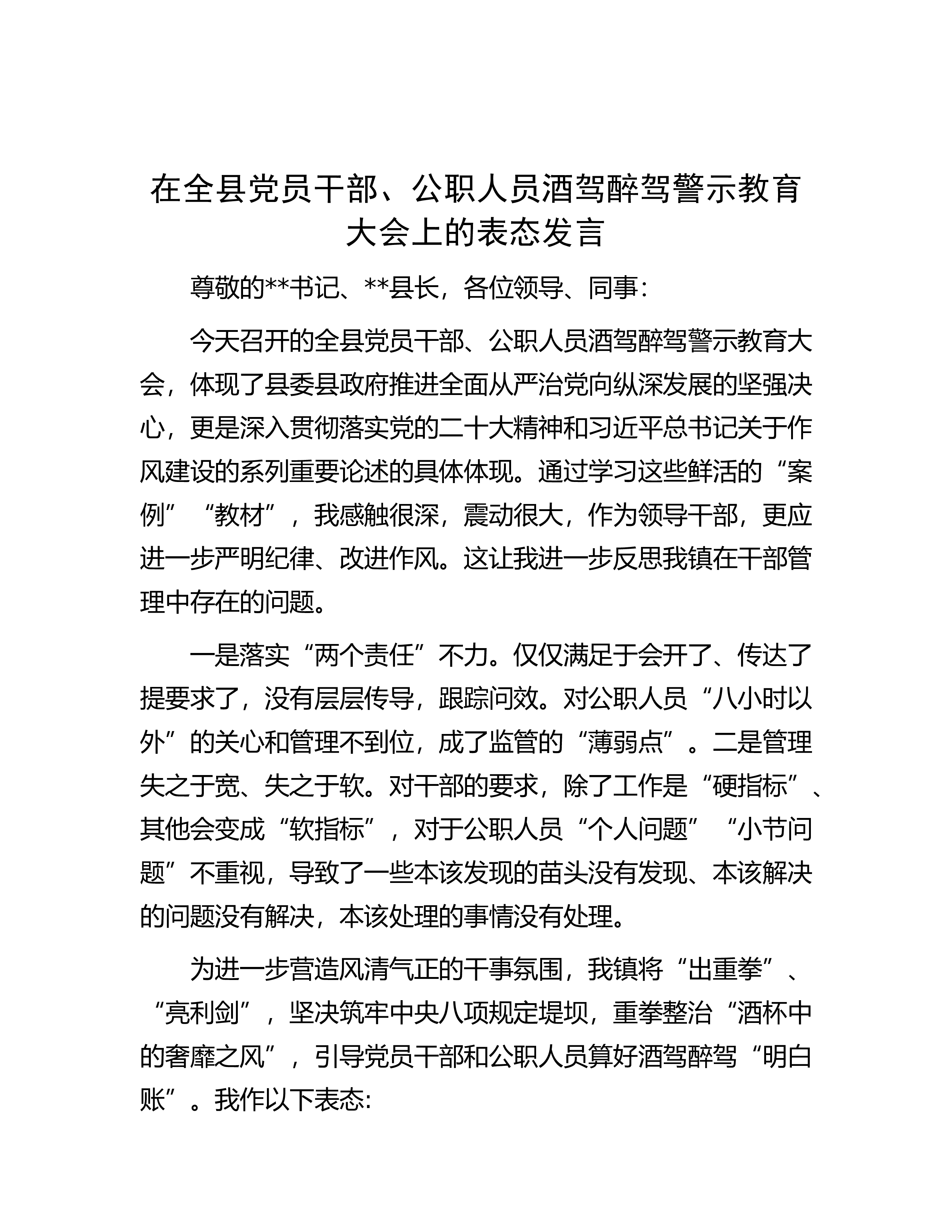 尊敬的**书记、**县长,各位领导、同事:今天召开的全县党员干部、公职人员酒驾醉驾警示教育大会,体现了县委县政府推进全面从严治党向纵深发展的坚强决心,更是深入贯彻落实党的二十大精神和习近平总书记关于作风建设的系列重要论述的具体体现。通过学习这些鲜活的“案例”“教材”,我感触很深,震动很大,作为领导干部,更应进一步严明纪律、改进作风。这让我进一步反思我镇在干部管理中存在的问题。一是落实“两个责任”不力。仅仅满足于会开了、传达了提要求了,没有层层传导,跟踪问效。对公职人员“八小时以外”的关心和管理不到位,成了监管的“薄弱点”。二是管理失之于宽...