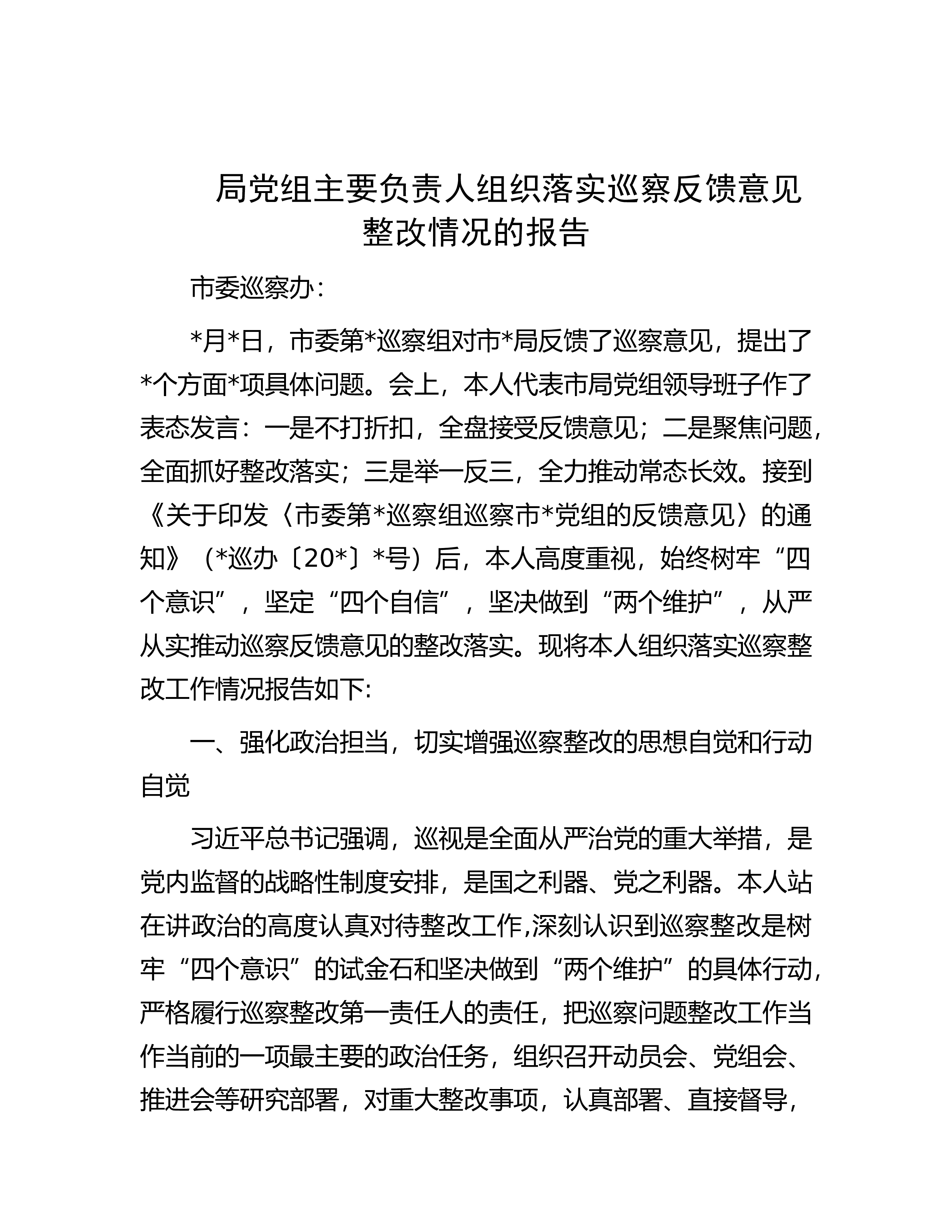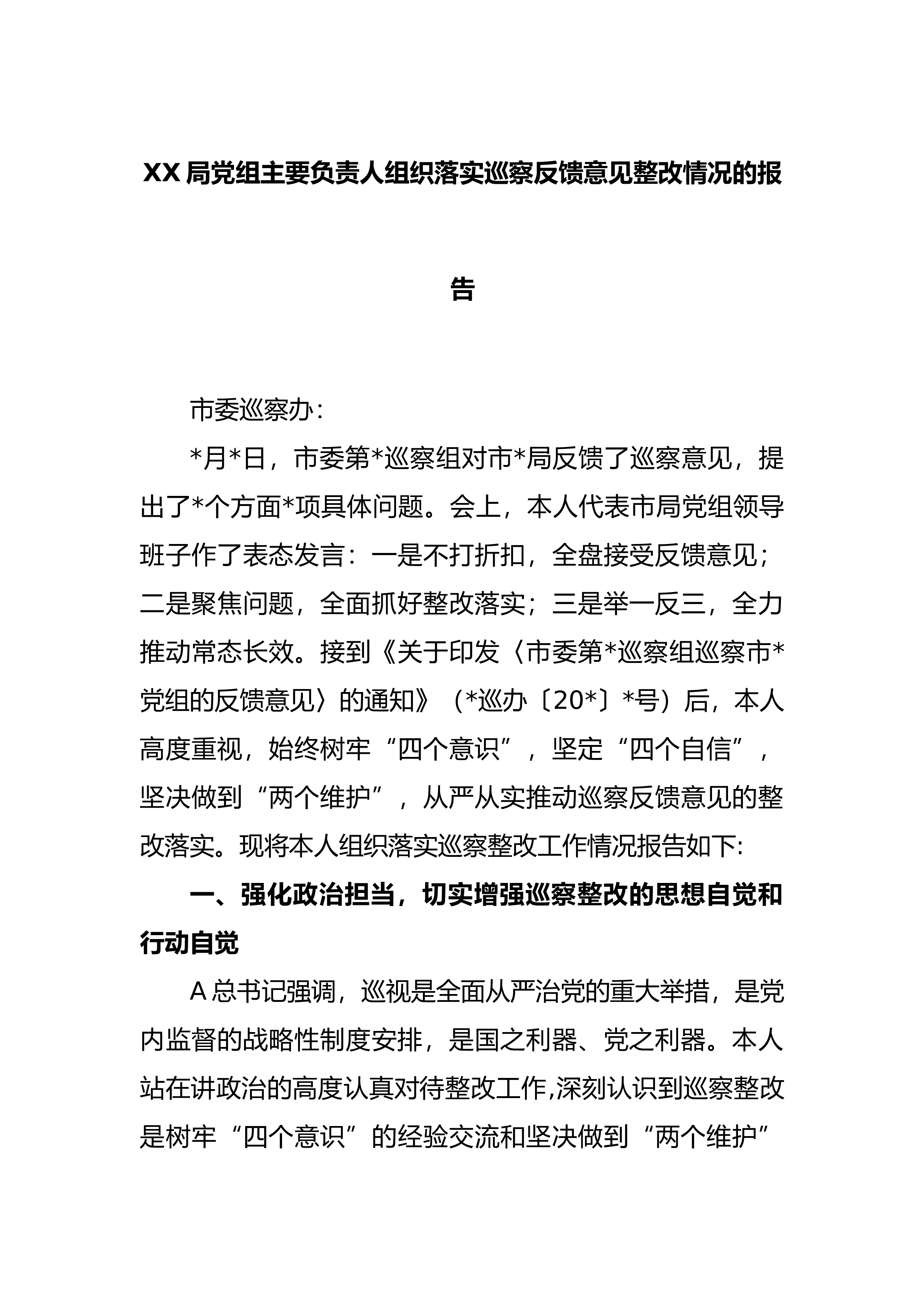 XX局党组主要负责人组织落实巡察反馈意见整改情况的报告市委巡察办:*月*日,市委第*巡察组对市*局反馈了巡察意见,提出了*个方面*项具体问题。会上,本人代表市局党组领导班子作了