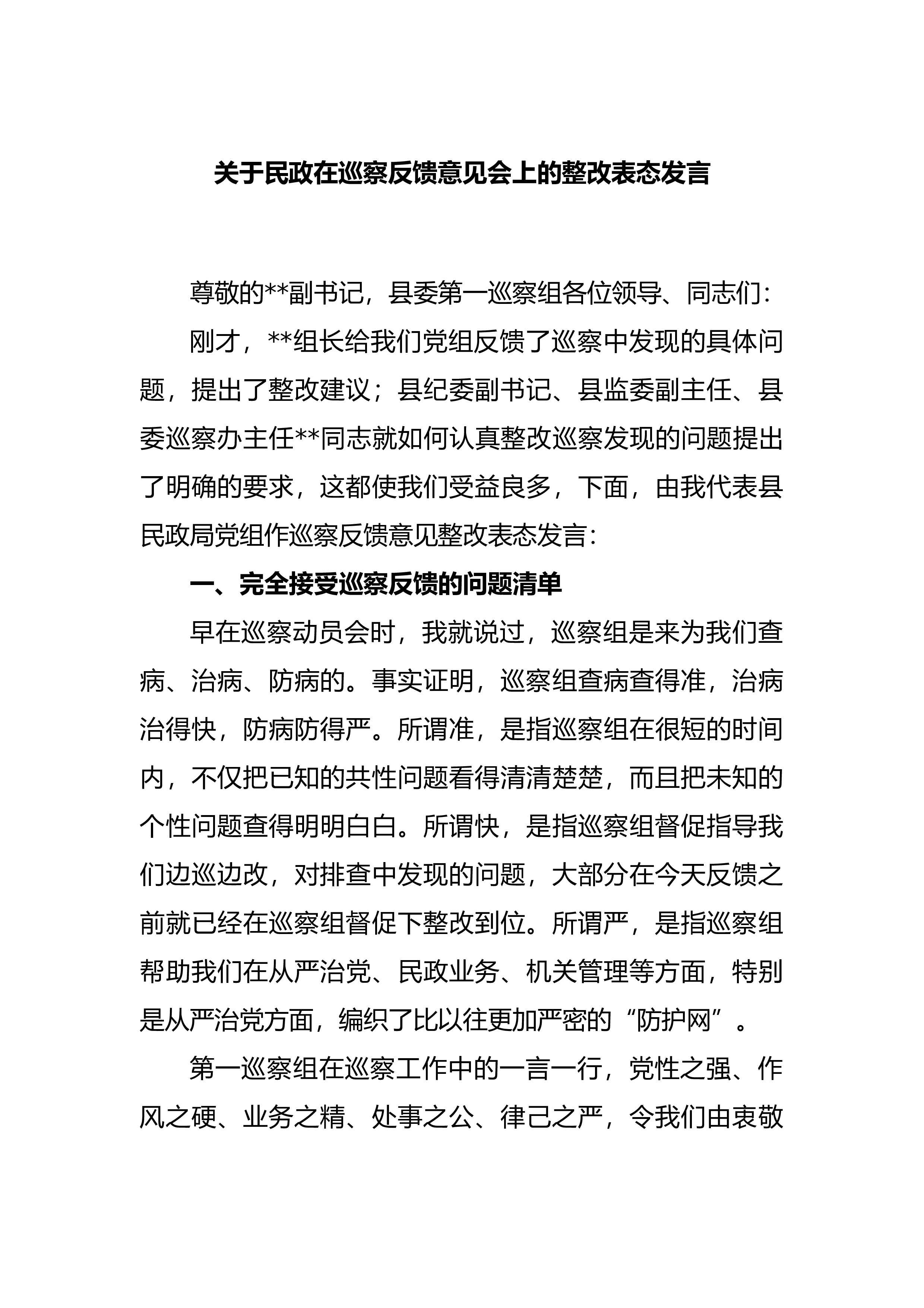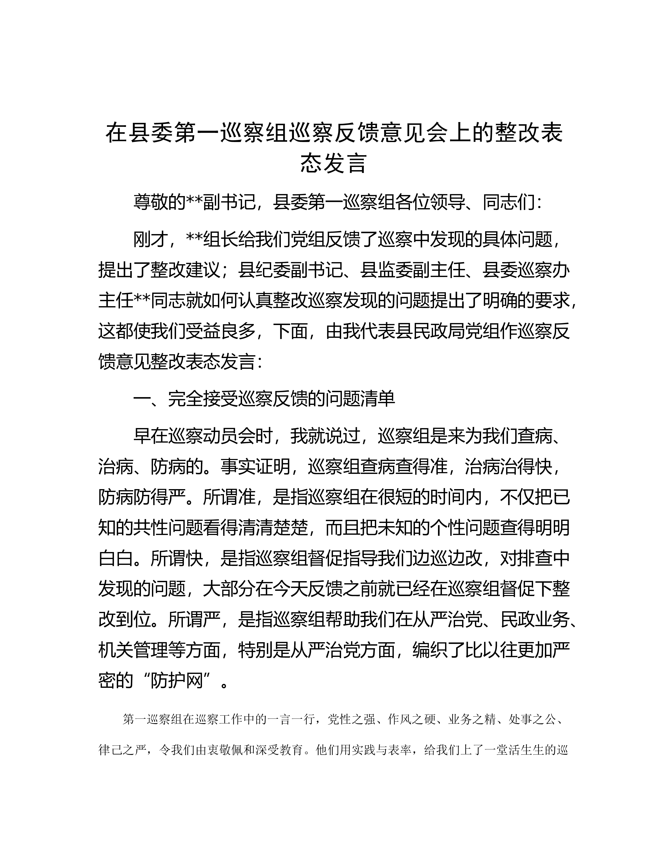 尊敬的**副书记,县委第一巡察组各位领导、同志们:刚才,**组长给我们党组反馈了巡察中发现的具体问题,提出了整改建议;县纪委副书记、县监委副主任、县委巡察办主任**同志就如何认真整改巡察发现的问题提出了明确的要求,这都使我们受益良多,下面,由我代表县民政局党组作巡察反馈意见整改