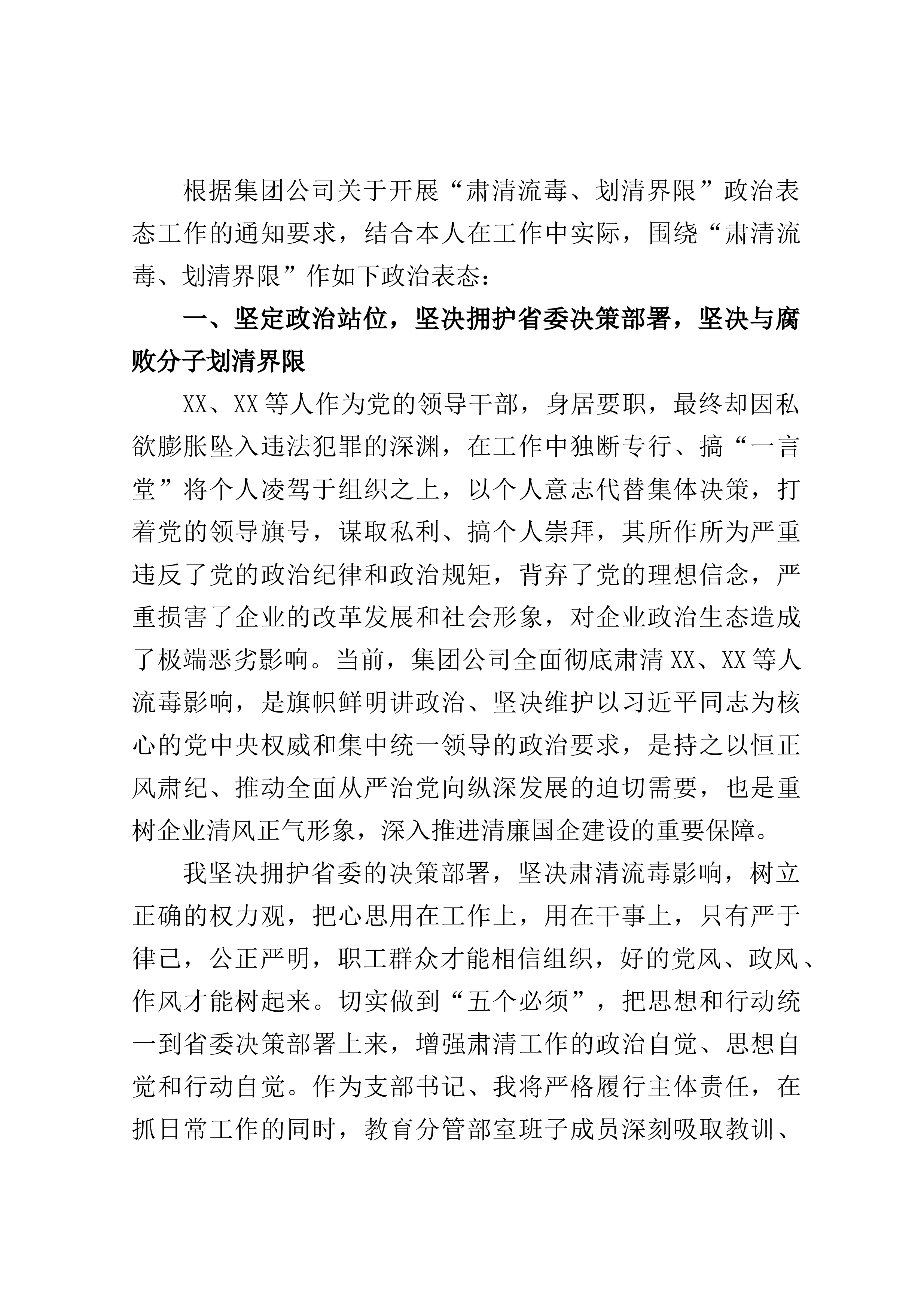 根据集团公司关于开展“肃清流毒、划清界限”政治表态工作的通知要求,结合本人在工作中实际,围绕“肃清流毒、划清界限”作如下政治表态:一、坚定政治站位,坚决拥护省委决策部署,坚决与腐败分子划清界限XX、XX等人作为党的领导干部,身居要职,最终却因私欲膨胀坠入违法犯罪的深渊,在工作中独断专行、搞“一言堂”将个人凌驾于组织之上,以个人意志代替集体决策,打着党的领导旗号,谋取私利、搞个人崇拜,其所作所为严重违反了党的政治纪律和政治规矩,背弃了党的理想信念,严重损害了企业的改革发展和社会形象,对企业政治生态造成了极端恶劣影响。当前,集团公司全面彻底肃清XX、XX等人流毒影响,是旗帜鲜明讲政治、坚决维护以习...