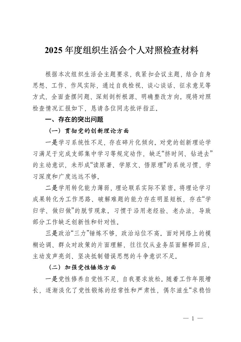 2025年度组织生活会个人对照检查