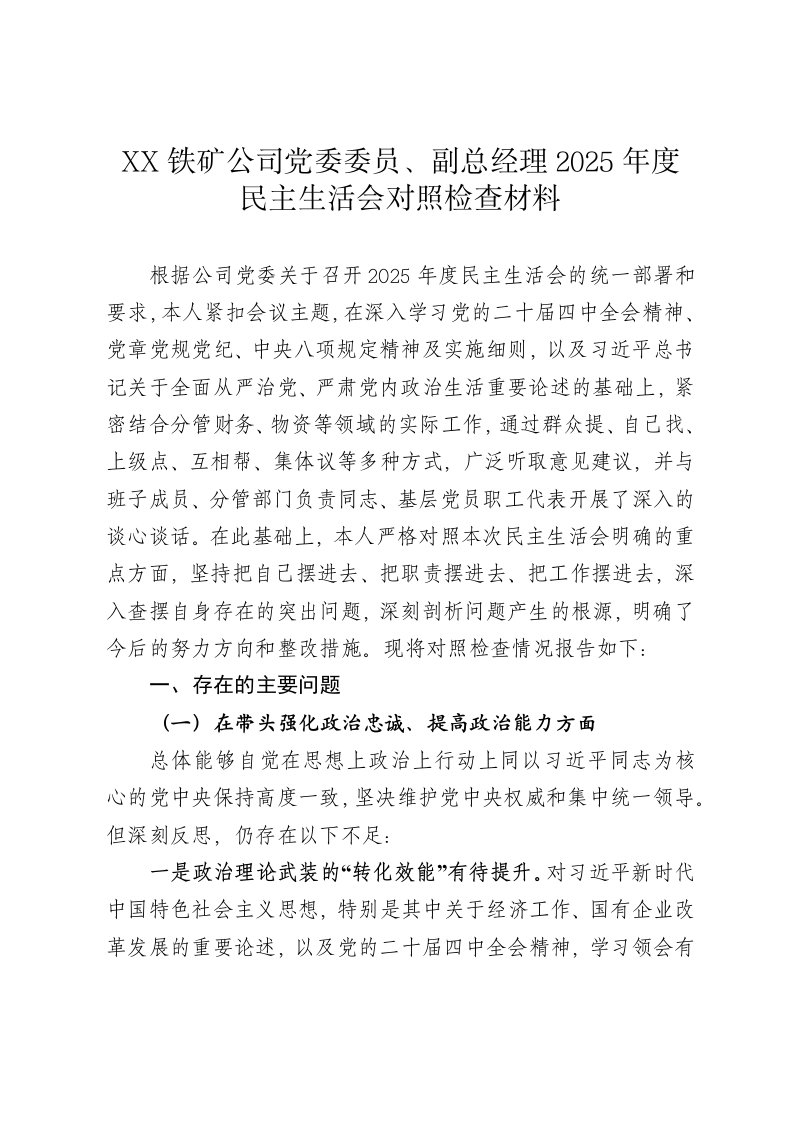 铁矿公司党委委员副总经理2025年度民主生活会对照检查