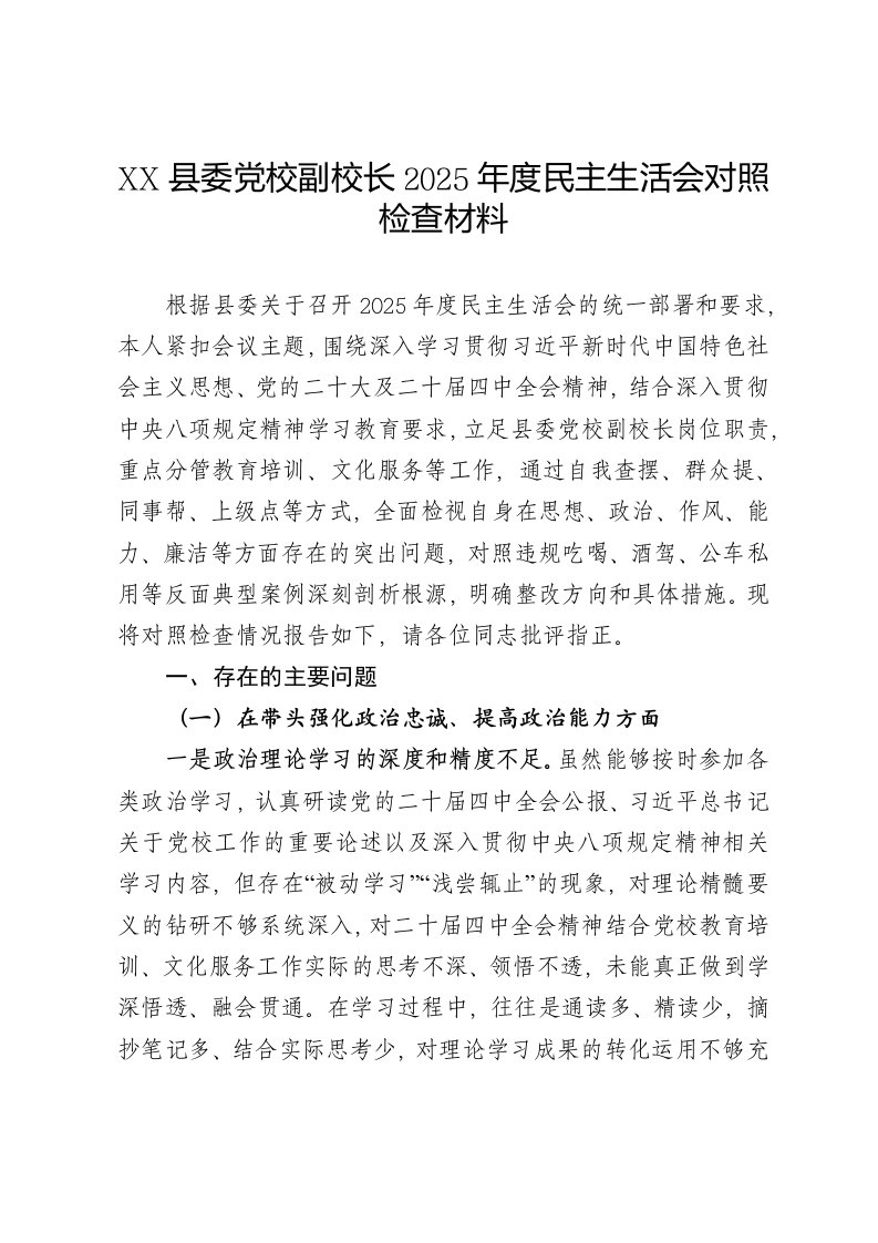 县委党校副校长2025年度民主生活会对照检查