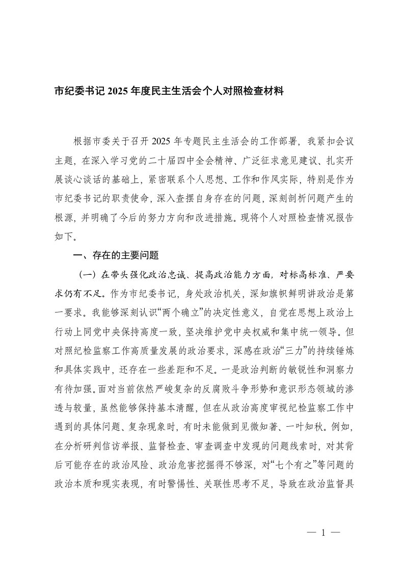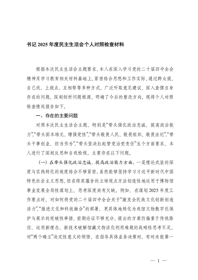 书记2025年度民主生活会个人对照检查
