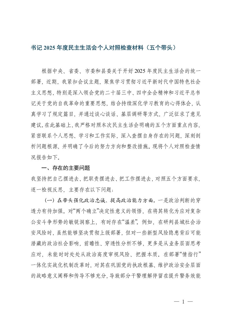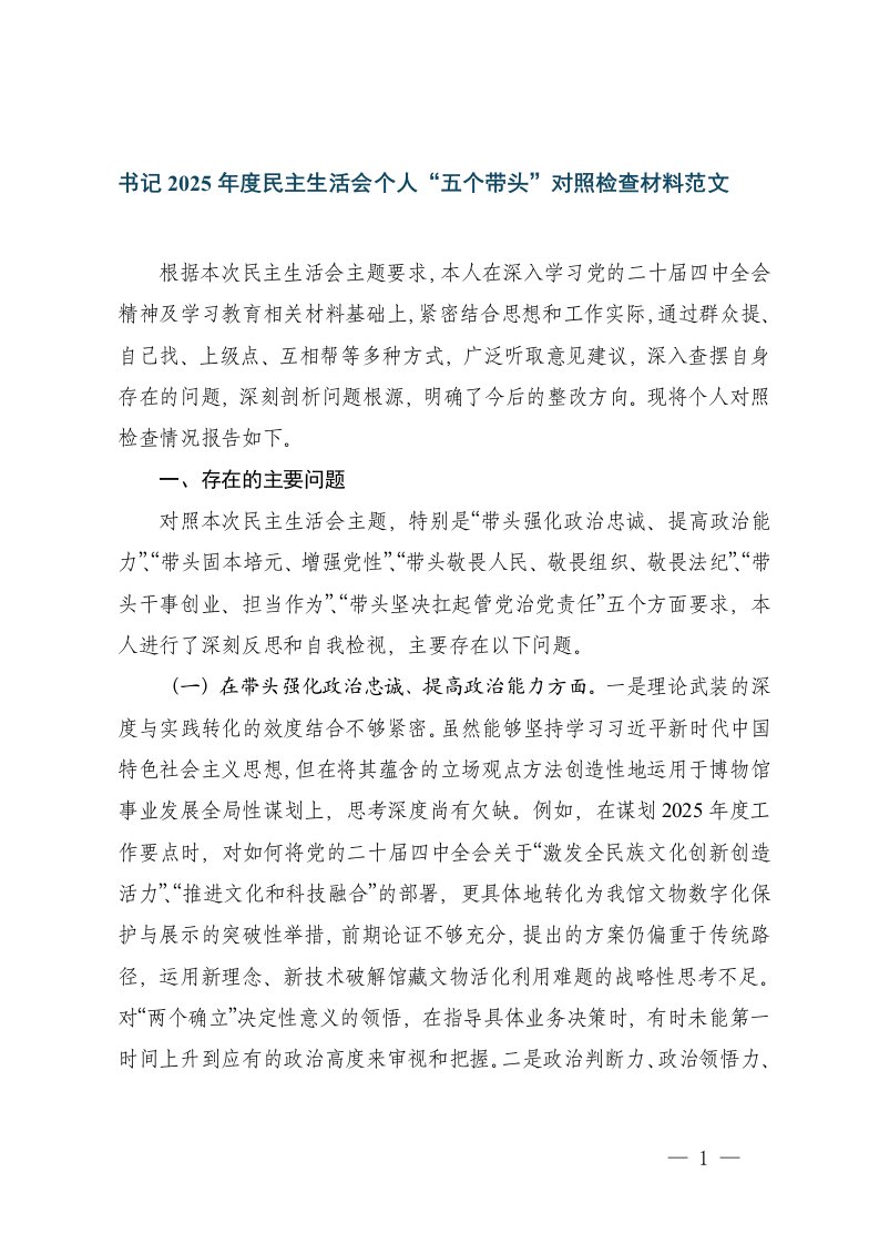 书记2025年度民主生活会个人五个带头对照检查