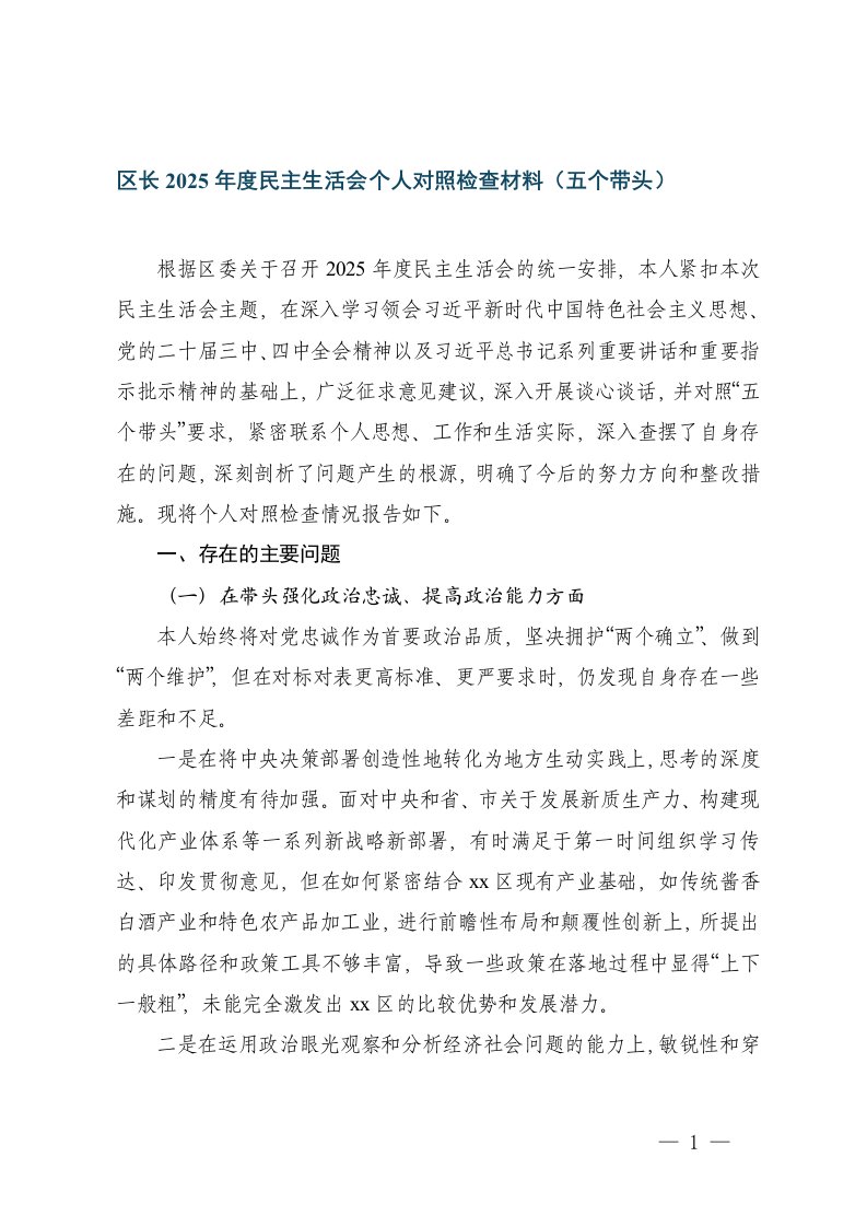 社会工作部部长2025年度专题民主生活会五个带头对照检查发言