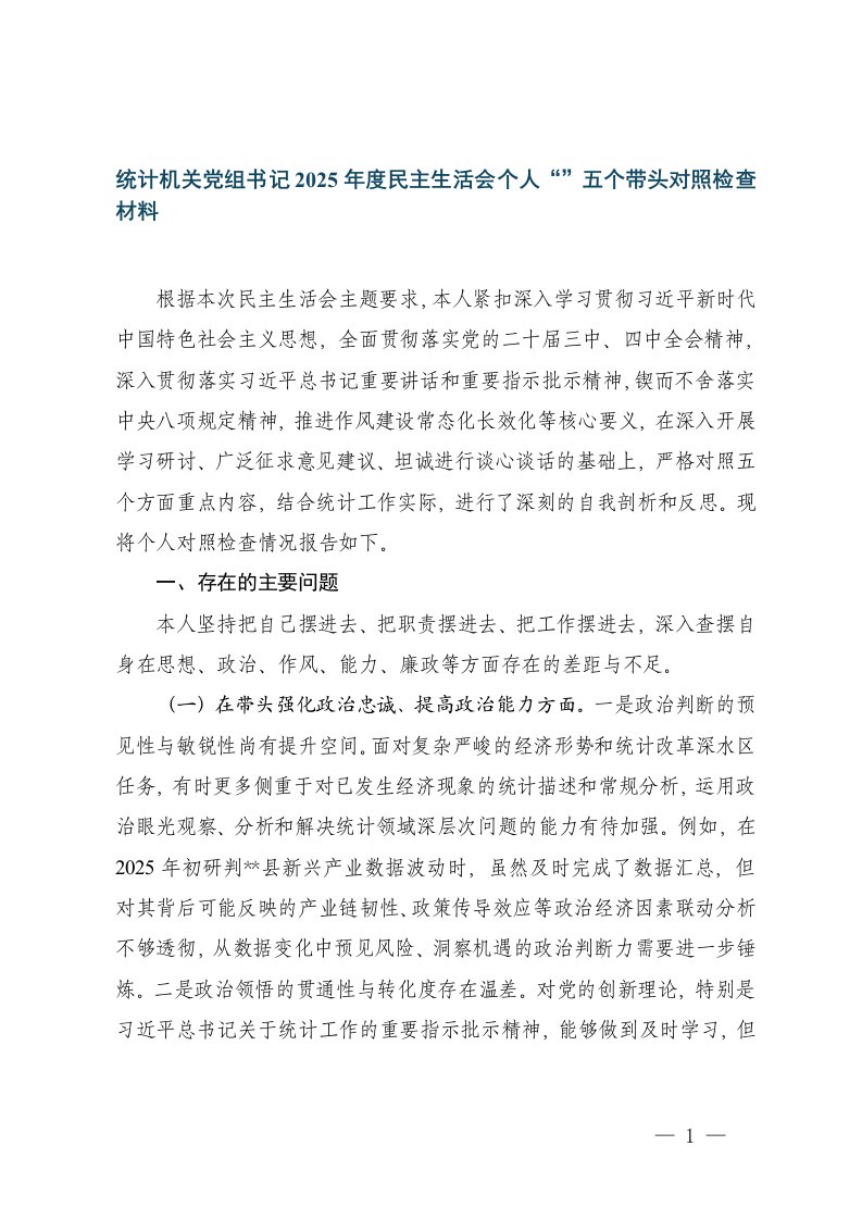 统计机关党组书记2025年度民主生活会个人五个带头对照检查