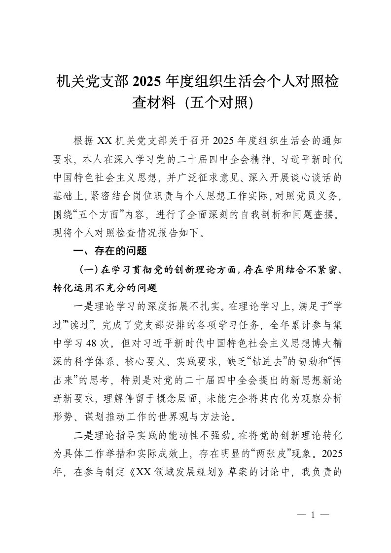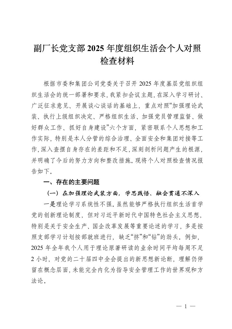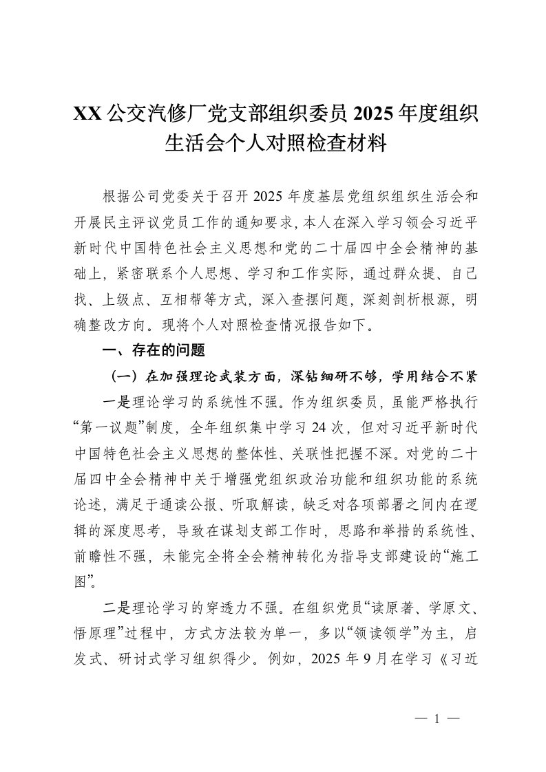 公交汽修厂党支部组织委员2025年度组织生活会个人对照检查