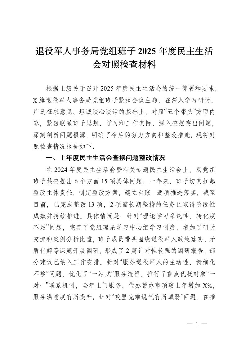 退役军人事务局党组班子2025年度民主生活会对照检查