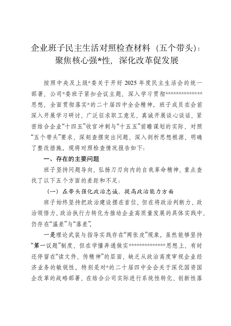 五个带头聚焦核心强党性深化改革促发展对照检查