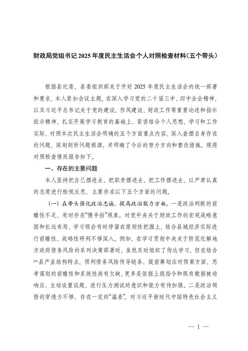 人大工信机关财政局医院党委领导班子2025年度民主生活会对照检查材料在带头固本培元增强党性方面在带头敬畏人民敬畏组织敬畏法纪方面