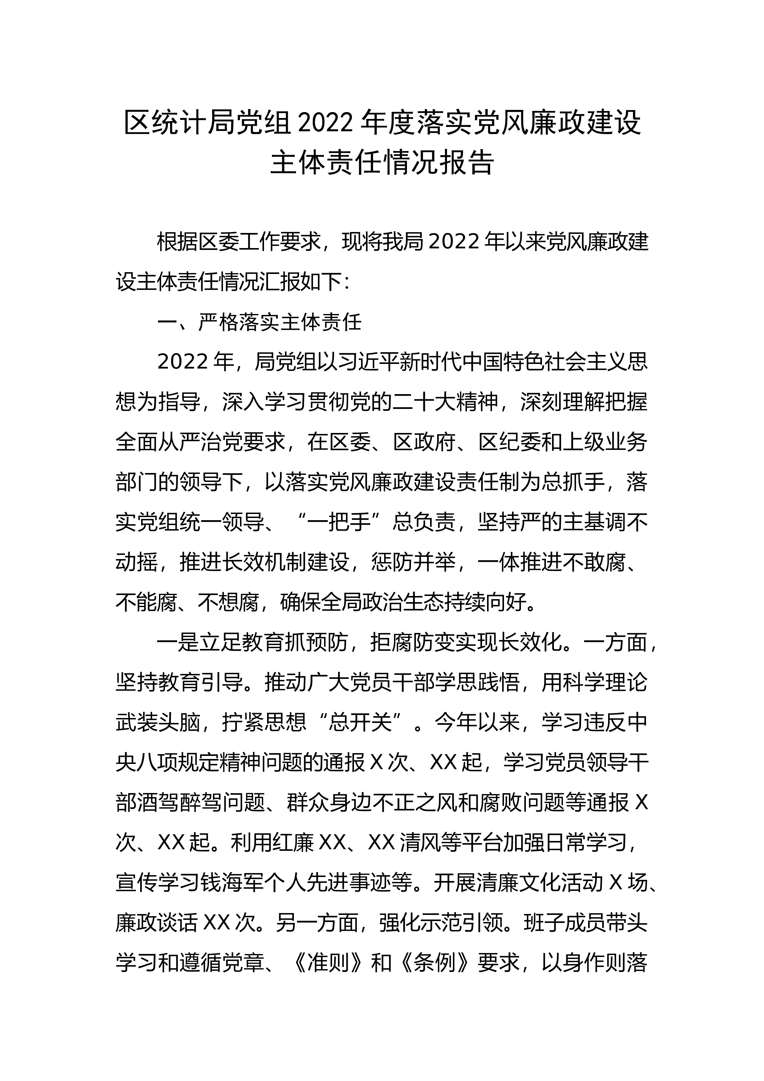 区统计局党组2022年度落实党风廉政建设主体责任情况报告根据区委工作要求,现将我局2022年以来党风廉政建设主体责任情况汇报如下:一、严格落实主体责任2022年,局党组以习近平新时代中国特色社会主义思想为指导,深入学习贯彻党的二十大精神,深刻理解把握全面从严治党要求,在区委、区政府、区纪委和上级业务部门的领导下,以落实党风廉政建设责任制为总抓手,落实党组统一领导、“一把手”总负责,坚持严的主基调不动摇,推进长效机制建设,惩防并举,一体推进不敢腐、不能腐、不想腐,确保全局政治生态持续向好。一是立足教育抓预防,拒腐防变实现长效化。一方面,坚持教育引导。推动广大党员干部学思践悟,用科学理论武装头脑,...