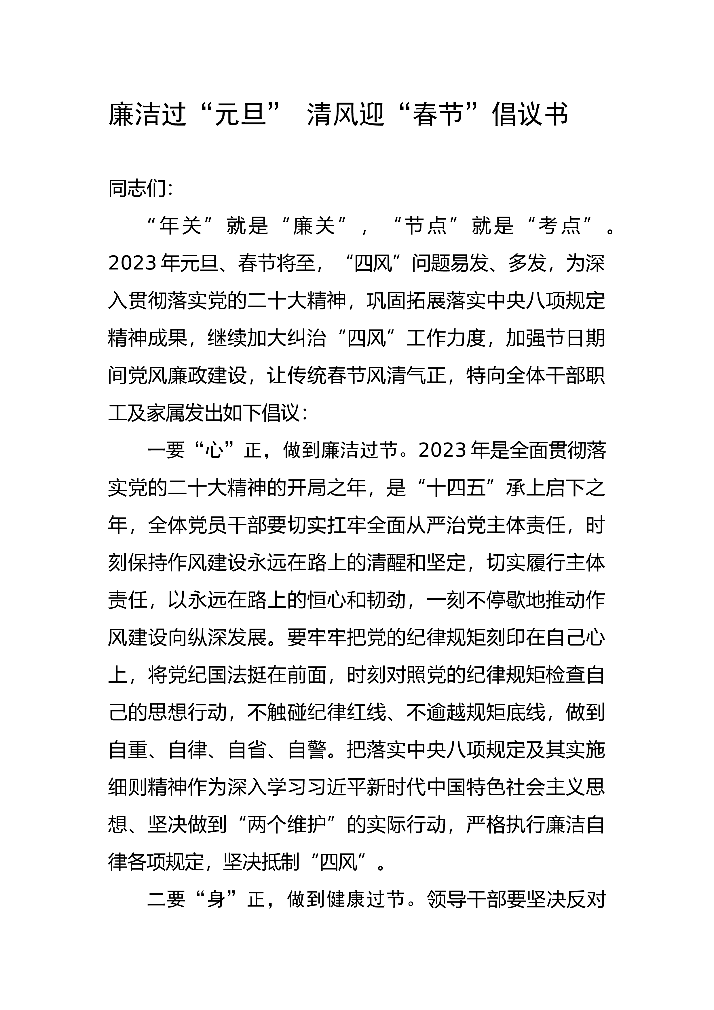 廉洁过“元旦”清风迎“春节”倡议书同志们:“年关”就是“廉关”,“节点”就是“考点”。2023年元旦、春节将至,“四风”问题易发、多发,为深入贯彻落实党的二十大精神,巩固拓展落实中央八项规定精神成果,继续加大纠治“四风”工作力度,加强节日期间党风廉政建设,让传统春节风清气正,特向全体干部职工及家属发出如下倡议:一要“心”正,做到廉洁过节。2023年是全面贯彻落实党的二十大精神的开局之年,是“十四五”承上启下之年,全体党员干部要切实扛牢全面从严治党主体责任,时刻保持作风建设永远在路上的清醒和坚定,切实履行主体责任,以永远在路上的恒心和韧劲,一刻不停歇地推动作风建设向纵深发展。要牢牢把党的纪律规矩...