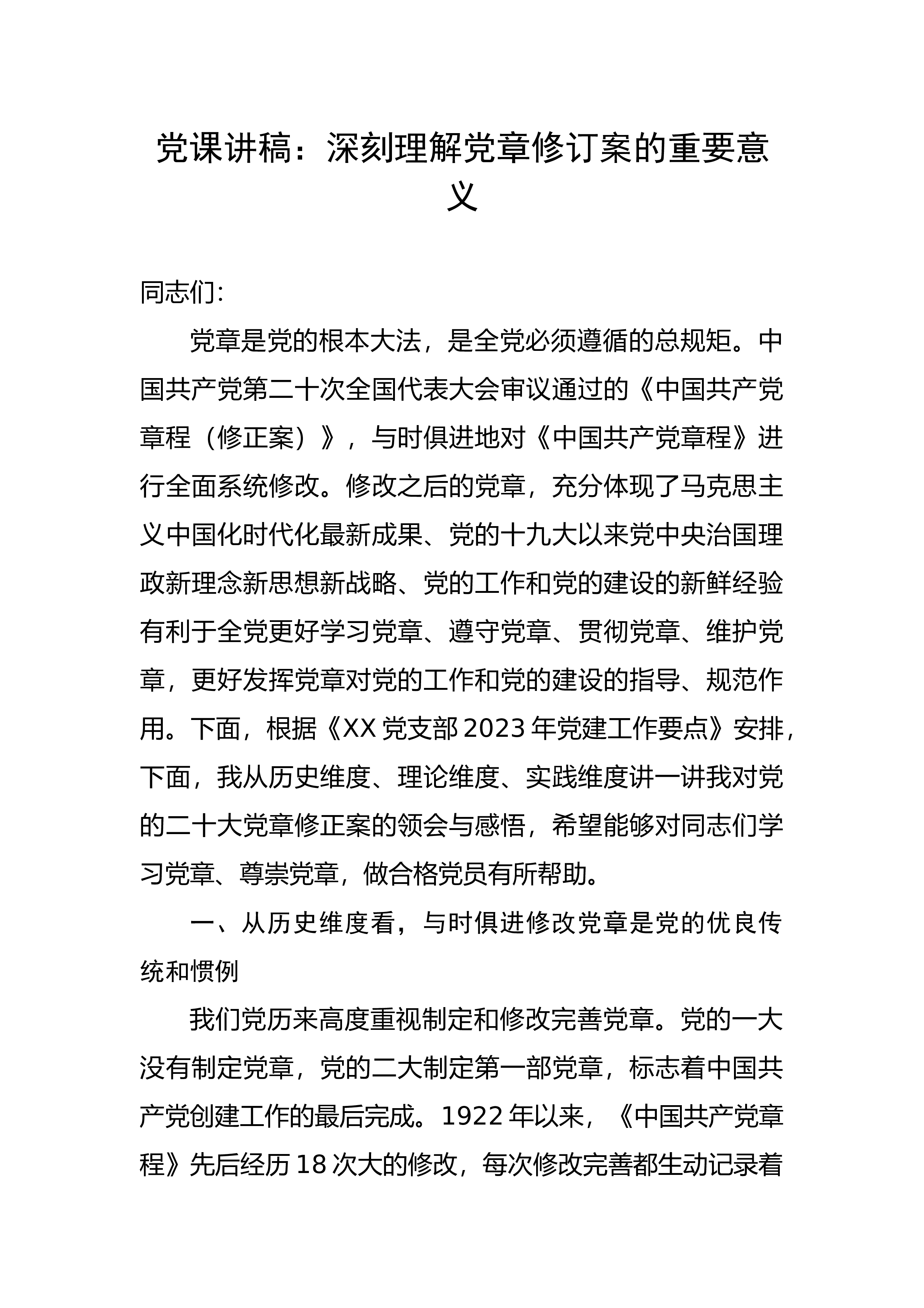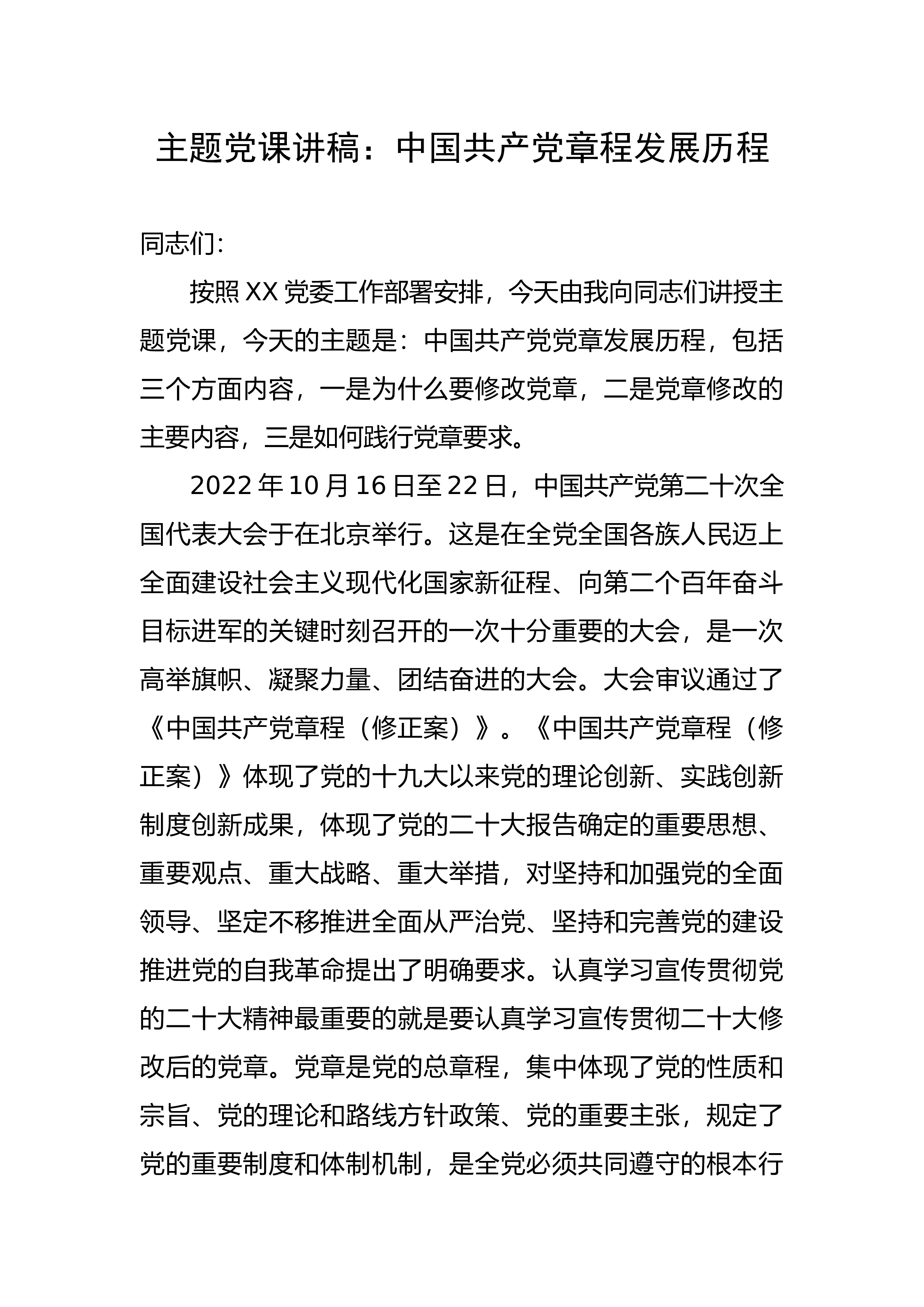 主题党课讲稿:中国共产党章程发展历程同志们:按照XX党委工作部署安排,今天由我向同志们讲授主题党课,今天的主题是:中国共产党党章发展历程,包括三个方面内容,一是为什么要修改党章,二是党章修改的主要内容,三是如何践行党章要求。2022年10月16日至22日,中国共产党第二十次全国代表大会于在北京举行。这是在全党全国各族人民迈上全面建设社会主义现代化国家新征程、向第二个百年奋斗目标进军的关键时刻召开的一次十分重要的大会,是一次高举旗帜、凝聚力量、团结奋进的大会。大会审议通过了《中国共产党章程(修正案)》。《中国共产党章程(修正案)》体现了党的十九大以来党的理论创新、实践创新制度创新成果,体现了党的...