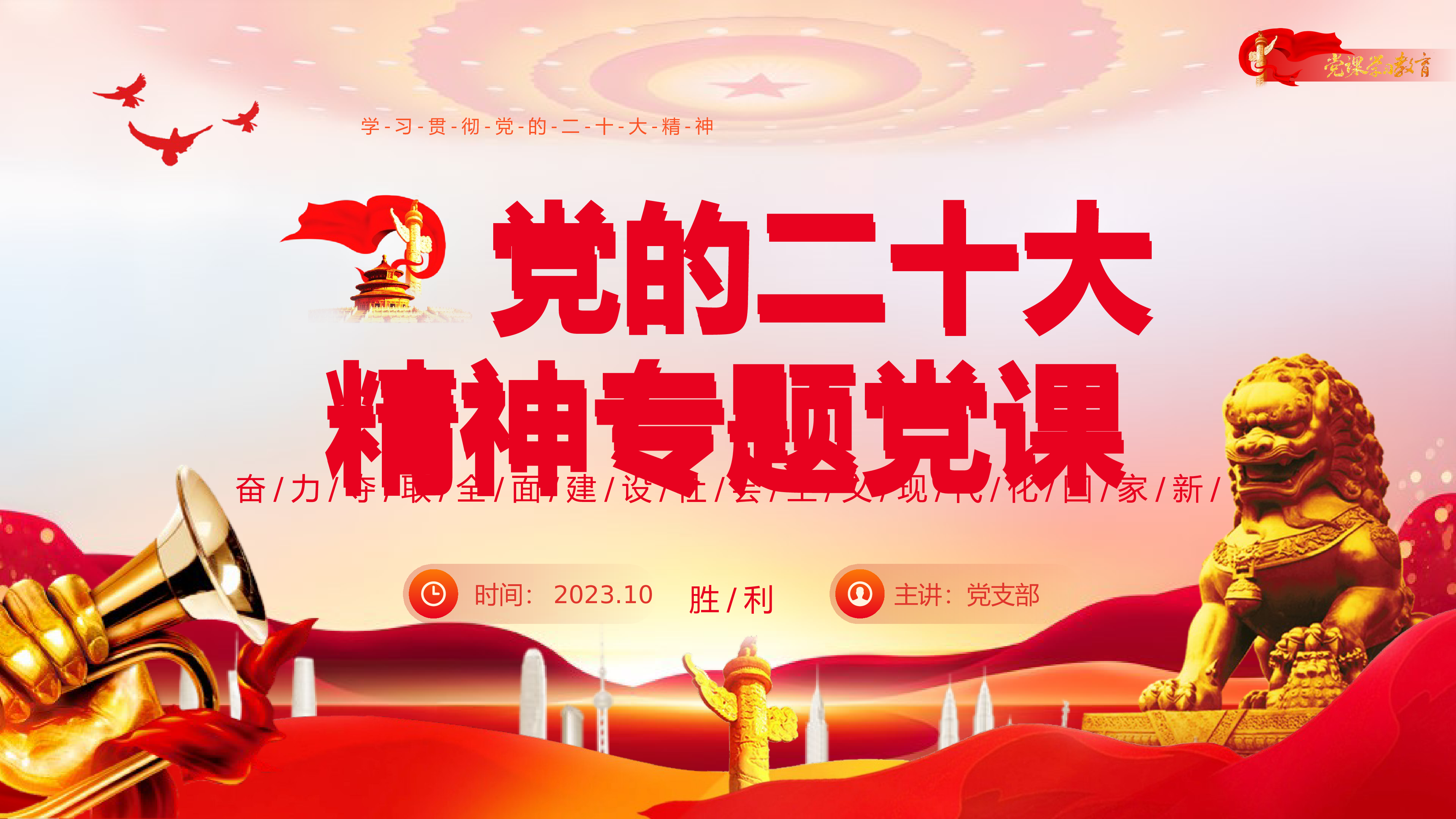 党的二十大精神专题党课主讲:党支部时间:2023.10学-习-贯-彻-党-的-二-十-大-精-神奋/力/夺/取/全/面/建/设/社/会/主/义/现/代/化/国/家/新/胜/利党的二十大精神专题党课前言前言ADDTHETITLE中国共产党第二十次全国