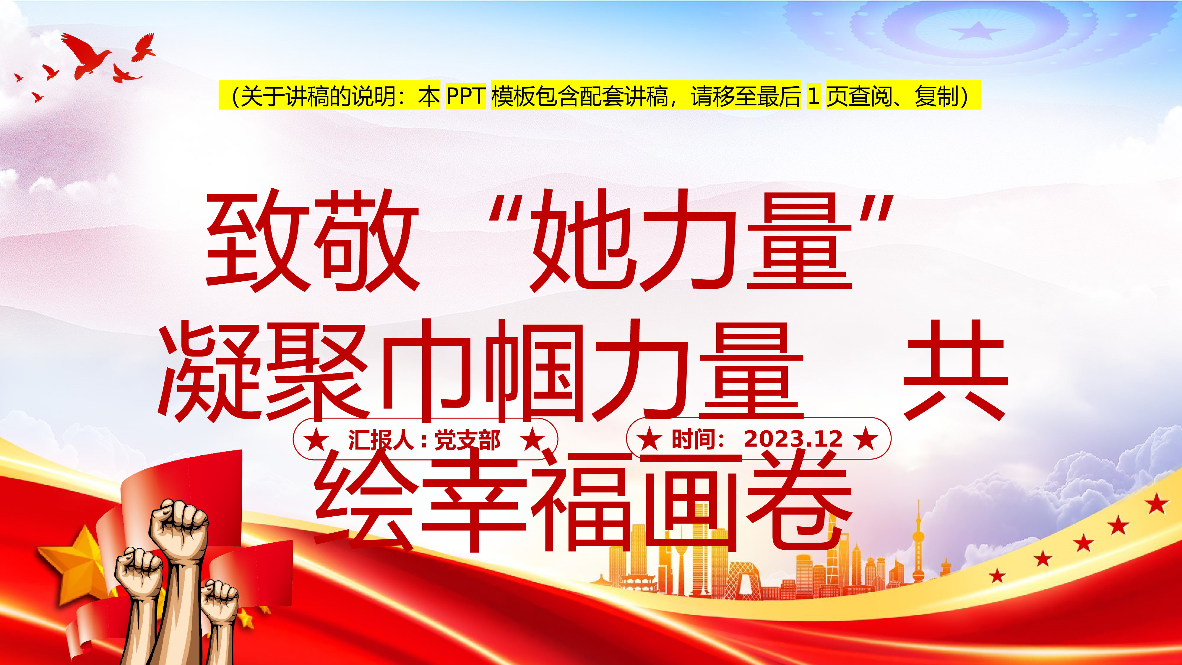 致敬“她力量”凝聚巾帼力量共绘幸福画卷汇报人:党支部时间:2023.12(关于讲稿的说明:本PPT模板包含配套讲稿,请移至最后1页查阅、复制)前言近日,中国妇女第十三次全国