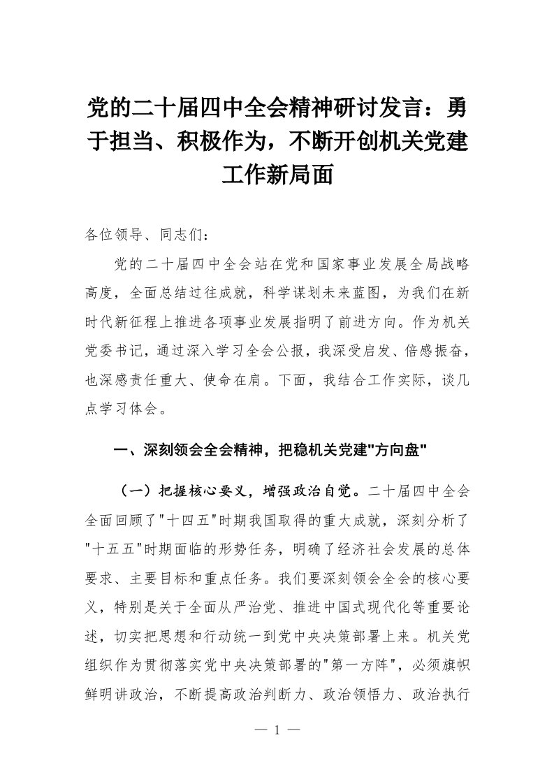 ,研讨发言,发言,工作,党建,机关党建,二十届,机关党建工作,工作新局面,全会精神党的二十届四中全会精神研讨发言勇于