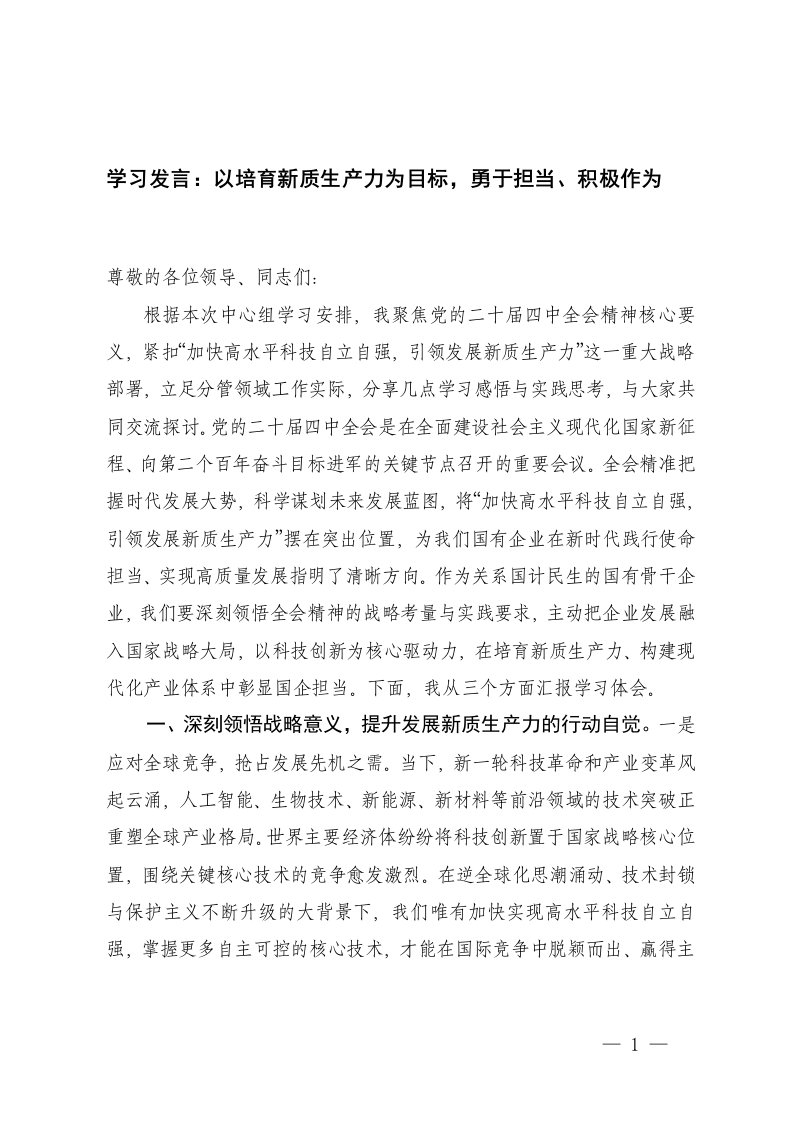 中心组学习二十届四中全会精神研讨发言以培育新质生产力为目标勇于