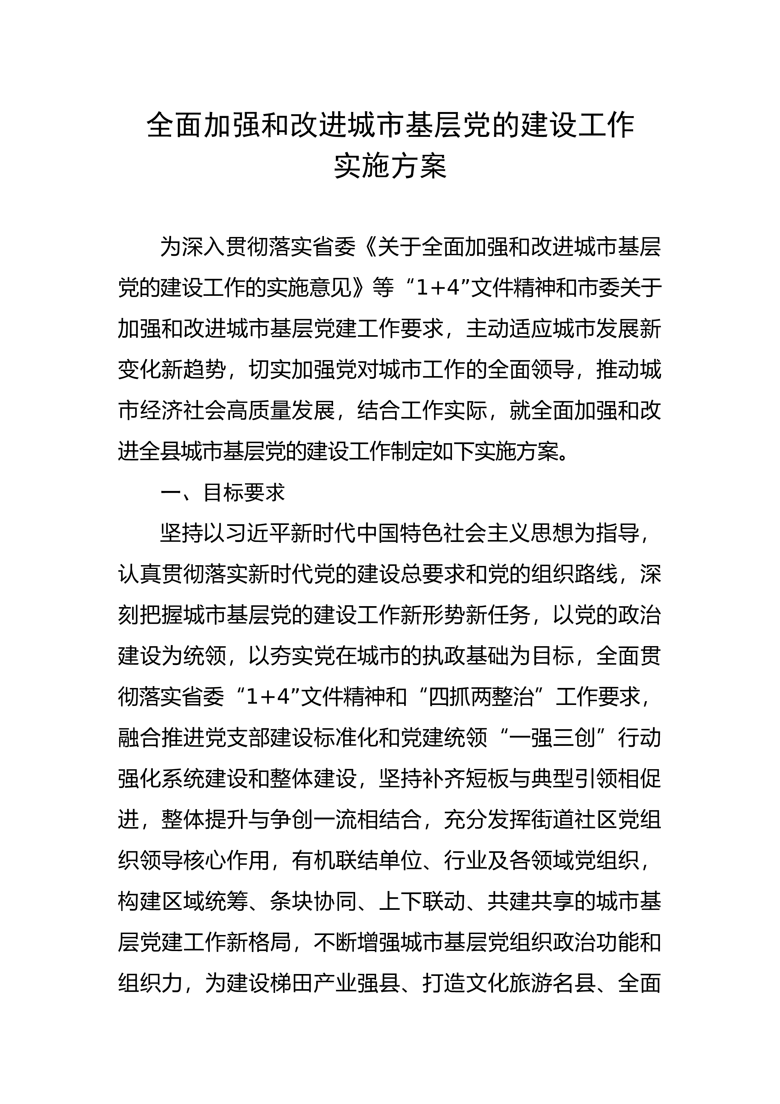 全面加强和改进城市基层党的建设工作实施方案为深入贯彻落实省委《关于全面加强和改进城市基层党的建设工作的实施意见》等“1+4”文件精神和市委关于加强和改进城市基层党建工作要求,主动适应城市发展新变化新趋势,切实加强党对城市工作的全面领导,推动城市经济社会高质量发展,结合工作实际,就全面加强和改进全县城市基层党的建设工作制定如下实施方案。一、目标要求坚持以习近平新时代中国特色社会主义思想为指导,认真贯彻落实新时代党的建设总要求和党的组织路线,深刻把握城市基层党的建设工作新形势新任务,以党的政治建设为统领,以夯实党在城市的执政基础为目标,全面贯彻落实省委“1+4”文件精神和“四抓两整治”工作要求,融...
