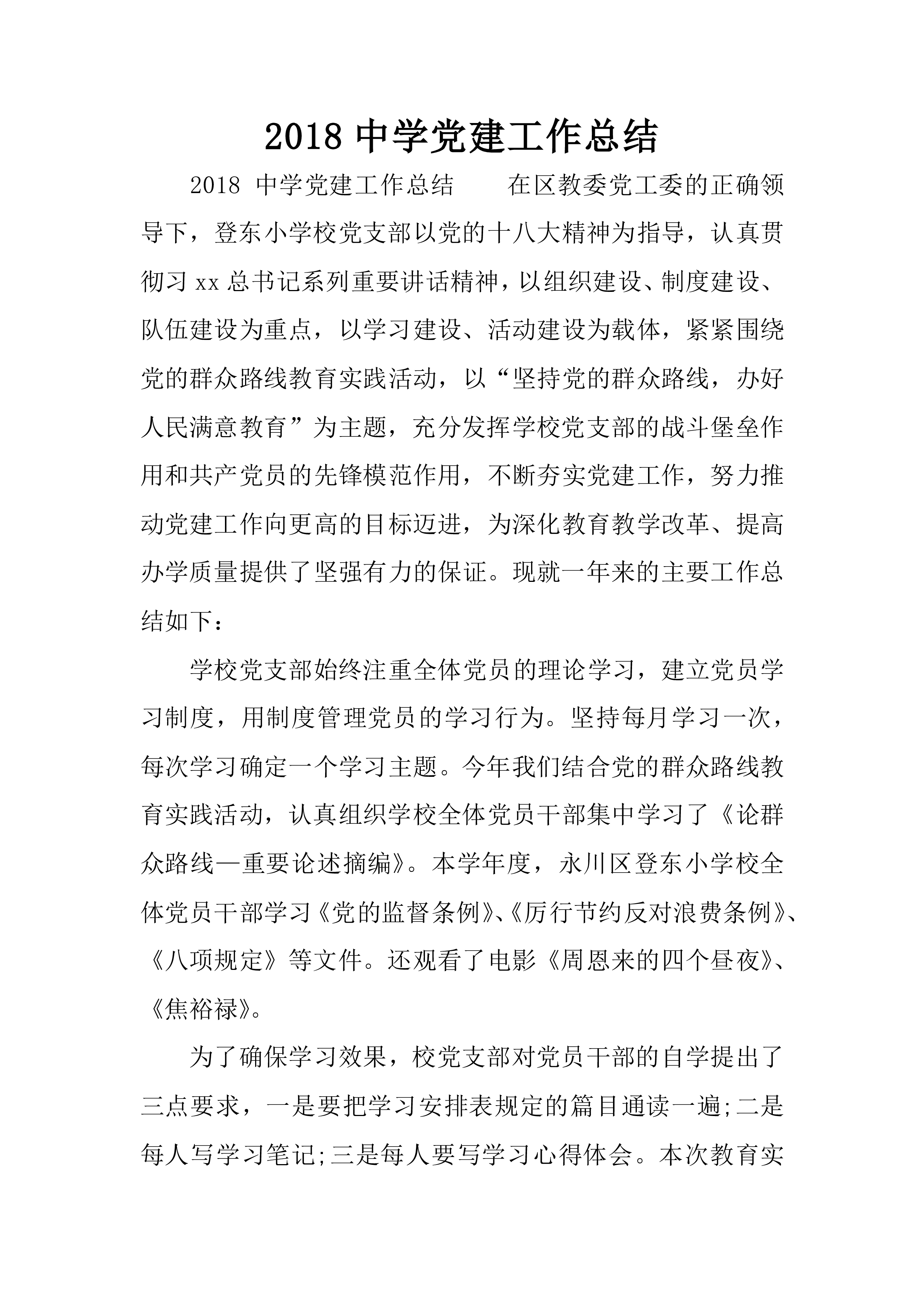 2018中学党建工作总结2018中学党建工作总结在区教委党工委的正确领导下,登东小学校党支部以党的十八大精神为指导,认真贯彻习xx总书记系列重要讲话精神,以组织建设、制度建设、队伍建设为重点,以学习建设、活动建设为载体,紧紧围绕