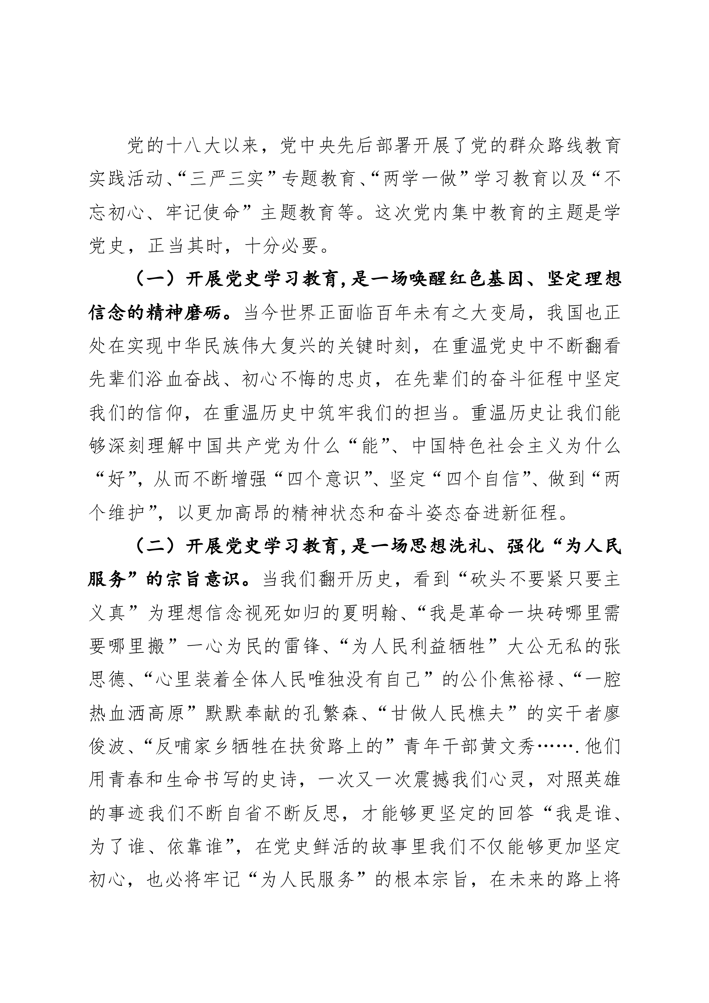 教育实践活动、“三严三实”专题教育、“两学一做”学习教育以及“不忘初心、牢记使命”教育等。这次党内集中教育的主题是学党史,正当其时,十分必要。(一)开展党史学习教育,是一场唤醒红色基因、坚定理想信念的精神磨砺。当今世界正面临百年未有之大变局,我国也正处在实现中华民族伟大复兴的关键时刻,在重温党史中不断翻看先辈们浴血奋战、初心不悔的忠贞,在先辈们的奋斗征程中坚定我们的信仰,在重温历史中筑牢我们的担当。重温历史让我们能够深刻理解中国共产党为什么“能”、中国特色社会主义为什么“好”,从而不断增强“四个意识”、坚定“四个自信”、做到“两个维护”,以更...