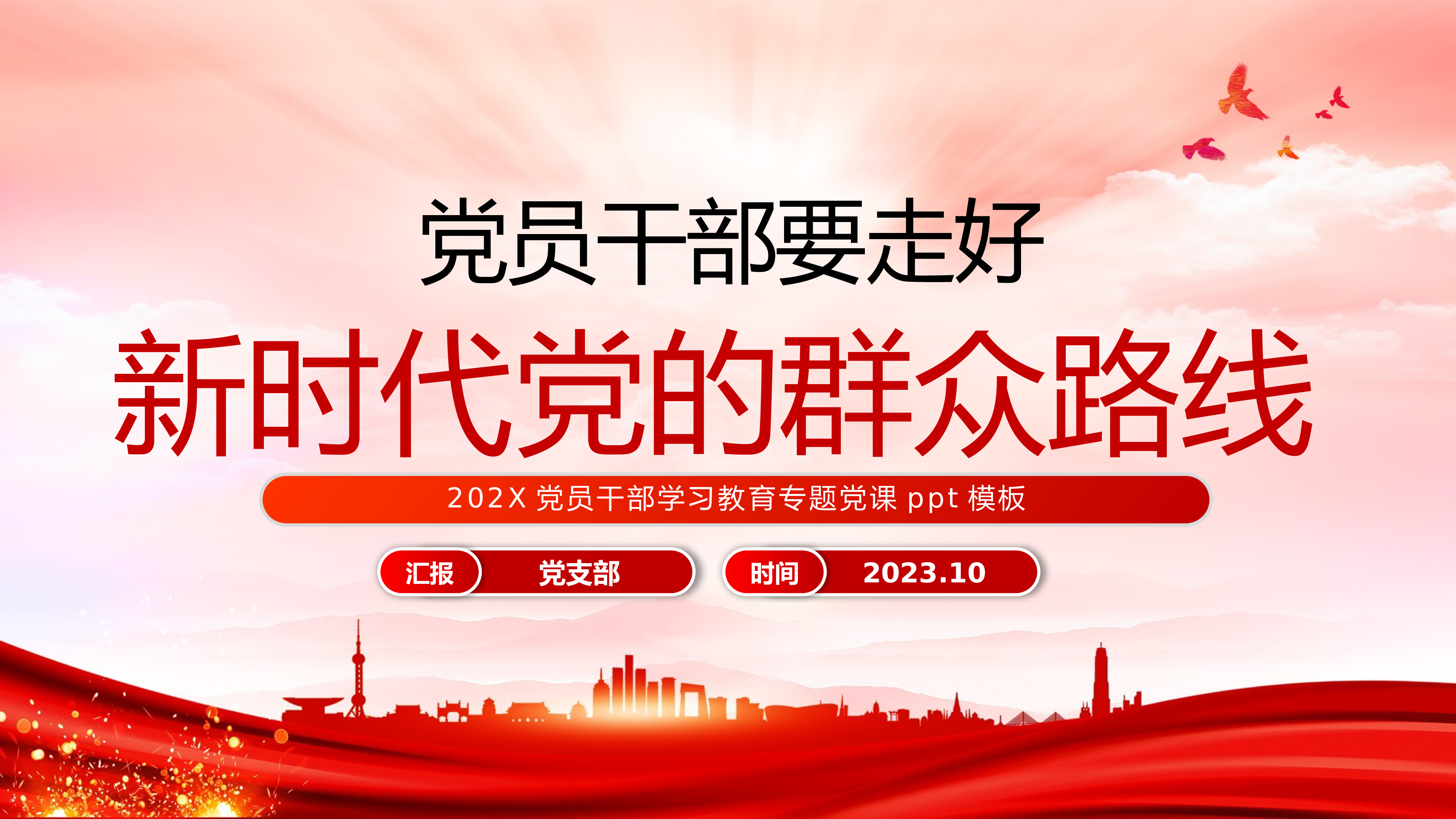 汇报党支部时间2023.10党员干部要走好新时代党的群众路线202X党员干部学习教育专题党课ppt模板领导人指出,“群众路线是我们党的生命线和根本工作路线,是我们党永葆青春活力和战斗力的重要传家宝”,“不论过去、现在和将来,我们都要坚持一切为了群众,一切依靠群众,从群众中来,到群众中去,把党的正确主张变为群众的自觉行动,把群众路线贯彻到治国理政全部活动之中。”领导人关于党的群众路线的重要论述从我们党的性质和根本宗旨出发,为新时代党员干部走好党的群众路线指明了方向,提供了根本遵循。我们要坚持用领导人新时代中国特色社会主义思想武装头脑,特别是要深入学习领悟领导人关于党的群众路线的重要指示要求,深刻...