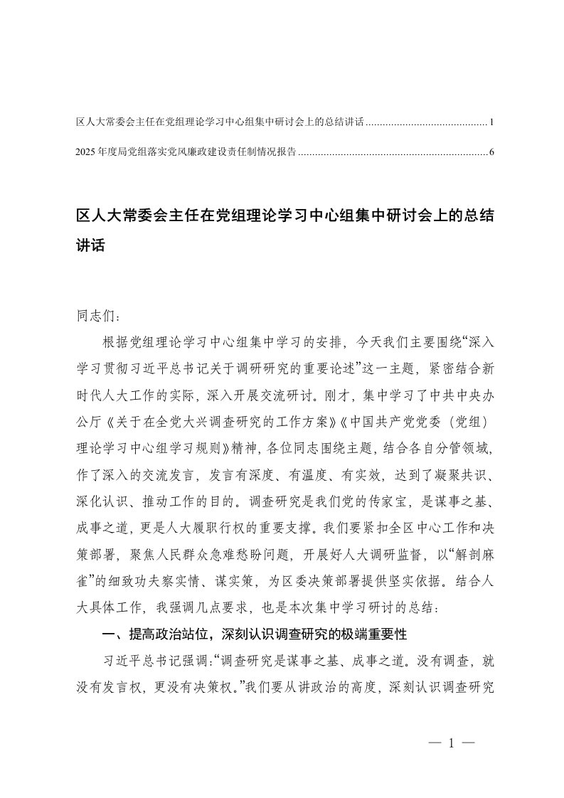 在党组理论学习中心组集中研讨会上的总结讲话2025年度局党组落实党风廉政建设责任制情况报告