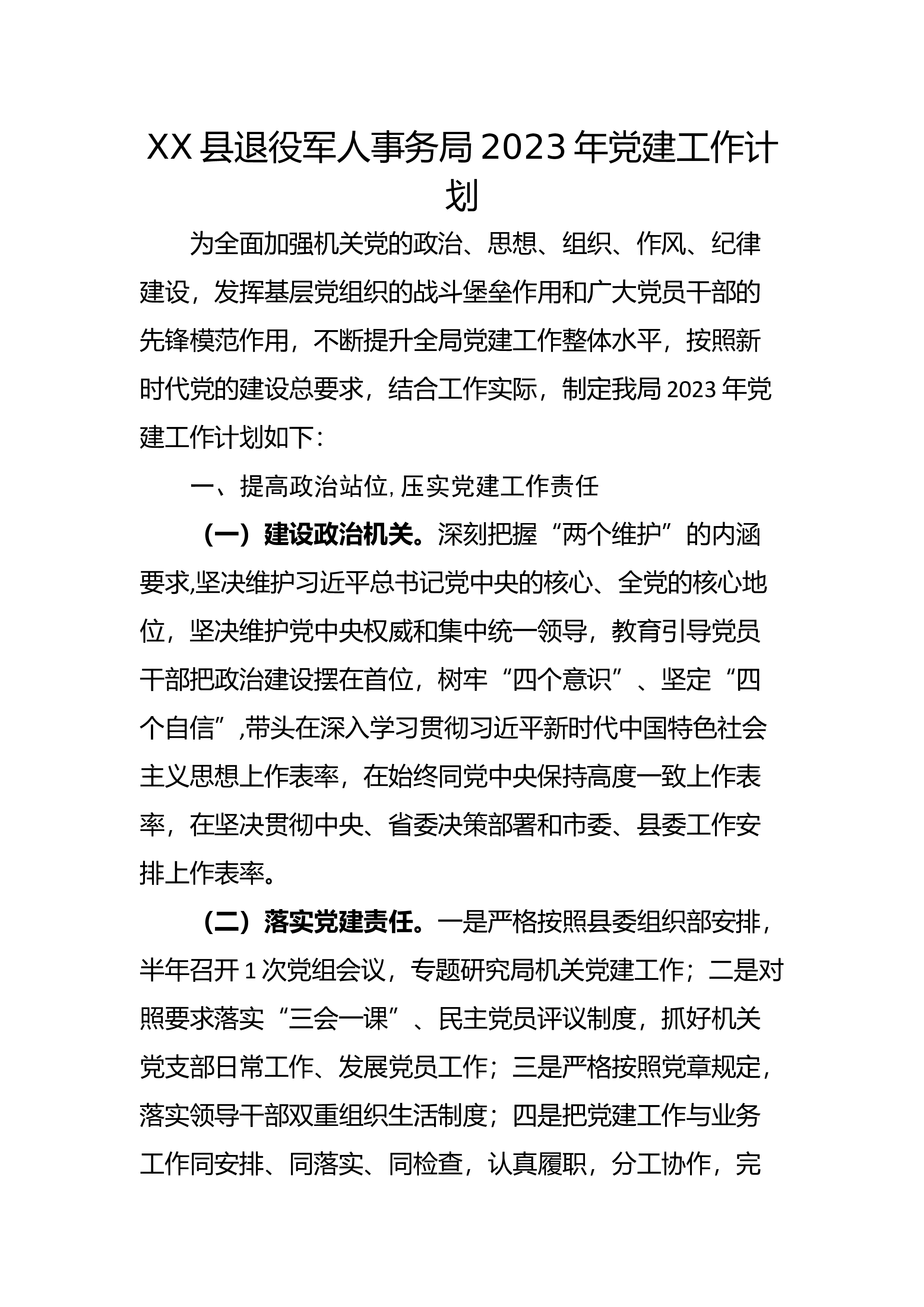 XX县退役军人事务局2023年党建工作计划为全面加强机关党的政治、思想、组织、作风、纪律建设,发挥基层党组织的战斗堡垒作用和广大党员干部的先锋模范作用,不断提升全局党建工作整体水平,按照新时代党的建设总要求,结合工作实际,制定我局2023年党建工作计划如下:一、提高政治站位,压实党建工作责任(一)建设政治机关。深刻把握“两个维护”的内涵要求,坚决维护习近平总书记党中央的核心、全党的核心地位,坚决维护党中央权威和集中统一领导,教育引导党员干部把政治建设摆在首位,树牢“四个意识”、坚定“四个自信”,带头在深入学习贯彻习近平新时代中国特色社会主义思想上作表率,在始终同党中央保持高度一致上作表率,在坚...