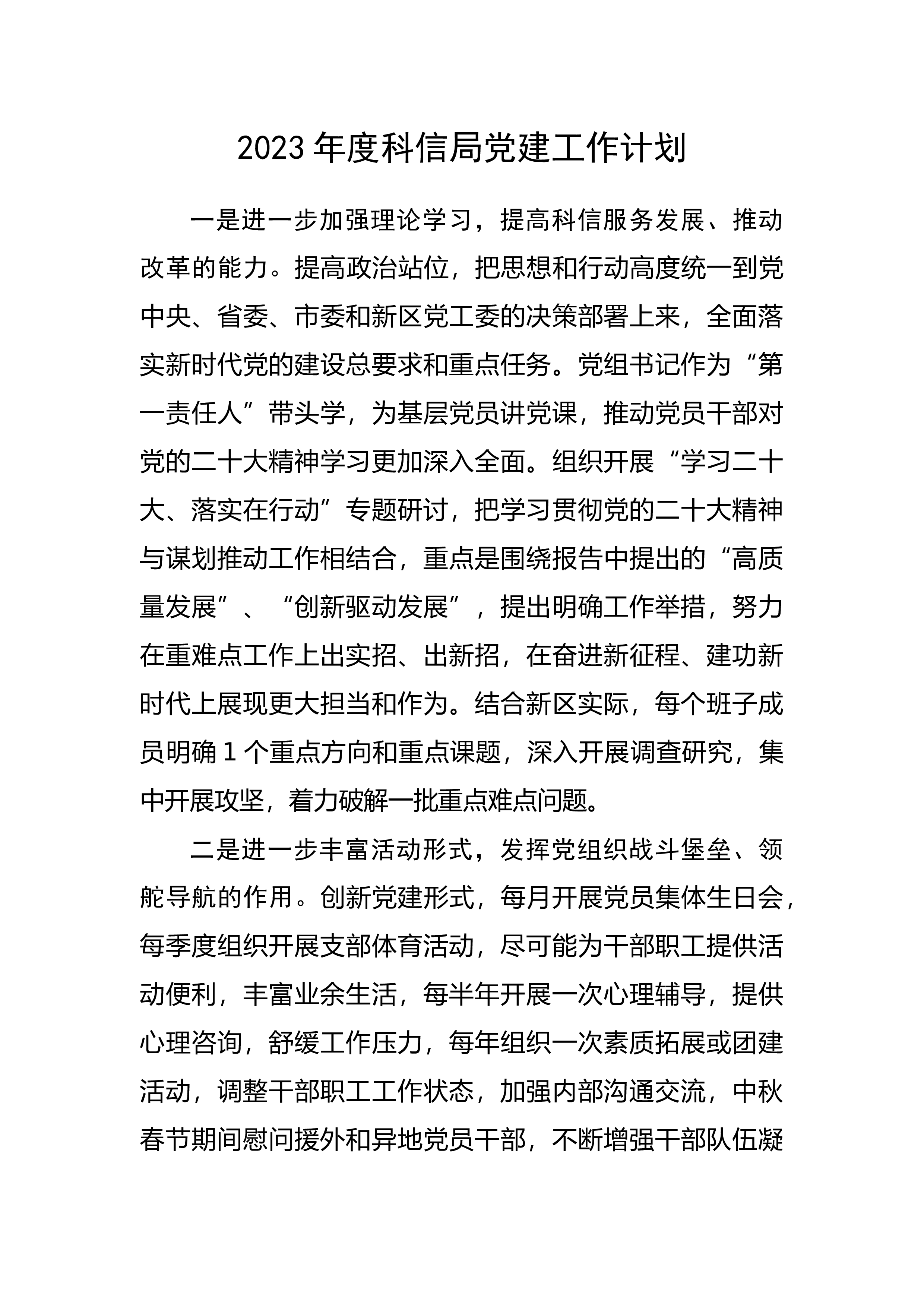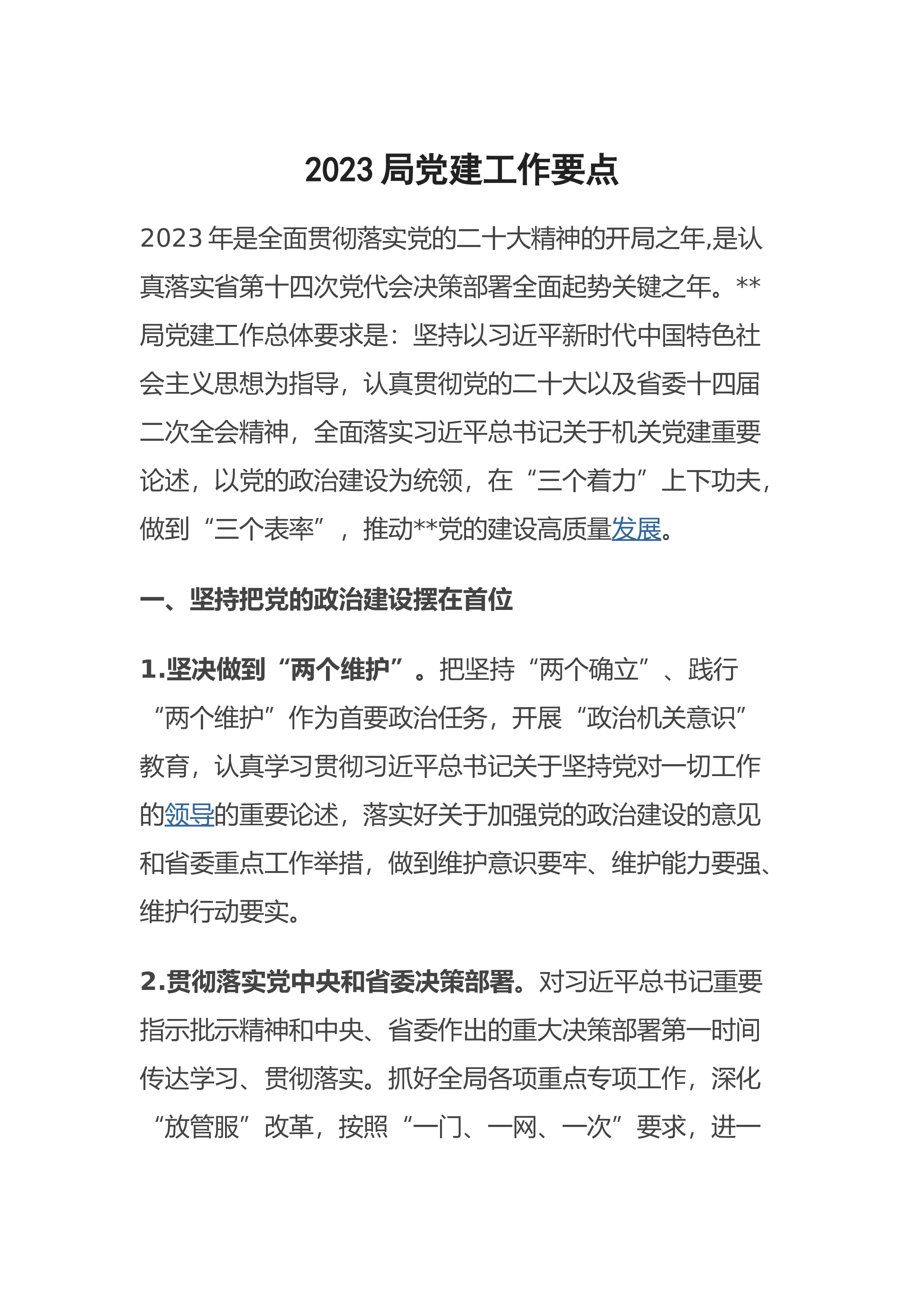 2023局党建工作要点2023年是全面贯彻落实党的二十大精神的开局之年,是认真落实省第十四次党代会决策部署全面起势关键之年。**局党建工作总体要求是:坚持以习近平新时代中国特色社会主义思想为指导,认真贯彻党的二十大以及省委十四届二次全会精神,全面落实习近平总书记关于机关党建重要论述,以党的政治建设为统领,在“三个着力”上下功夫,做到“三个表率”,推动**党的建设高质量发展。一、坚持把党的政治建设摆在首位1.坚决做到“两个维护”。把坚持“两个确立”、践行“两个维护”作为首要政治任务,开展“政治机关意识”教育,认真学习贯彻习近平总书记关于坚持党对一切工作的领导的重要论述,落实好关于加强党的政治建设...