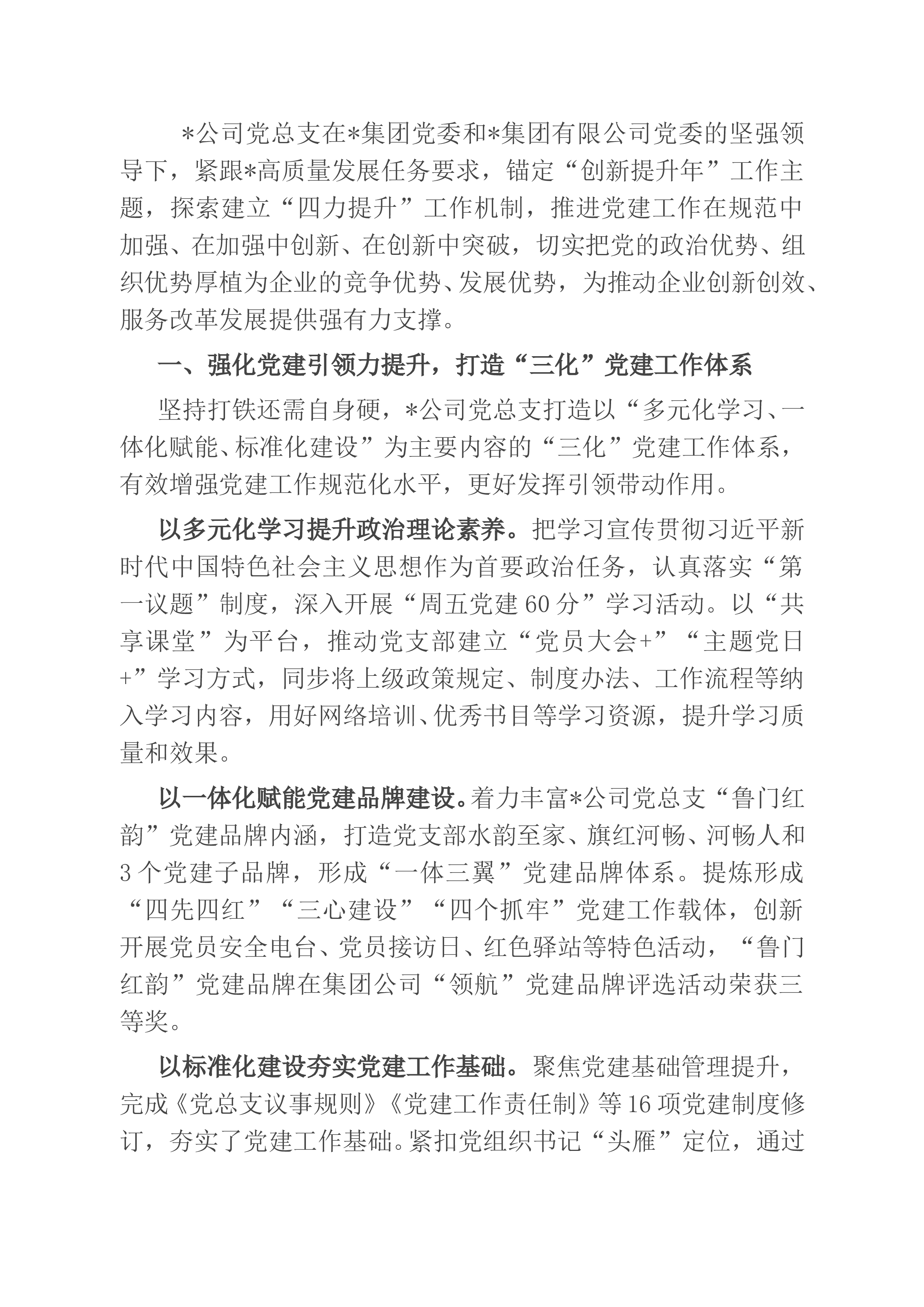我党支部始终坚持党建引领公司发展,以党建为核心,按照“党建带群建,同频促发展”思路,围绕企业中心工作、团结职工群众、服务改革创新等方面全面加强党对群团工作的领导。通过“一中心(以生产经营为中心)、五聚焦(聚焦“领”“建”“融”“凝”“创”)、五带动(带思想、带组织、带业务、带队伍、带品牌)”,大力推动党建带群建的思路、理念、方法、载体和机制创新,努力把党建优势转化为群团事业的发展优势,高效推动公司高质量发展。一、聚焦“领”,筑牢思想、把稳政治方向党支部始终以党的政治建设为统领,坚持用习近平新时代中国特色社会主义思想凝心铸魂,引导群团组织坚定正确的政治方向,促进党组织的决策部署在群团组织和职工群...