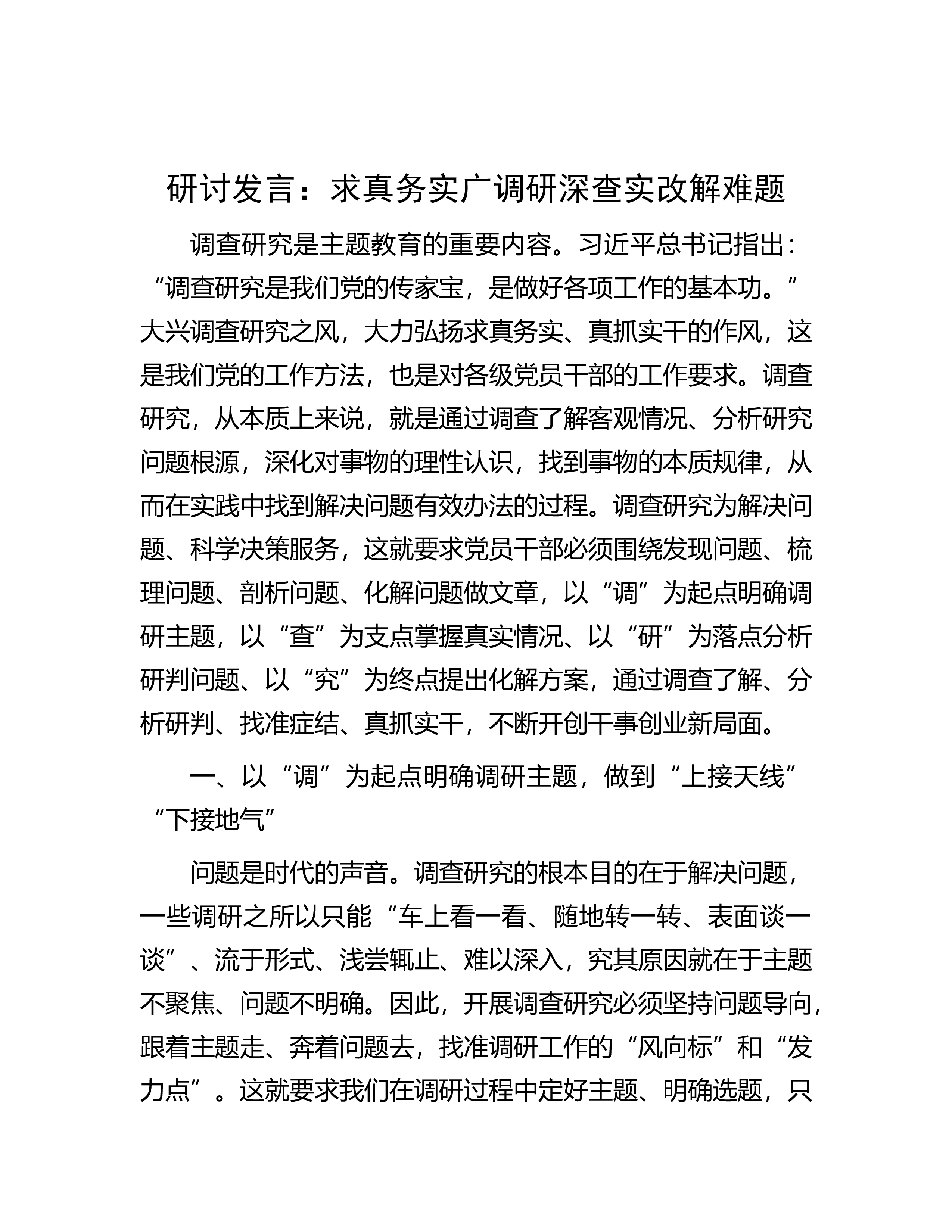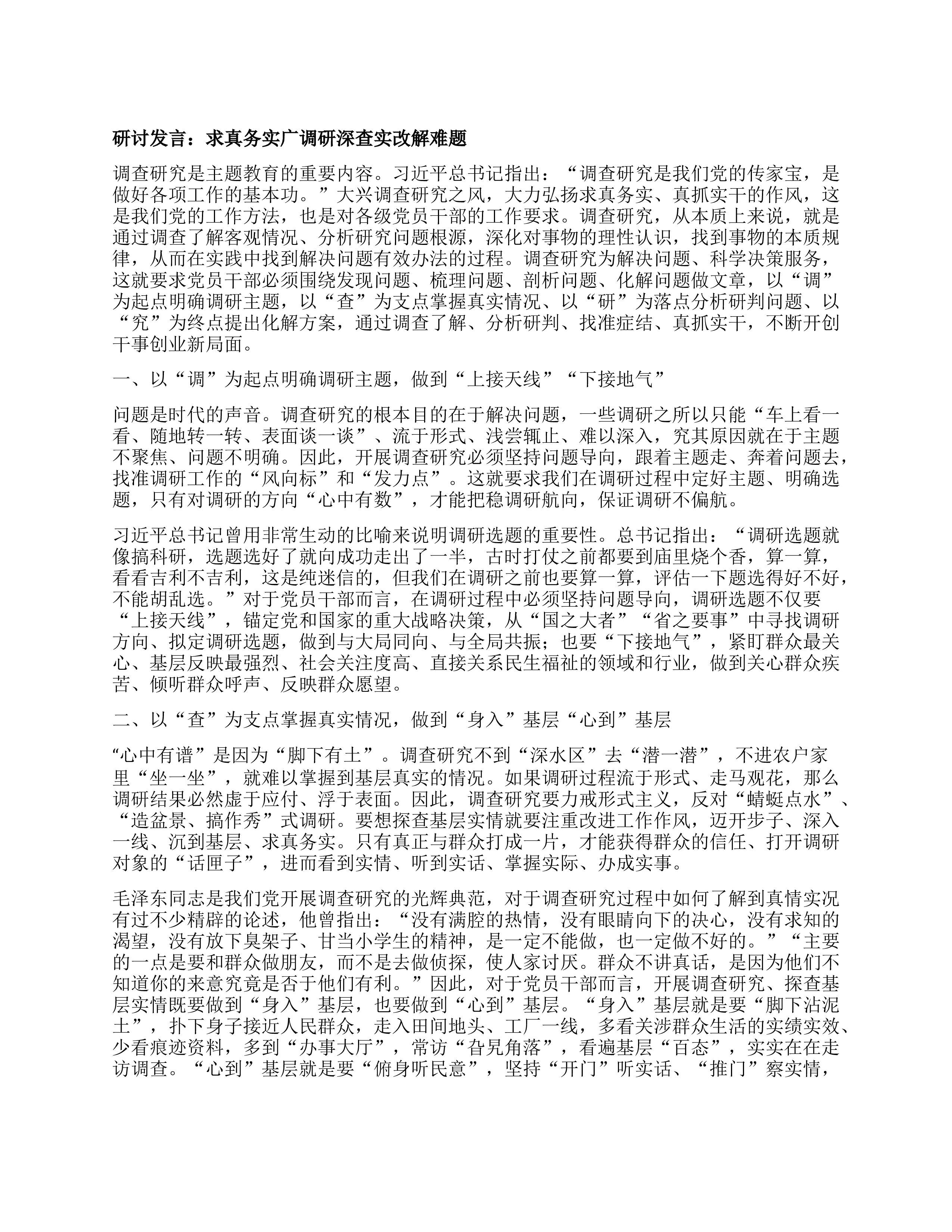 研讨发言:求真务实广调研深查实改解难题调查研究是主T教育的重要内容。习近平总书记指出:“调查研究是我们党的传家宝,是做好各项工作的基本功。”大兴调查研究之风,大力弘扬求真务实、真抓实干的作风,这是我们党的工作方法,也是对各级党员干部的工作要求。调查研究,从本质上来说,就是通过调查了解客观情况、分析研究问题根源,深化对事物的理性认识,找到事物的本质规律,从而在实践中找到解决问题有效办法的过程。调查研究为解决问题、科学决策服务,这就要求党员干部必须围绕发现问题、梳理问题、剖析问题、化解问题做文章,以“调”为起点明确调研主题,以“查”为支点掌握真实情况、以“研”为落点分析研判问题、以“究”为终点提出...