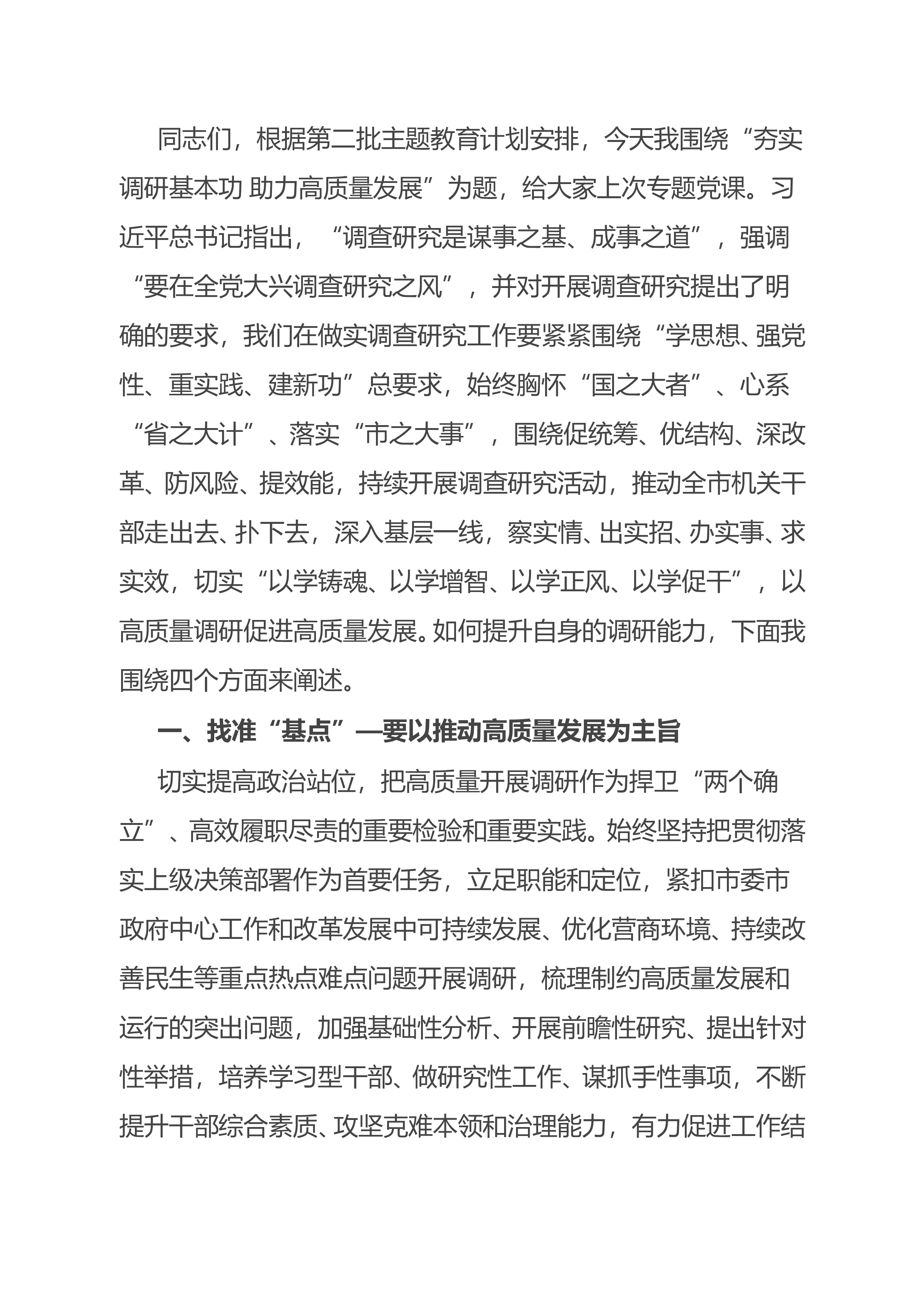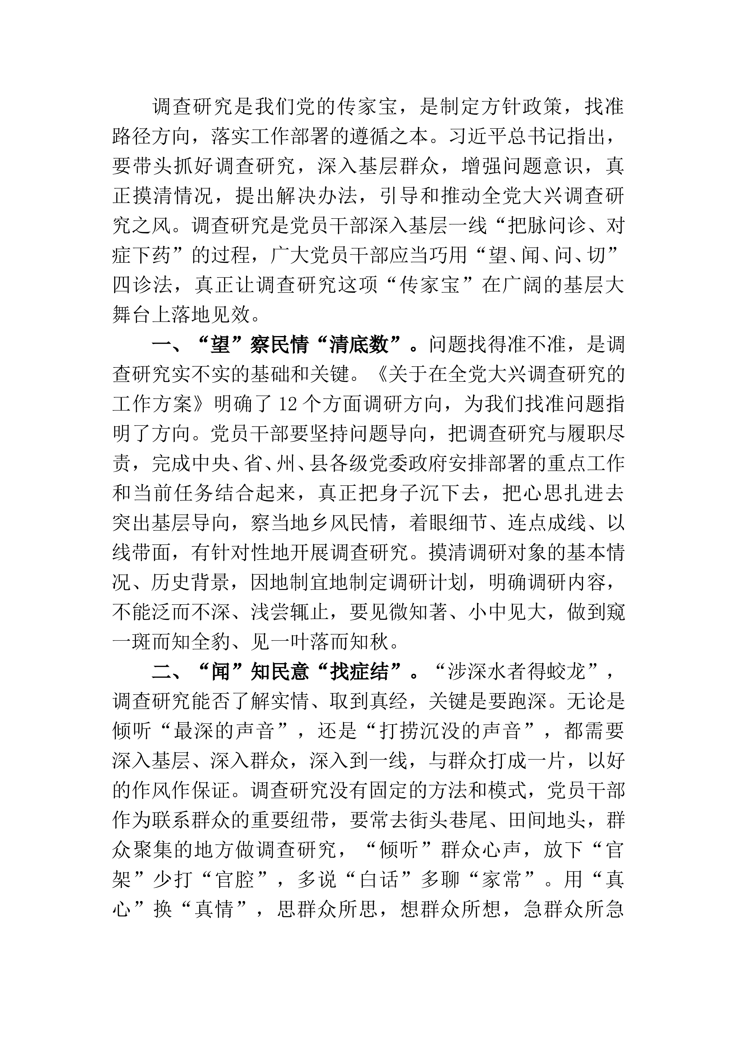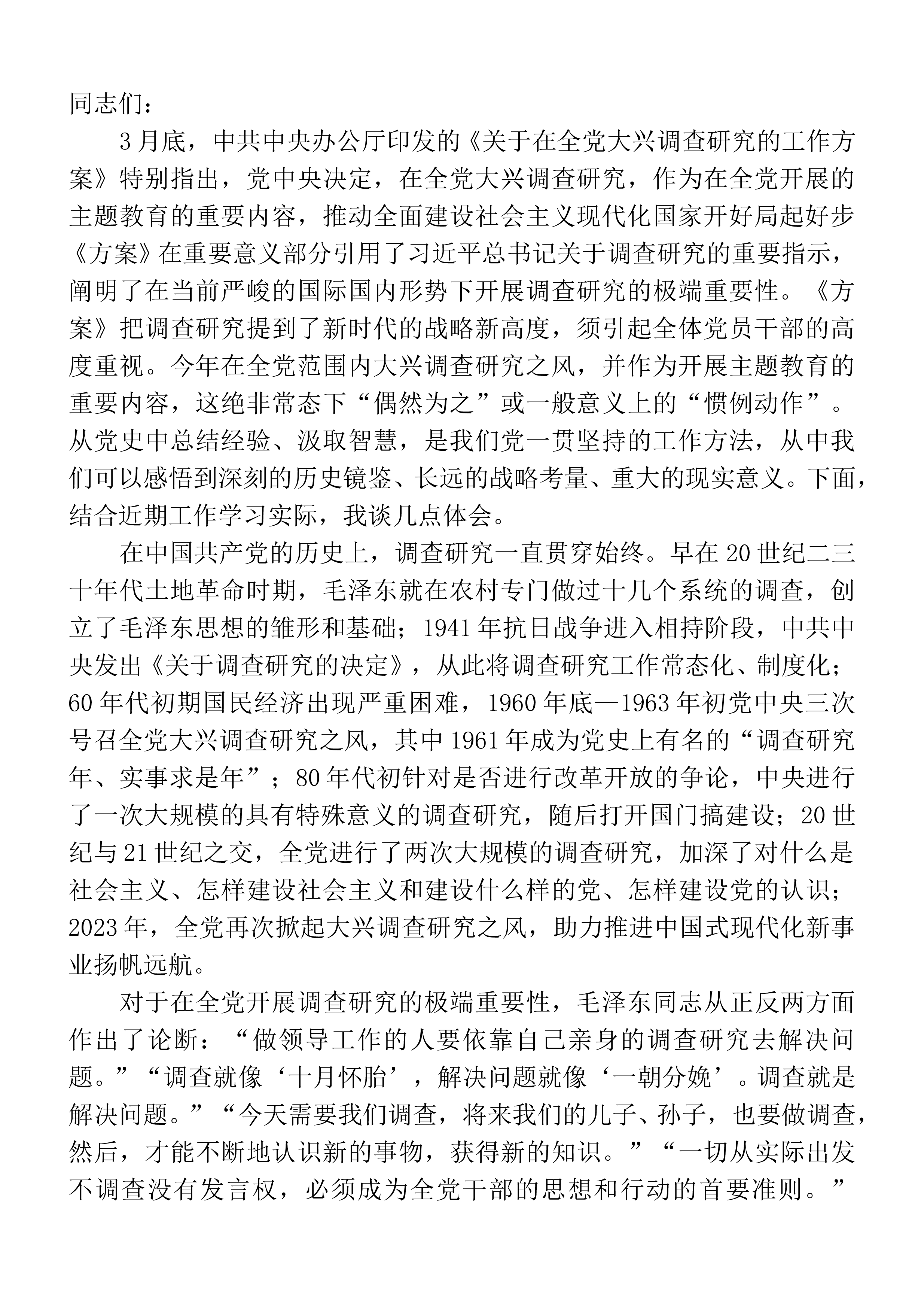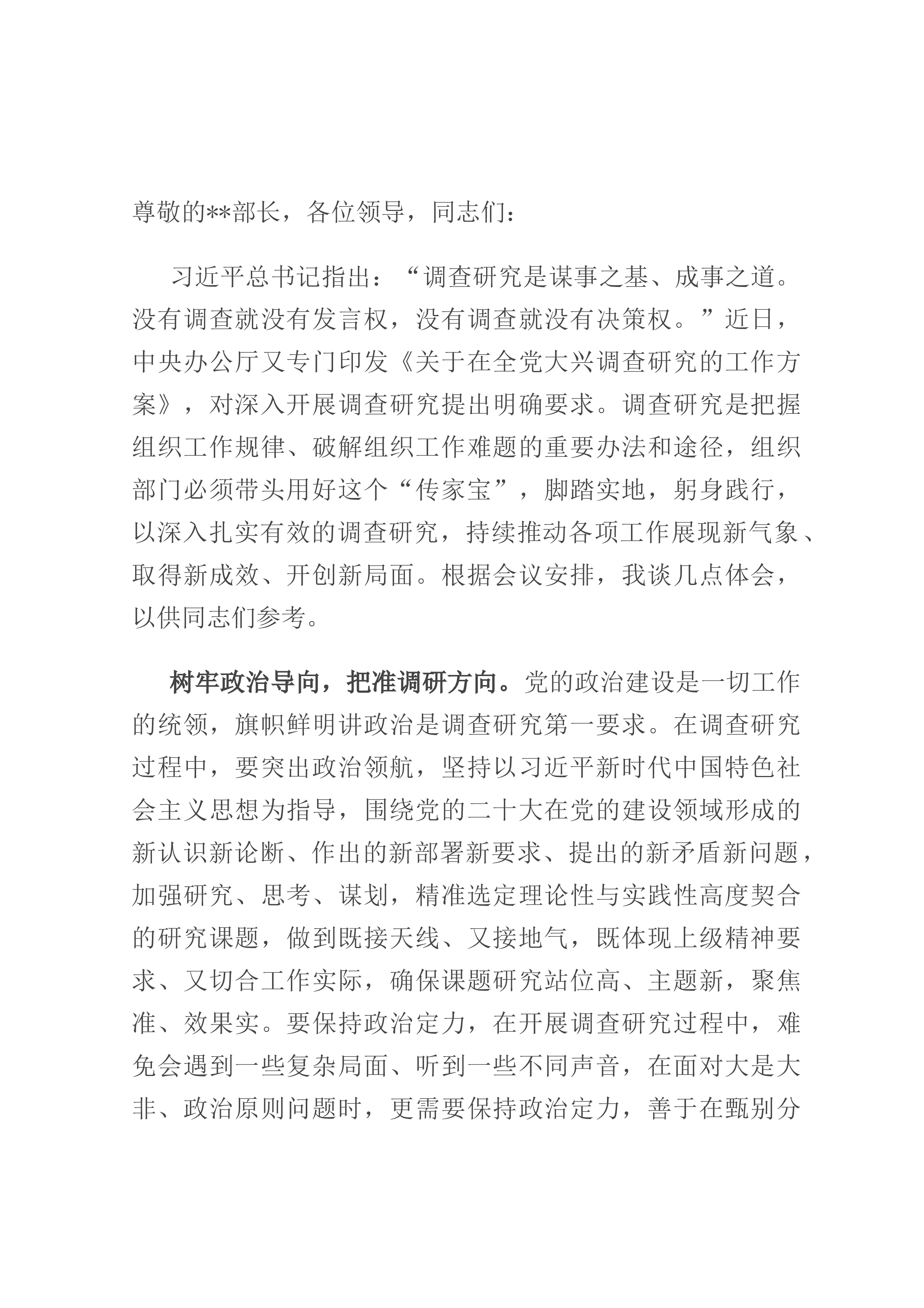 尊敬的**部长,各位领导,同志们:习近平总书记指出:“调查研究是谋事之基、成事之道。没有调查就没有发言权,没有调查就没有决策权。”近日,中央办公厅又专门印发《关于在全党大兴调查研究的工作方案》,对深入开展调查研究提出明确要求。调查研究是把握组织工作规律、破解组织工作难题的重要办法和途径,组织部门必须带头用好这个“传家宝”,脚踏实地,躬身践行,以深入扎实有效的调查研究,持续推动各项工作展现新气象、取得新成效、开创新局面。根据会议安排,我谈几点体会,以供同志们参考。树牢政治导向,把准调研方向。党的政治建设是一切工作的统领,旗帜鲜明讲政治是调查研究第一要求。在调查研究过程中,要突出政治领航,坚持以习...