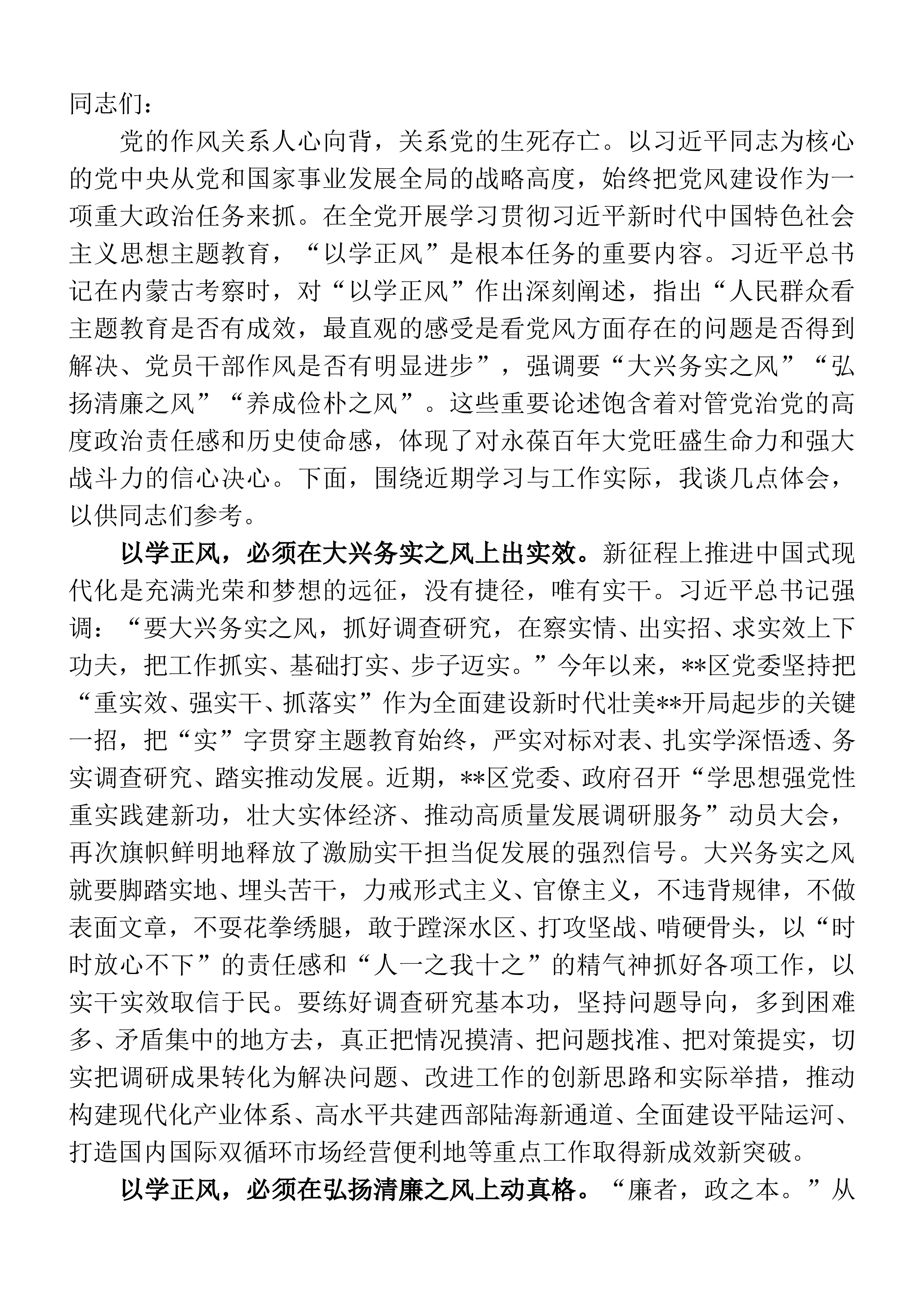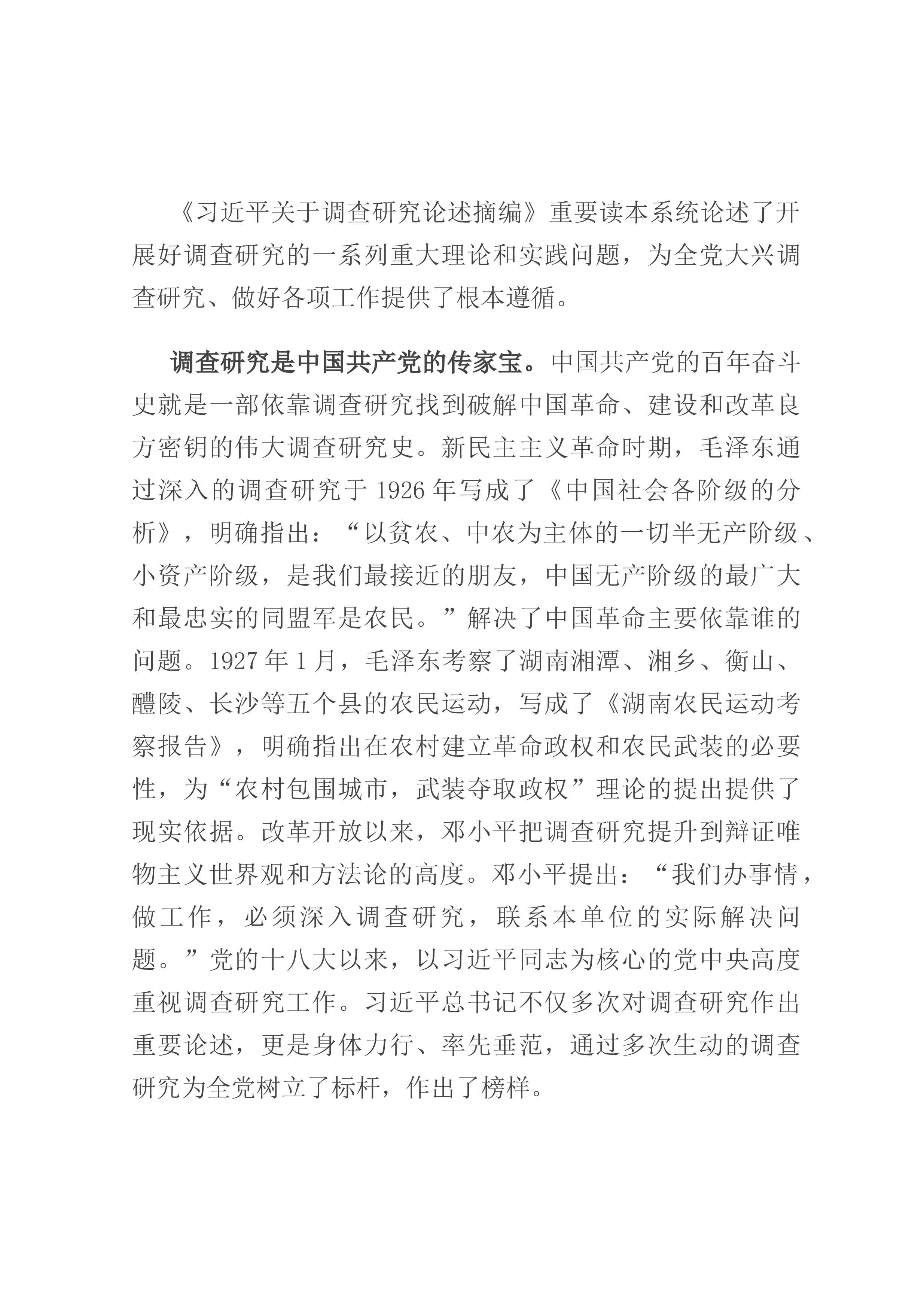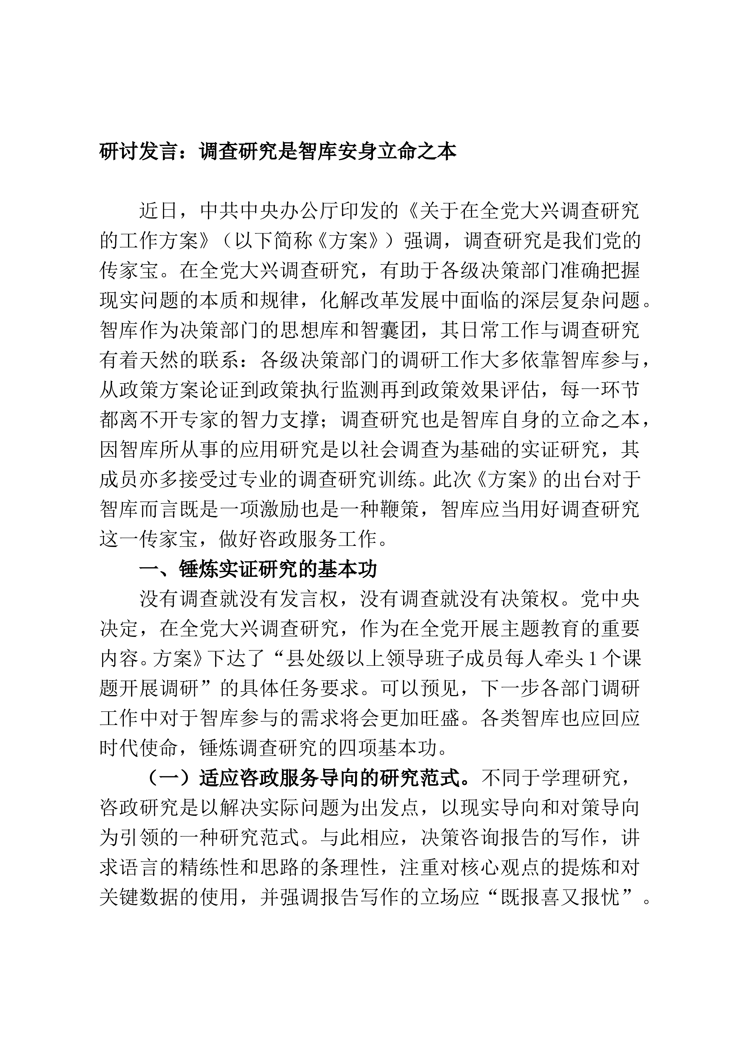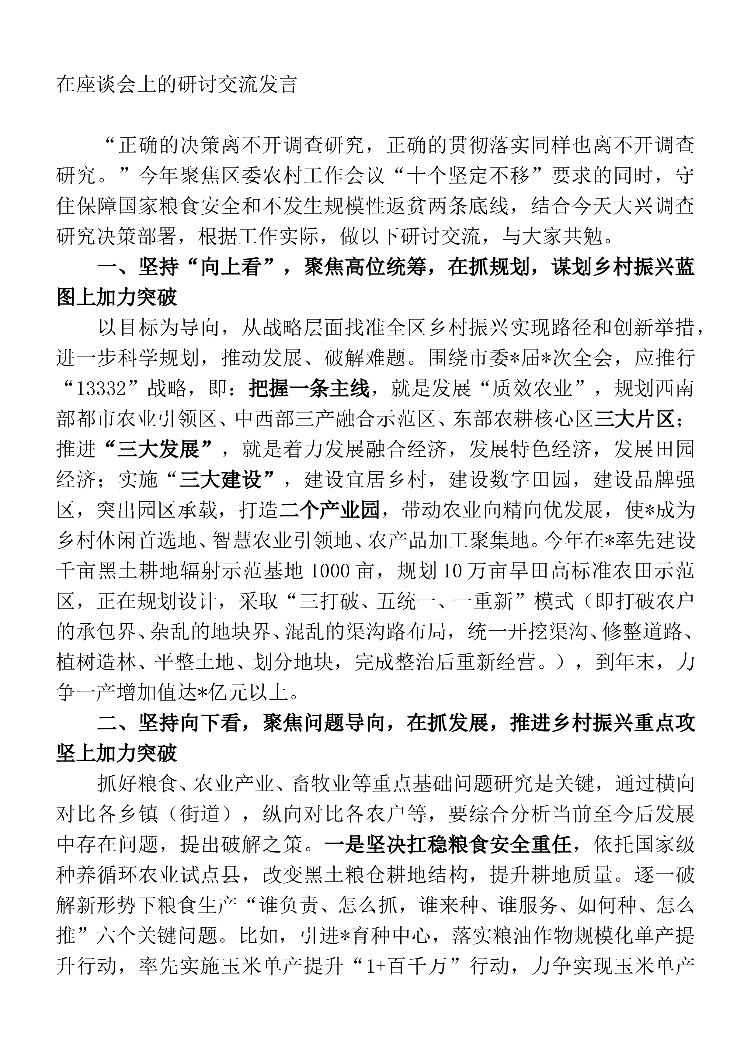 尊敬的**部长,各位领导,同志们:习近平总书记指出:“调查研究是谋事之基、成事之道。没有调查就没有发言权,没有调查就没有决策权。”近日,中央办公厅又专门印发《关于在全党大兴调查研究的工作方案》,对深入开展调查研究提出明确要求。调查研究是把握组织工作规律、破解组织工作难题的重要办法和途径,组织部门必须带头用好这个“传家宝”,脚踏实地,躬身践行,以深入扎实有效的调查研究,持续推动各项工作展现新气象、取得新成效、开创新局面。根据会议安排,我谈几点体会,以供同志们参考。树牢政治导向,把准调研方向。党的政治建设是一切工作的统领,旗帜鲜明讲政治是调查研究第一要求。在调查研究过程中,要突出政治领航,坚持以习...