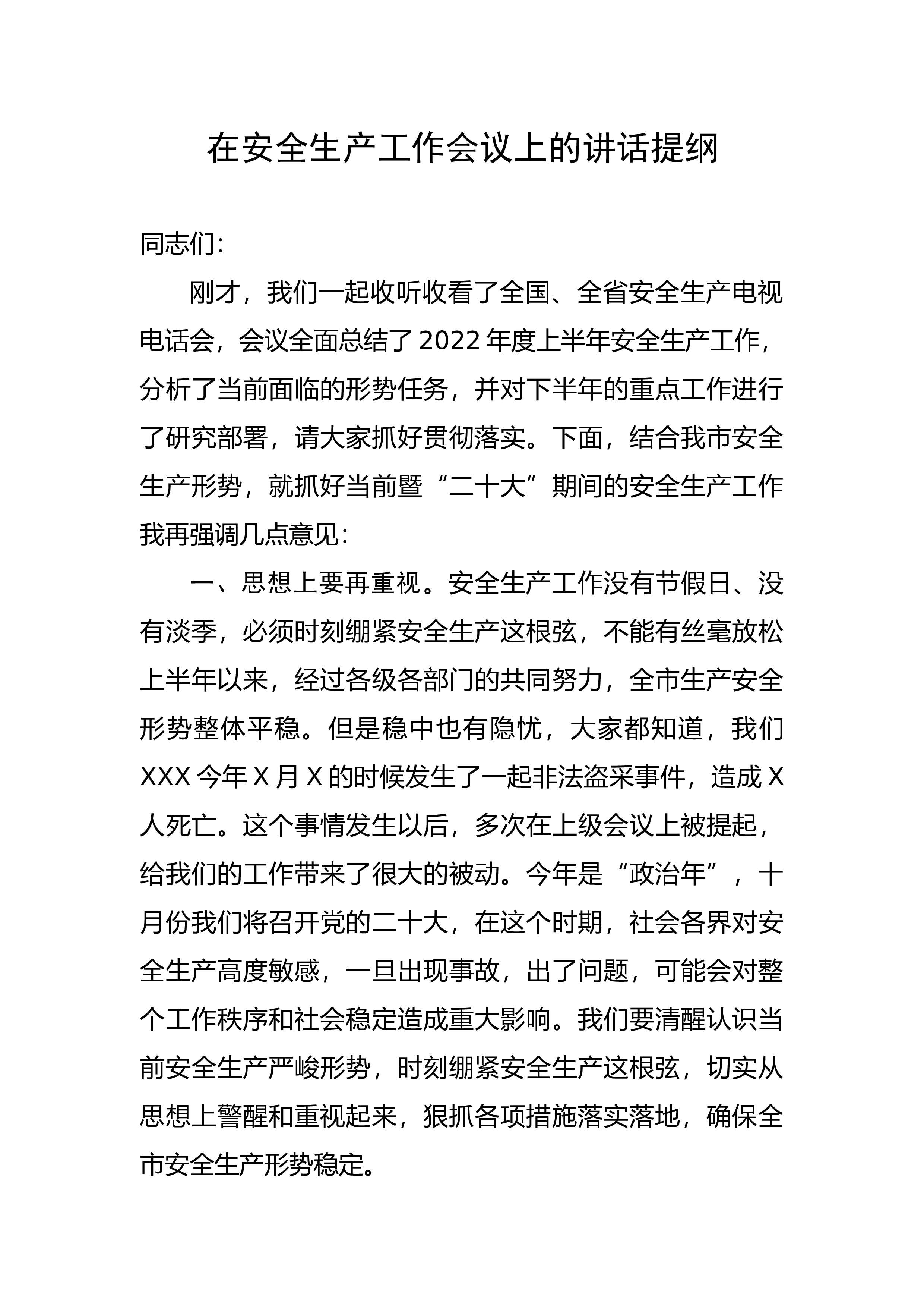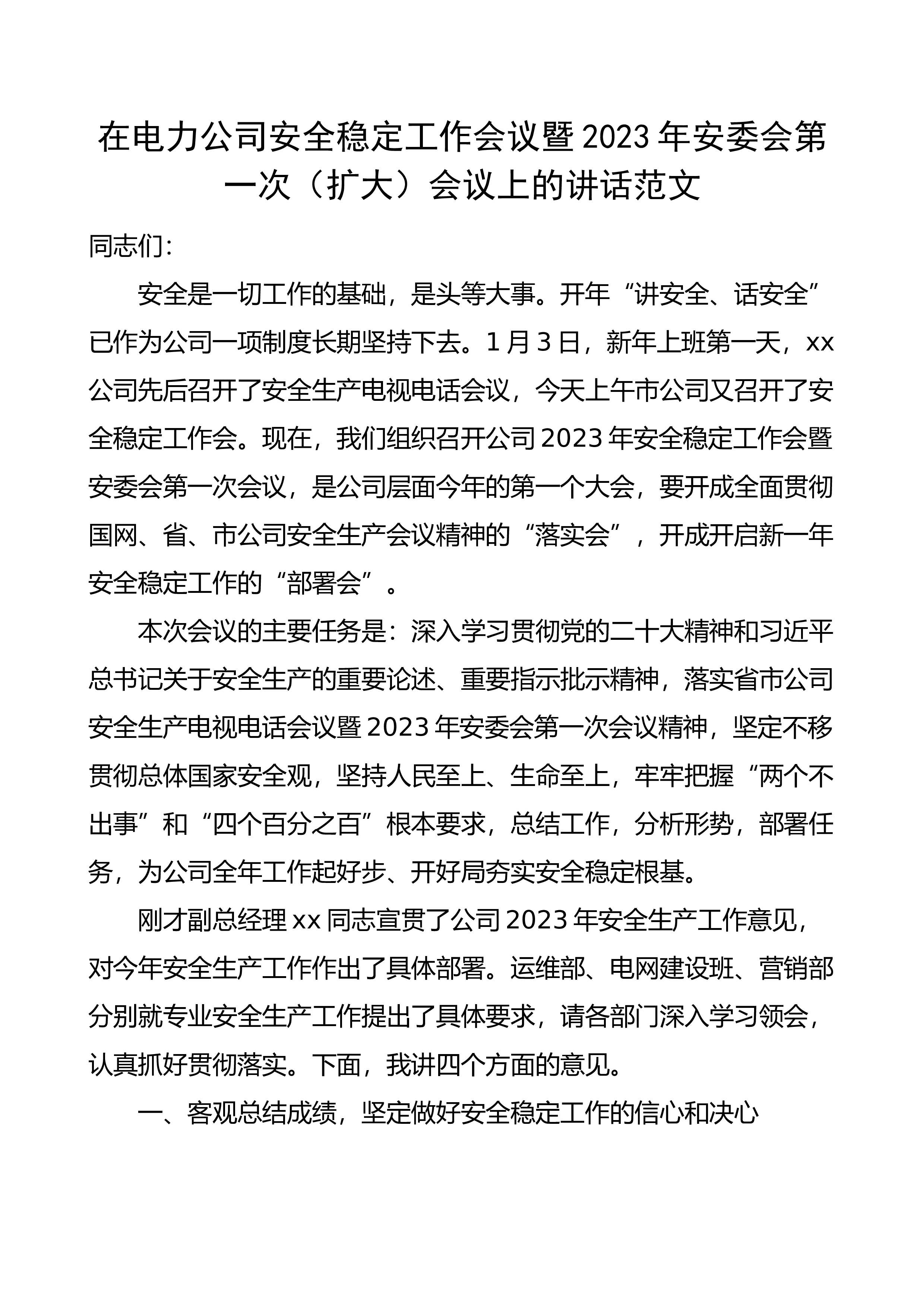 在电力公司安全稳定工作会议暨2023年安委会第一次(扩大)会议上的讲话范文同志们:安全是一切工作的基础,是头等大事。开年“讲安全、话安全”已作为公司一项制度长期坚持下去。1月3日,新年上班第一天,xx公司先后召开了安全生产电视电话会议,今天上午市公司又召开了安全稳定工作会。现在,我们组织召开公司2023年安全稳定工作会暨安委会第一次会议,是公司层面今年的第一个大会,要开成全面贯彻国网、省、市公司安全生产会议精神的“落实会”,开成开启新一年安全稳定工作的“部署会”。本次会议的主要任务是:深入学习贯彻党的二十大精神和习近平总书记关于安全生产的重要论述、重要指示批示精神,落实省市公司安全生产电视电话...
