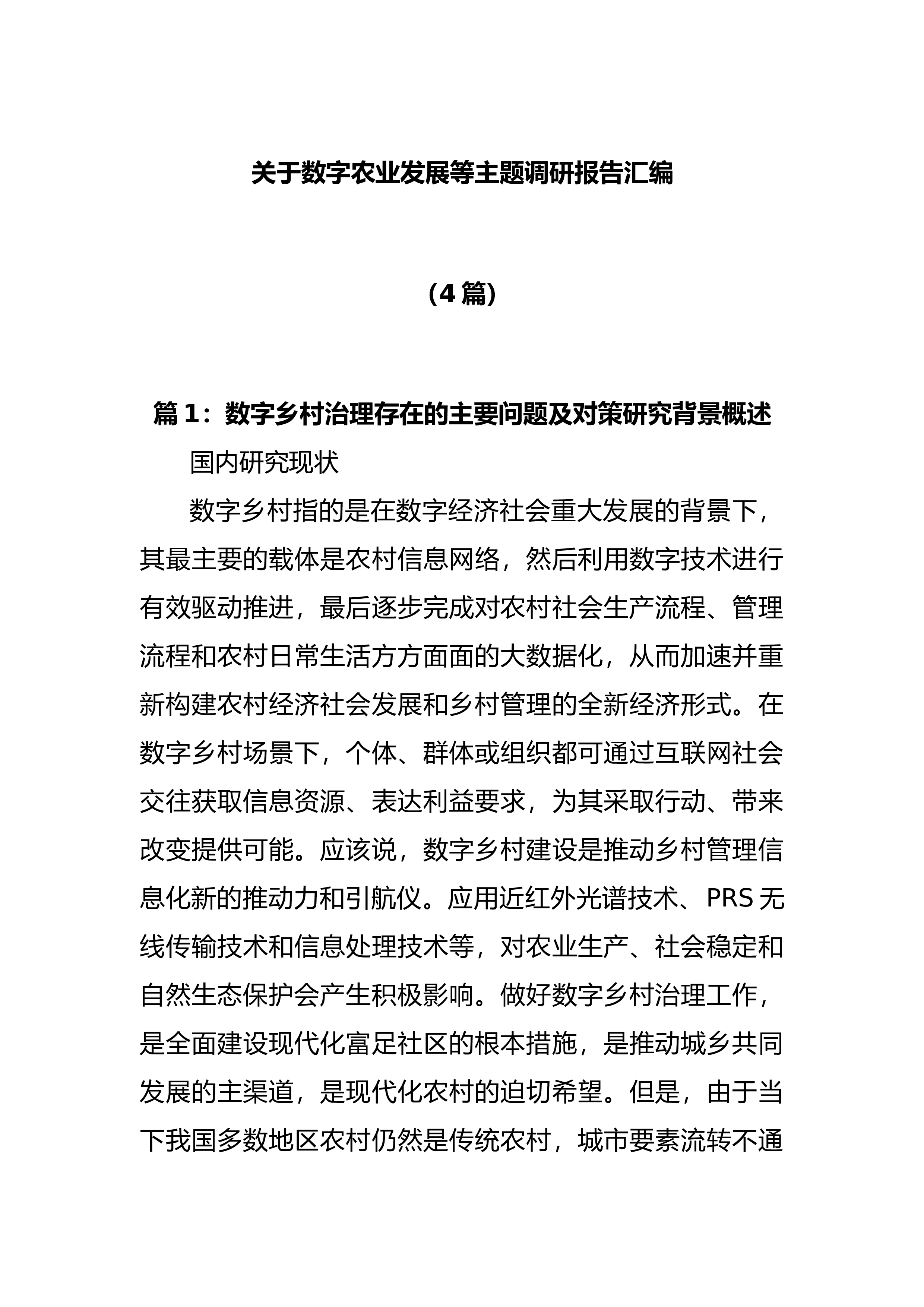 关于数字农业发展等主题调研报告汇编(4篇)篇1:数字乡村治理存在的主要问题及对策研究背景概述国内研究现状数字乡村指的是在数字经济社会重大发展的背景下,其最主要的载体是农村信息网络,然后利用数字技术进行有效驱动推进,最后逐步完成对农村社会生产流程、管理流程和农村日常生活方方面面的大数据化,从而加速并重新构建农村经济社会发展和乡村管理的全新经济形式。在数字乡村场景下,个体、群体或组织都可通过互联网社会交往获取信息资源、表达利益要求,为其采取行动、带来改变提供可能。应该说,数字乡村建设是推动乡村管理信息化新的推动力和引航仪。应用近红外光谱技术、PRS无线传输技术和信息处理技术等,对农业生产、社会稳定...
