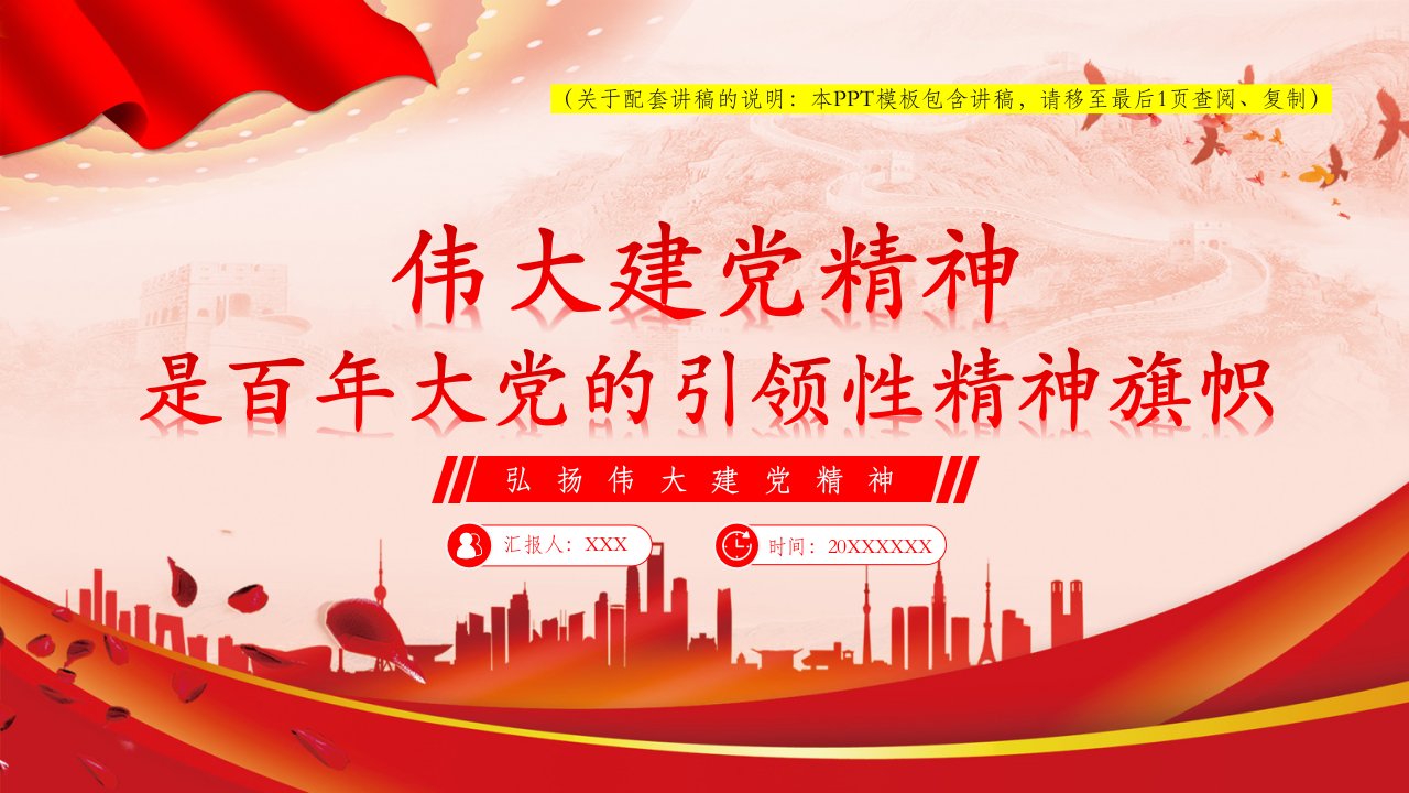 2024微党课伟大建党精神是百年大党的引领性精神旗帜在党的二十大报告中指出:“弘扬伟大建党精神,自信自强、守正创新,踔厉奋发、勇毅前行,为全面建设社会主义现代化国家、全面推进中华民族伟大复兴而团结奋斗。”(带内容)讲党课ppt模板下载