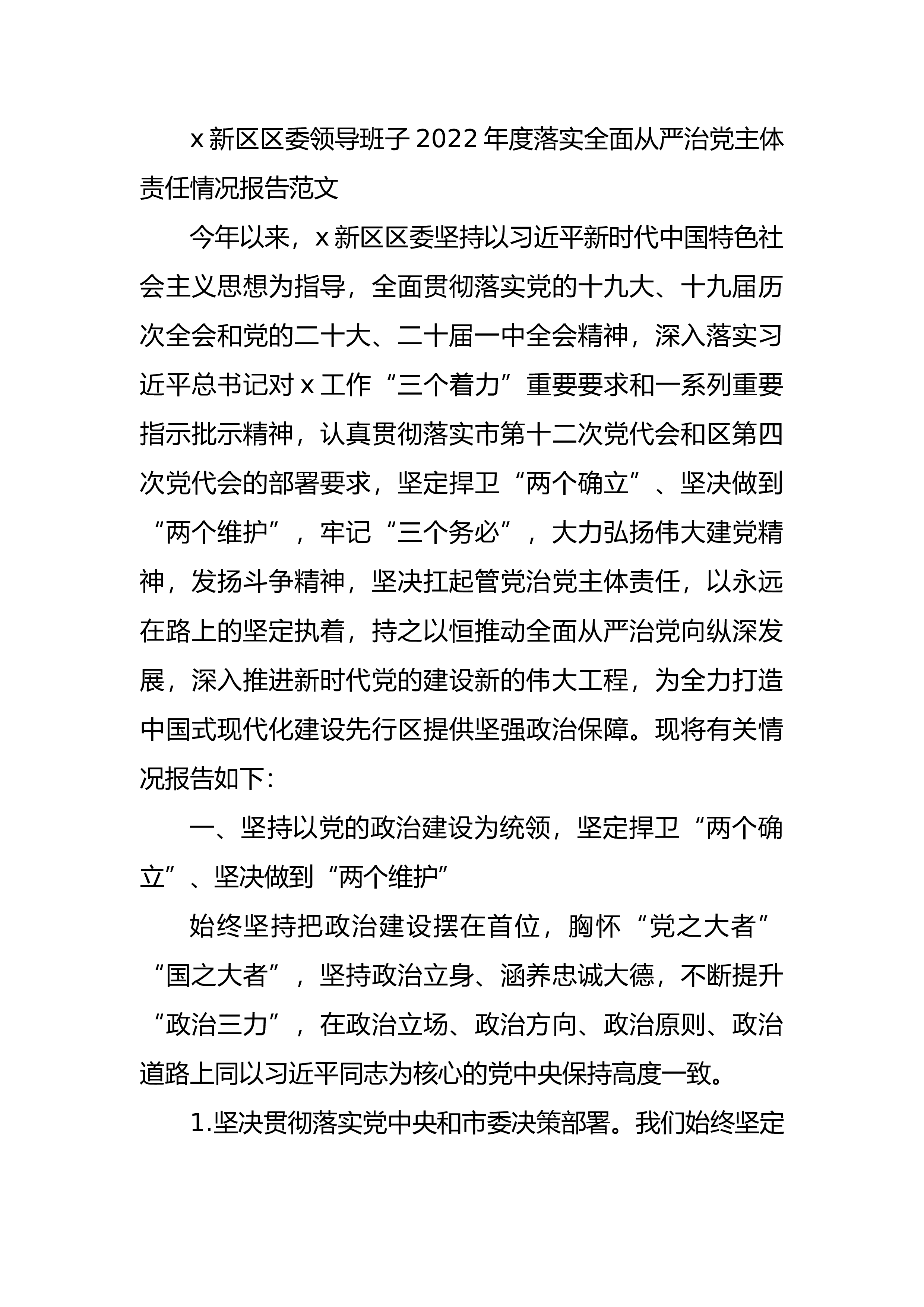 x新区区委领导班子2022年度落实全面从严治党主体责任情况报告范文今年以来,x新区区委坚持以习近平新时代中国特色社会主义思想为指导,全面贯彻落实党的十九大、十九届历次全会和党的二十大、二十届一中全会精神,深入落实习近平总书记对x工作“三个着力”重要要求和一系列重要指示批示精神,认真贯彻落实市第十二次党代会和区第四次党代会的部署要求,坚定捍卫“两个确立”、坚决做到“两个维护”,牢记“三个务必”,大力弘扬伟大建党精神,发扬斗争精神,坚决扛起管党治党主体责任,以永远在路上的坚定执着,持之以恒推动全面从严治党向纵深发展,深入推进新时代党的建设新的伟大工程,为全力打造中国式现代化建设先行区提供坚强政治保...