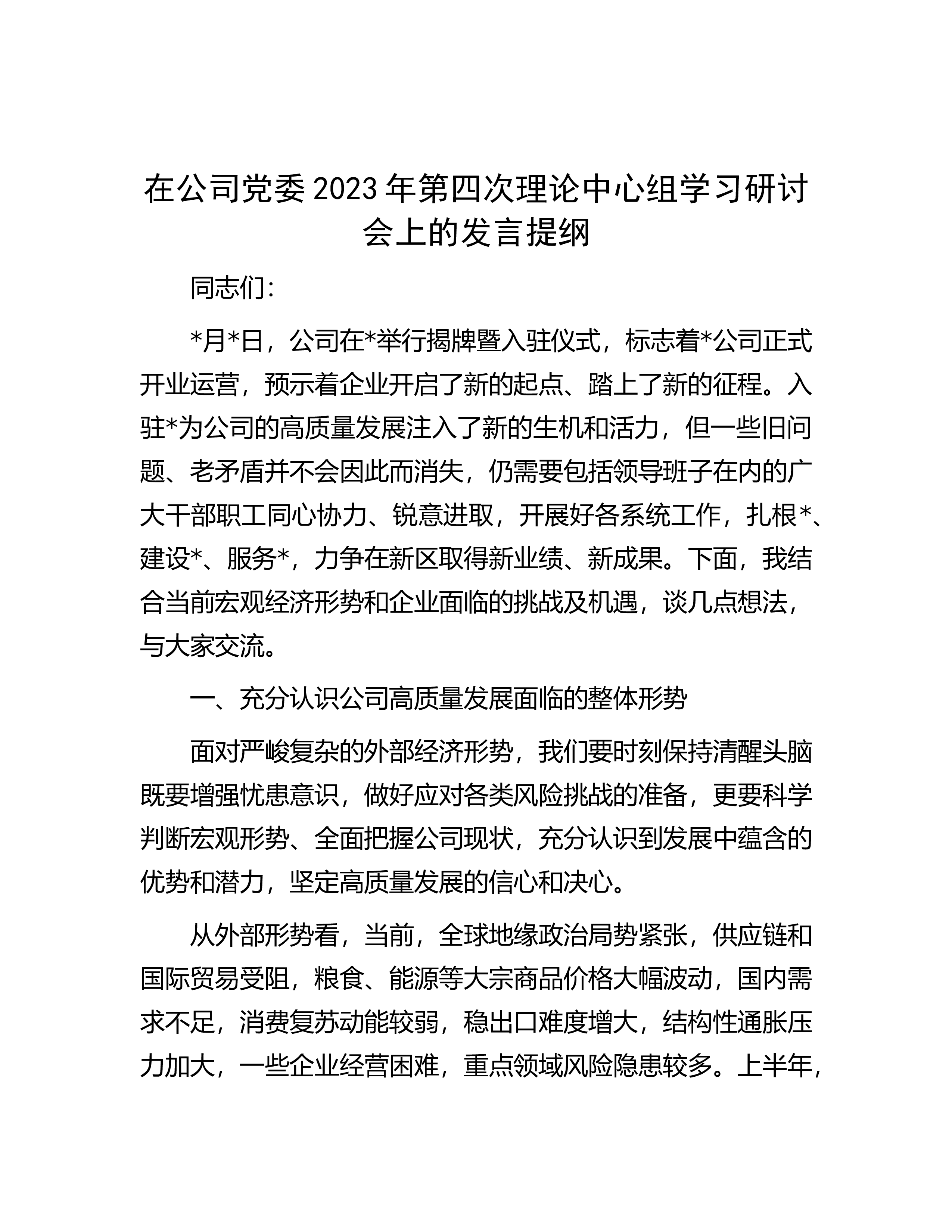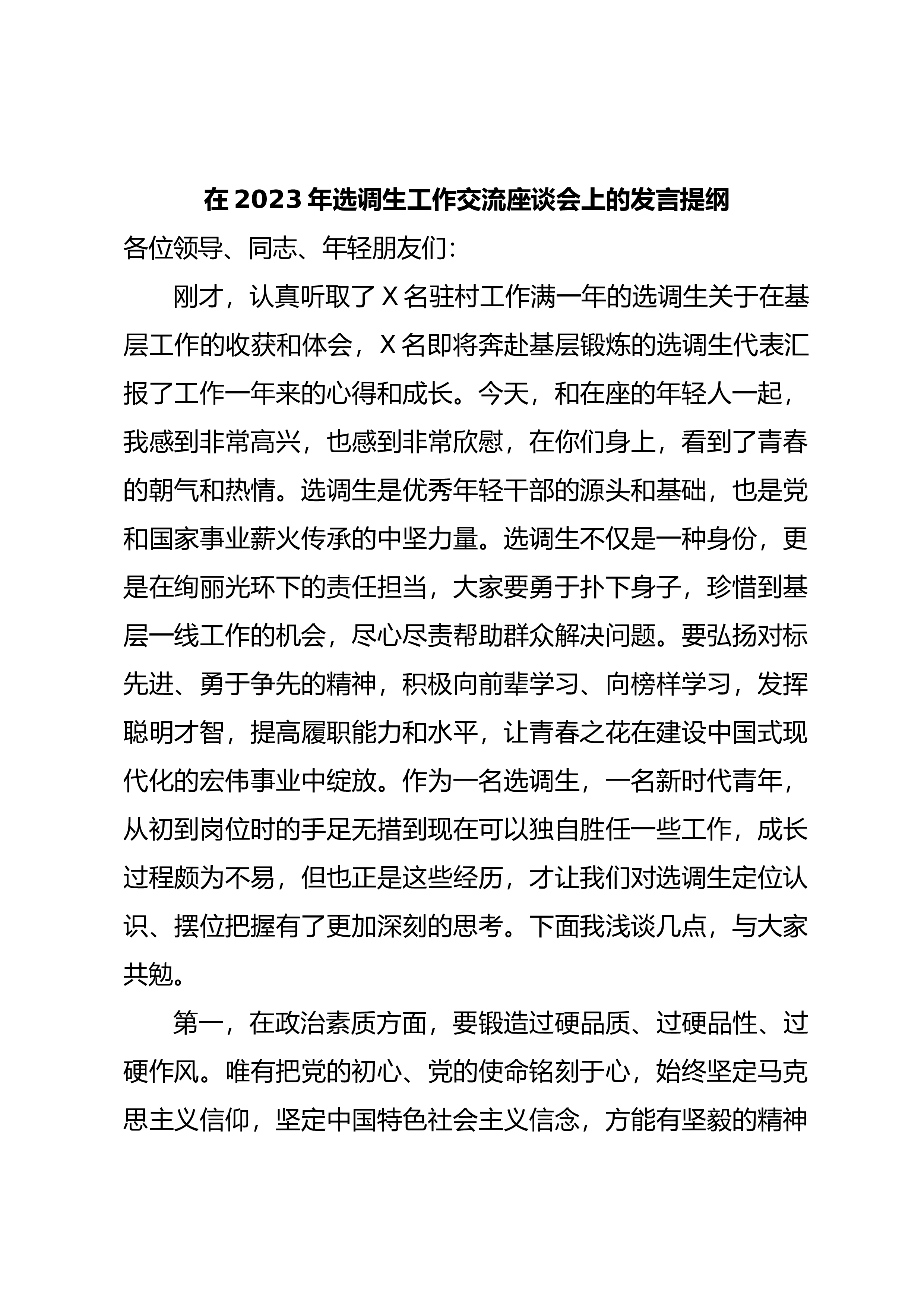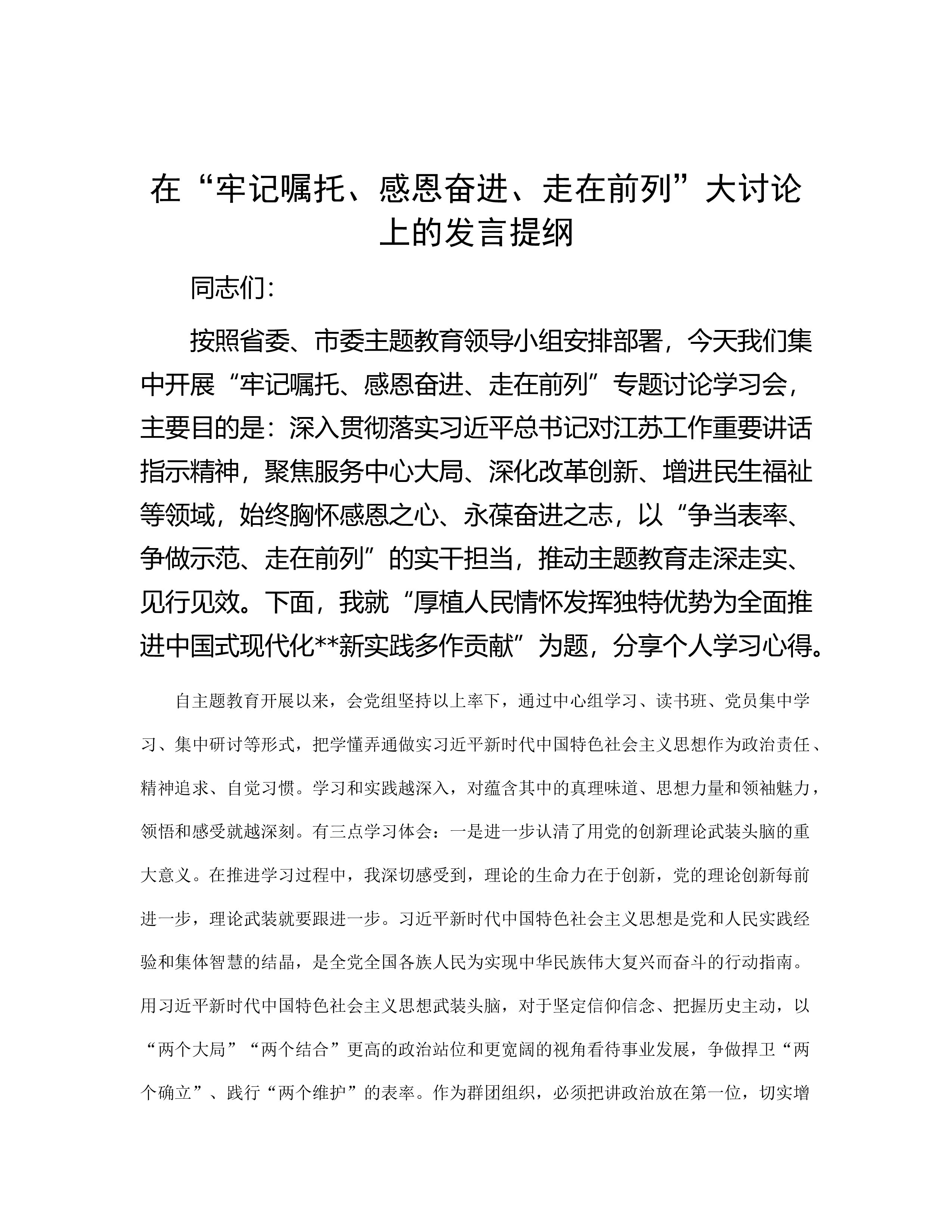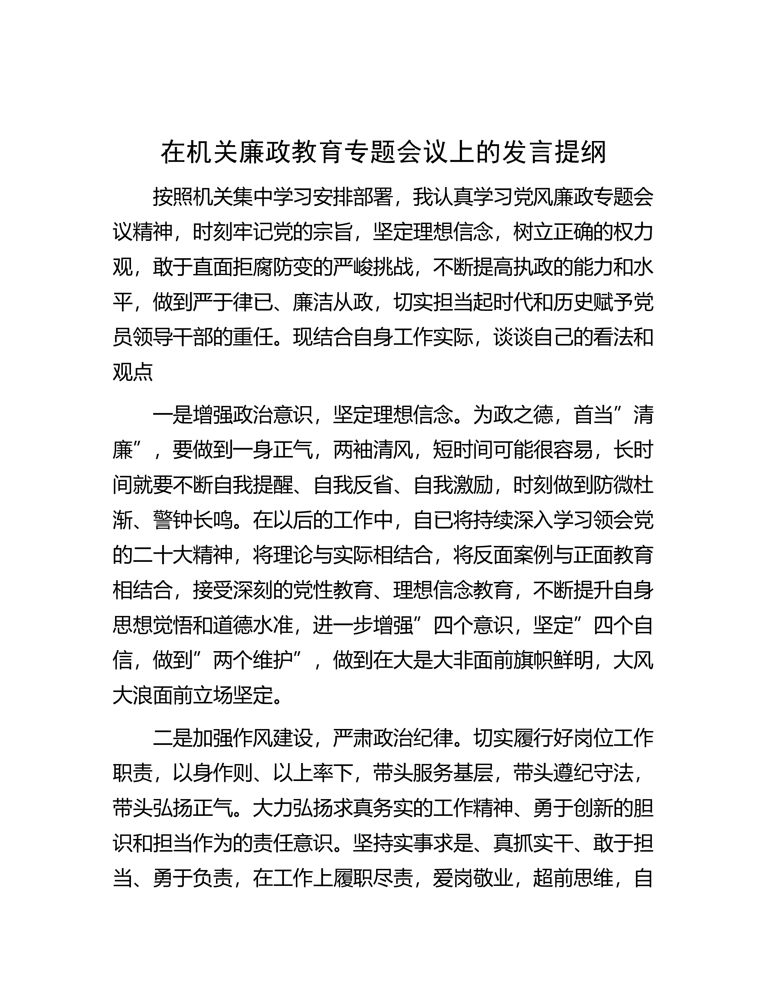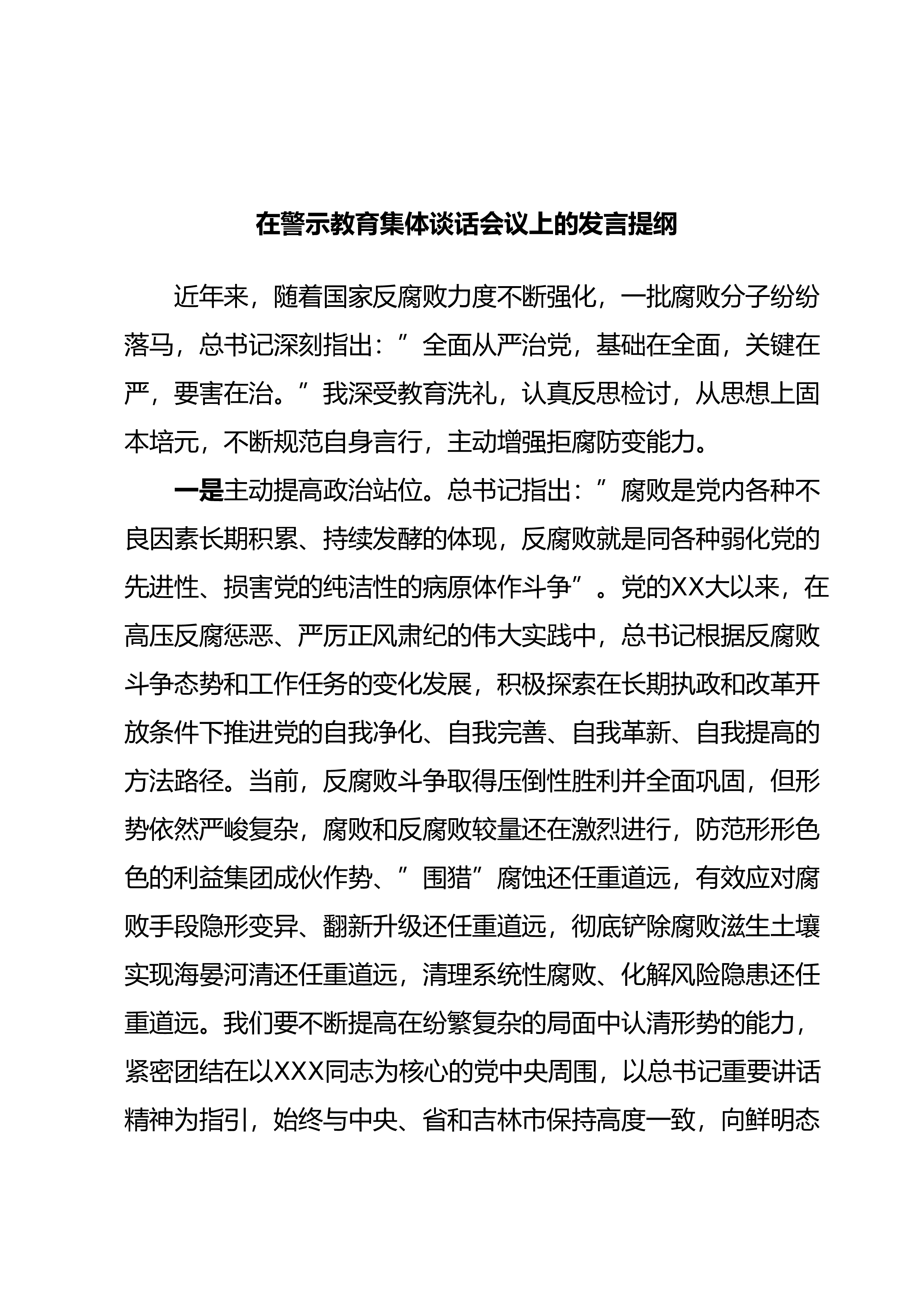 在警示教育集体谈话会议上的发言提纲近年来,随着国家反腐败力度不断强化,一批腐败分子纷纷落马,总书记深刻指出:”全面从严治党,基础在全面,关键在严,要害在治。”我深受教育洗礼,认真反思检讨,从思想上固本培元,不断规范自身言行,主动增强拒腐防变能力。一是主动提高政治站位。总书记指出:”腐败是党内各种不良因素长期积累、持续发酵的体现,反腐败就是同各种弱化党的先进性、损害党的纯洁性的病原体作斗争”。党的XX大以来,在高压反腐惩恶、严厉正风肃纪的伟大实践中,总书记根据反腐败斗争态势和工作任务的变化发展,积极探索在长期执政和改革开放条件下推进党的自我净化、自我完善、自我革新、自我提高的方法路径。当前,反腐...