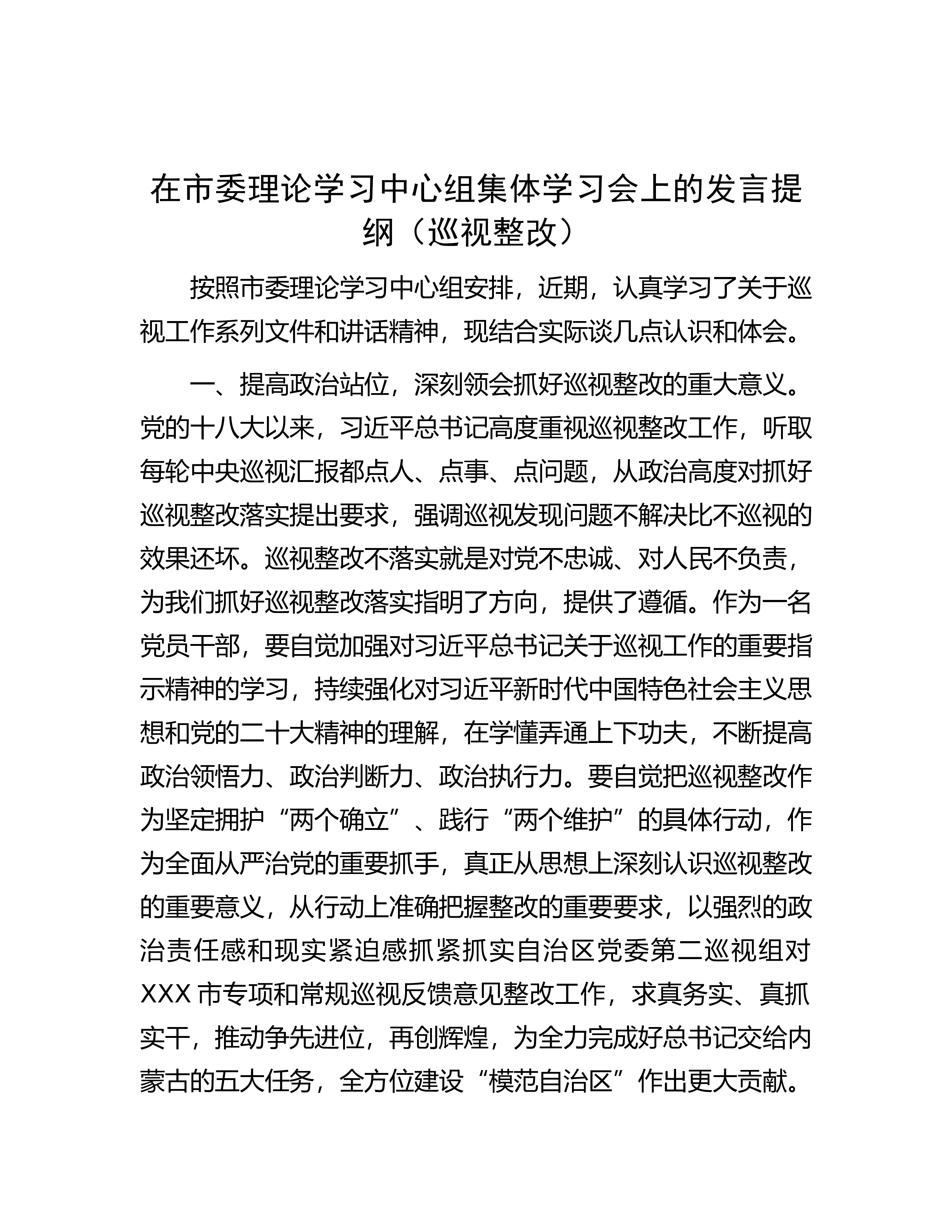 (巡视整改)按照市委理论学习中心组安排,近期,认真学习了关于巡视工作系列文件和讲话精神,现结合实际谈几点认识和体会。一、提高政治站位,深刻领会抓好巡视整改的重大意义。党的十八大以来,习近平总书记高度重视巡视整改工作,听取每轮中央巡视汇报都点人、点事、点问题,从政治高度对抓好巡视整改落实提出要求,强调巡视发现问题不解决比不巡视的效果还坏。巡视整改不落实就是对党不忠诚、对人民不负责,为我们抓好巡视整改落实指明了方向,提供了遵循。作为一名党员干部,要自觉加强对习近平总书记关于巡视工作的重要指示精神的学习,持续强化对习近平新时代中国特色社会主义思想和党的二十大...