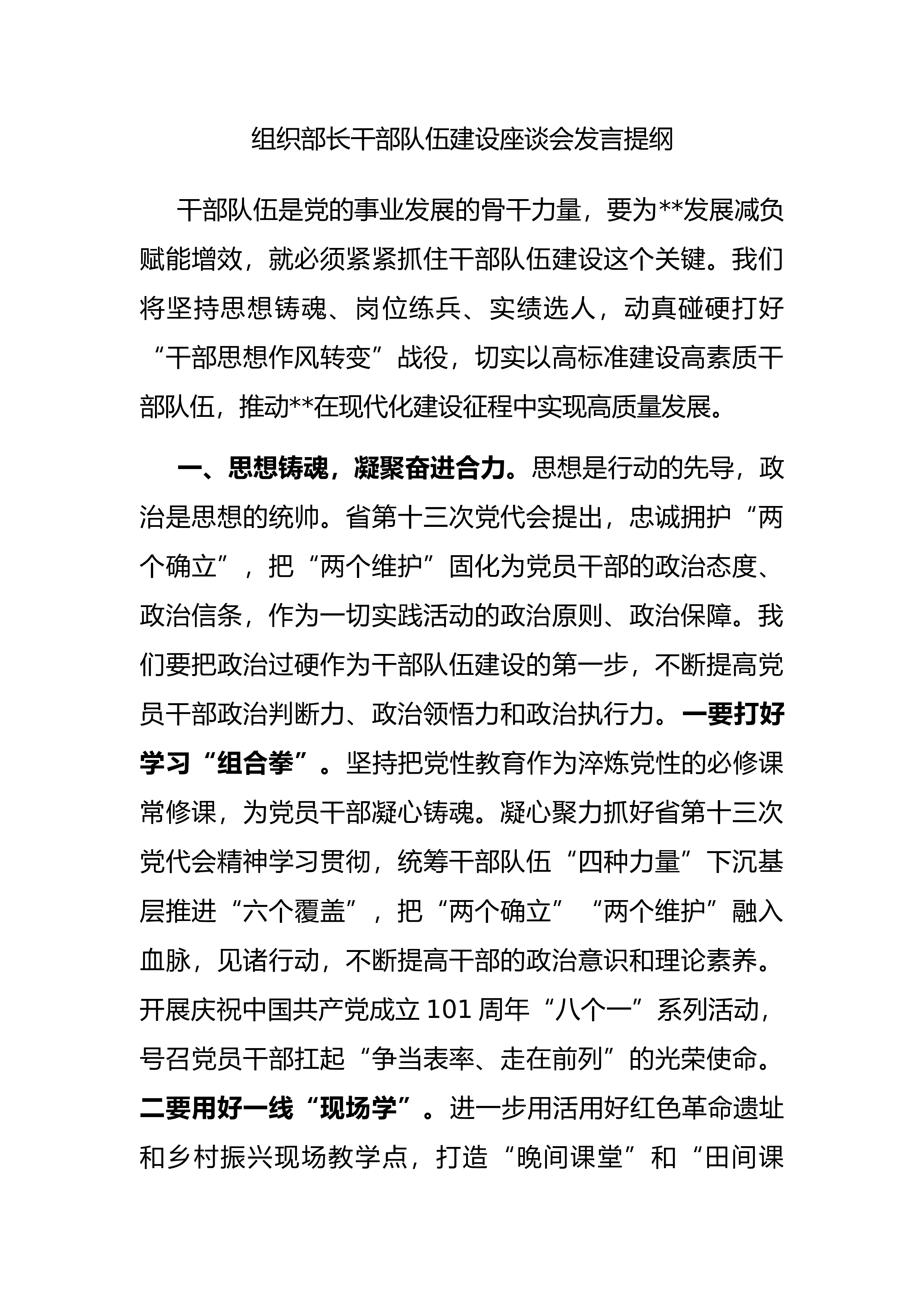 干部队伍是党的事业发展的骨干力量,要为**发展减负赋能增效,就必须紧紧抓住干部队伍建设这个关键。我们将坚持思想铸魂、岗位练兵、实绩选人,动真碰硬打好“干部思想作风转变”战役,切实以高标准建设高素质干部队伍,推动**在现代化建设征程中实现高质量发展。一、思想铸魂,凝聚奋进合力。思想是行动的先导,政治是思想的统帅。省第十三次党代会提出,忠诚拥护“两个确立”,把“两个维护”固化为党员干部的政治态度、政治信条,作为一切实践活动的政治原则、政治保障。我们要把政治过硬作为干部队伍建设的第一步,不断提高党员干部政治判断力、政治领悟力和政治执行力。一要打好学习“组合拳”。坚持...